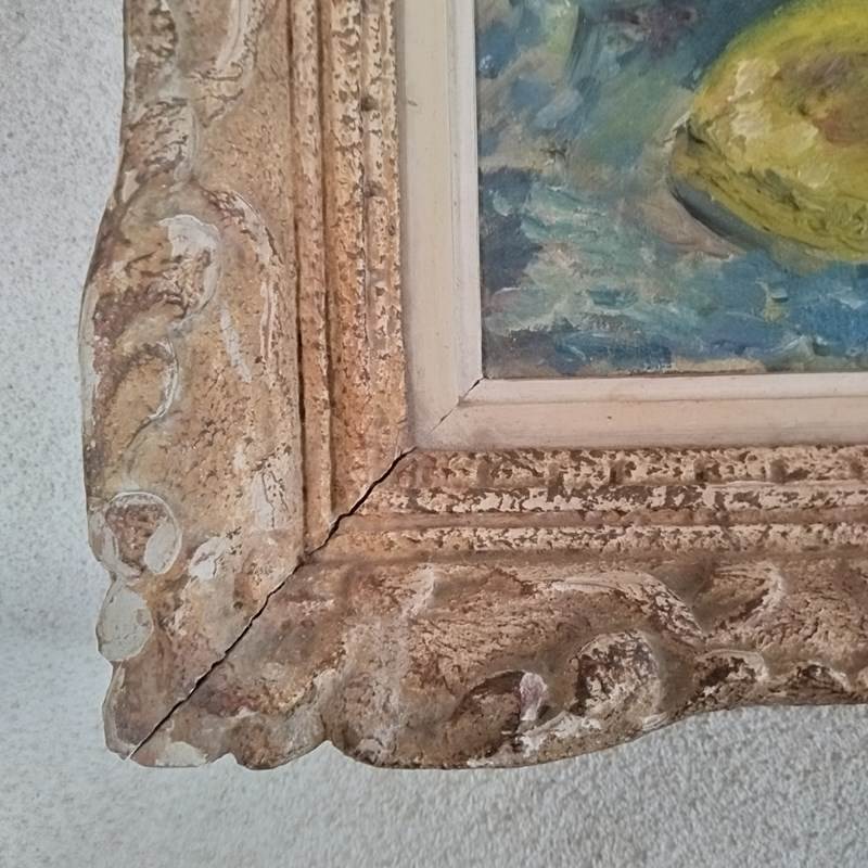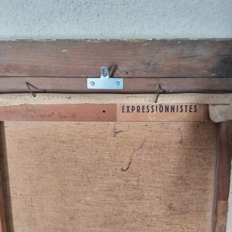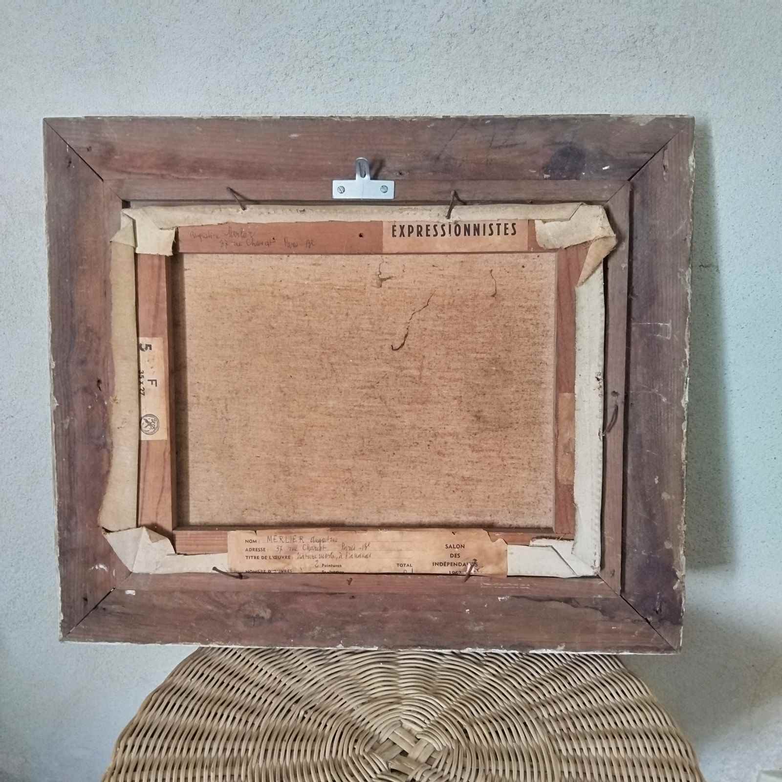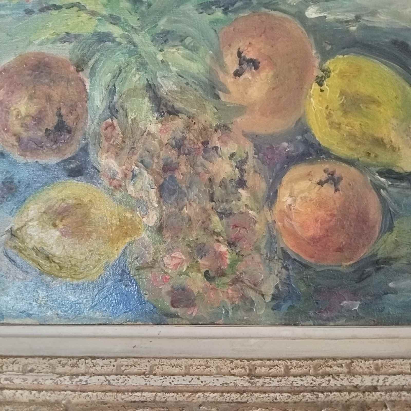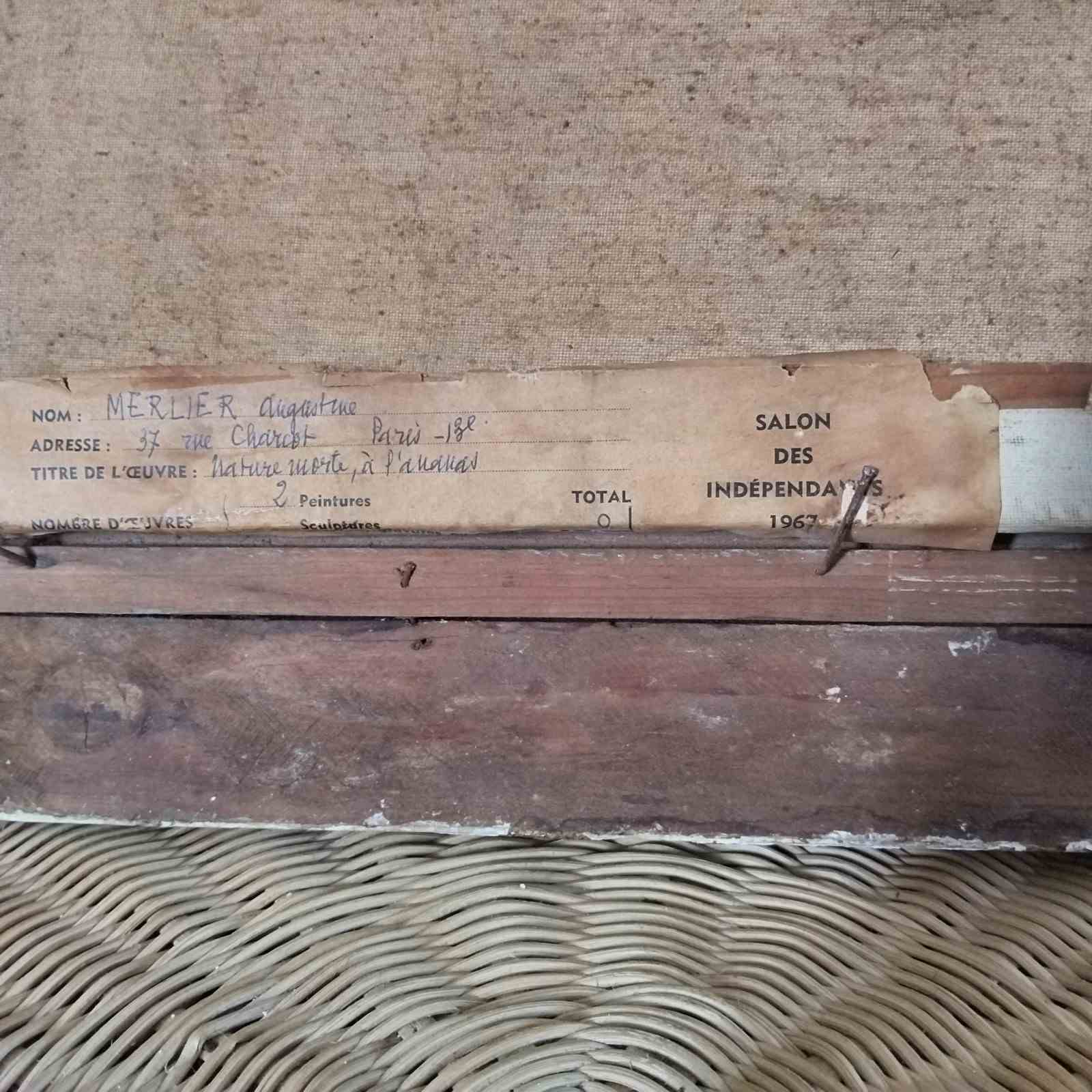 A good expressionist painting by French artist Augustine Merlier, possibly from the 1950's. Showing expressive brushstrokes and good use of colour, the painting is titled as "Still life with pineapple". It was entered into an exhibition of independent artists "Salon des Independantes" in Paris in 1967, and depicts citrus fruits and a pineapple, on a blue background. With its original Montparnasse frame, and complete with its exhibition past on the reverse side of the painting. A good sized painting with a bold frame which is sized 48cm x 41cm inc frame.
