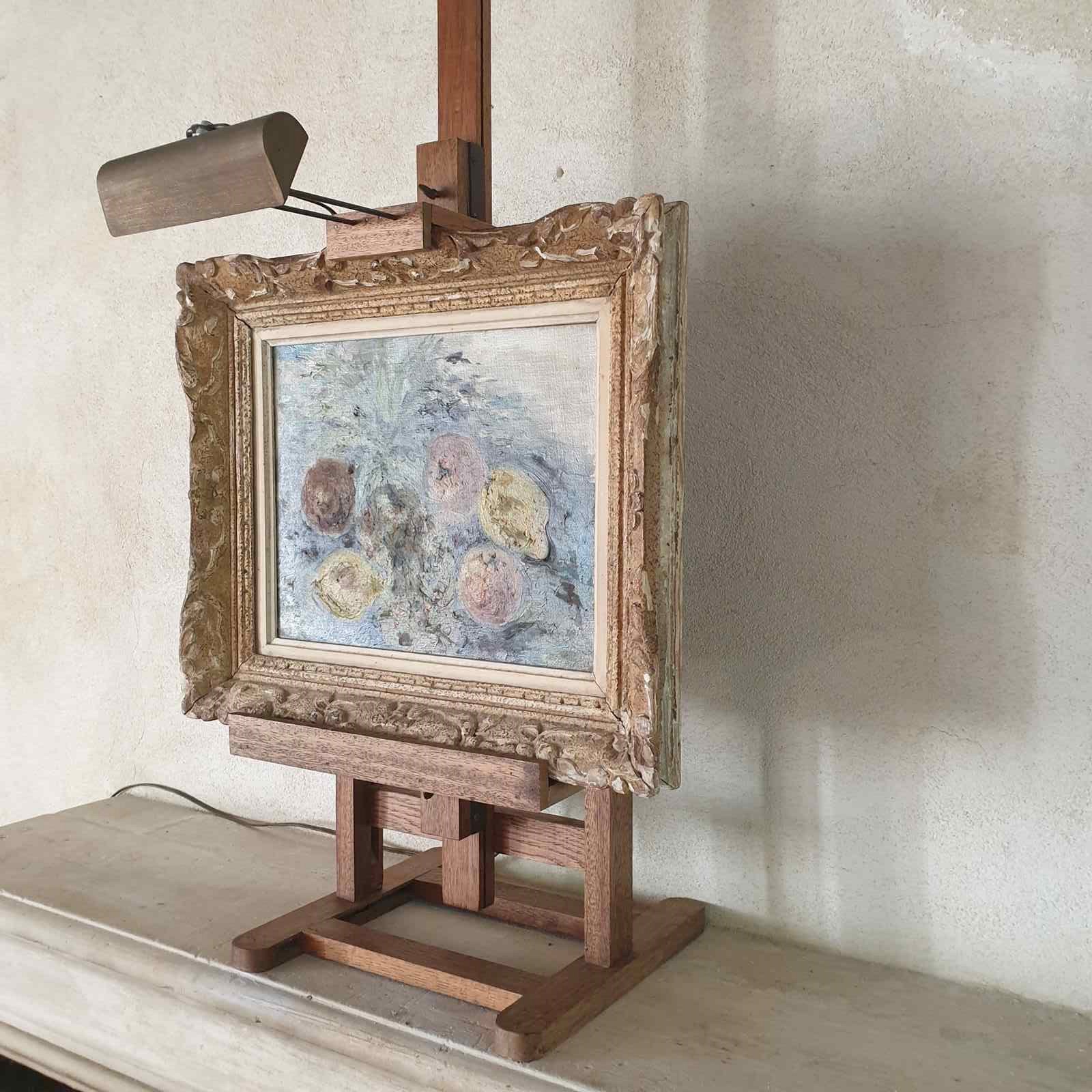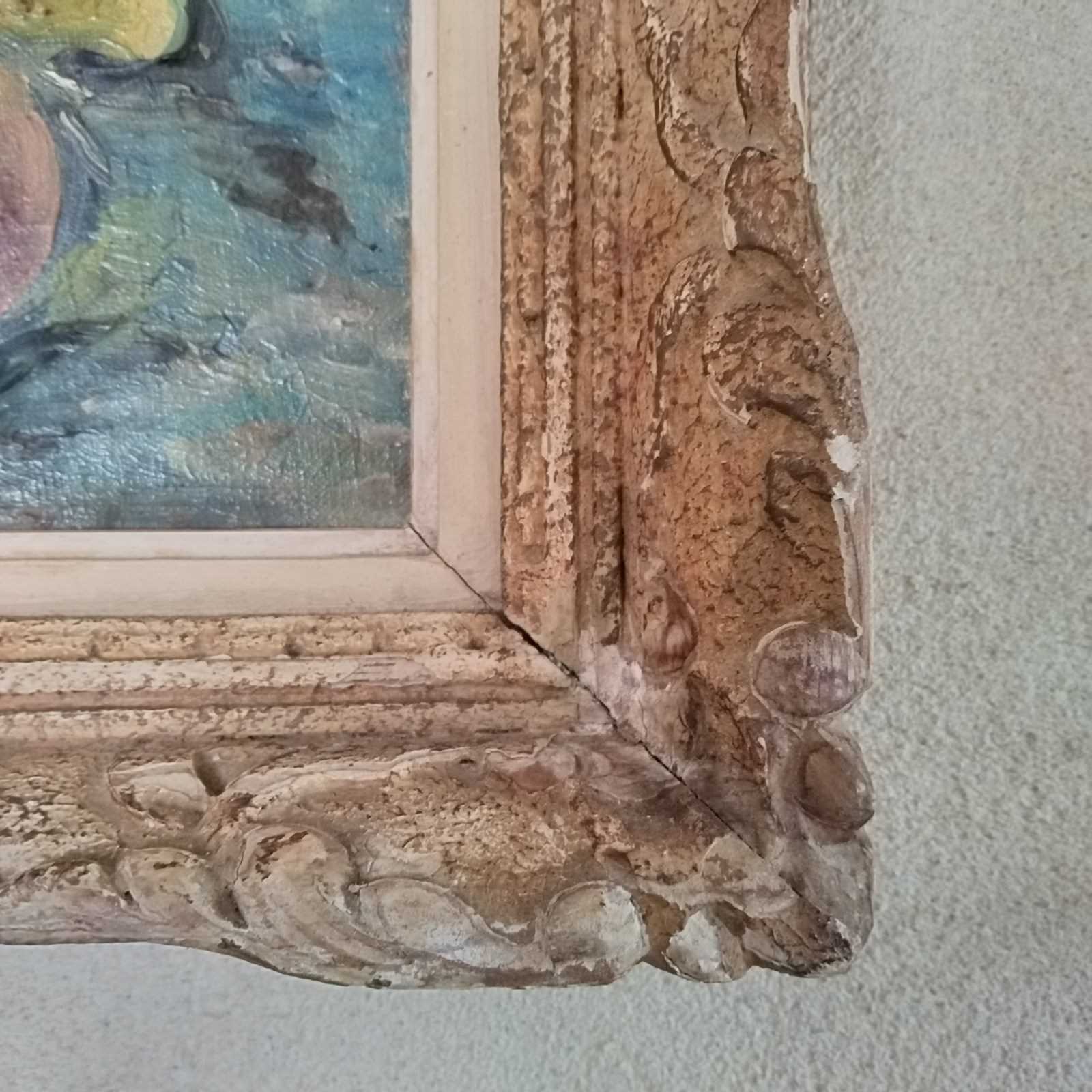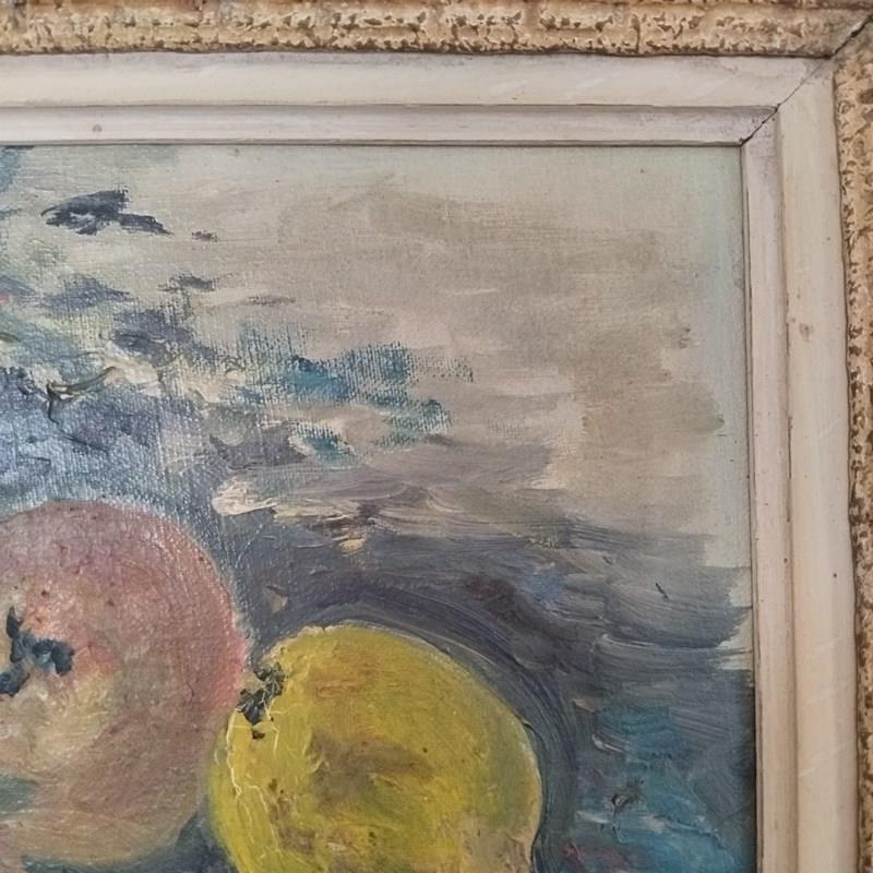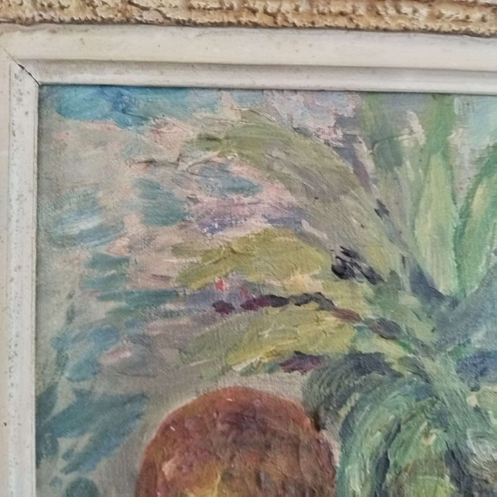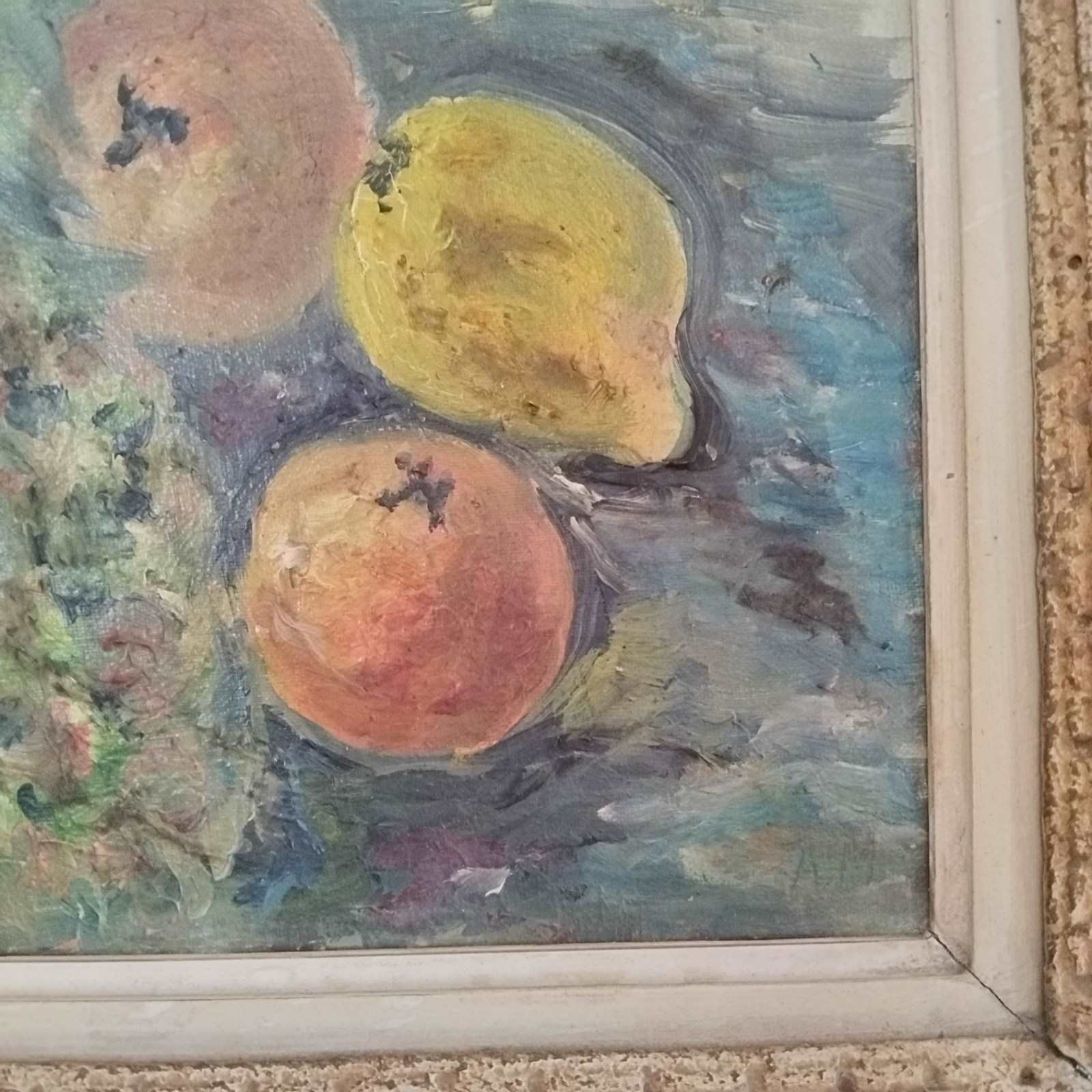 A good expressionist painting by French artist Augustine Merlier, possibly from the 1950's. Showing expressive brushstrokes and good use of colour, the painting is titled as "Still life with pineapple". It was entered into an exhibition of independent artists "Salon des Independantes" in Paris in 1967, and depicts citrus fruits and a pineapple, on a blue background. With its original Montparnasse frame, and complete with its exhibition past on the reverse side of the painting. A good sized painting with a bold frame which is sized 48cm x 41cm inc frame.