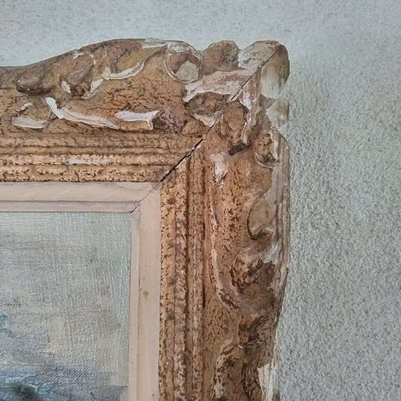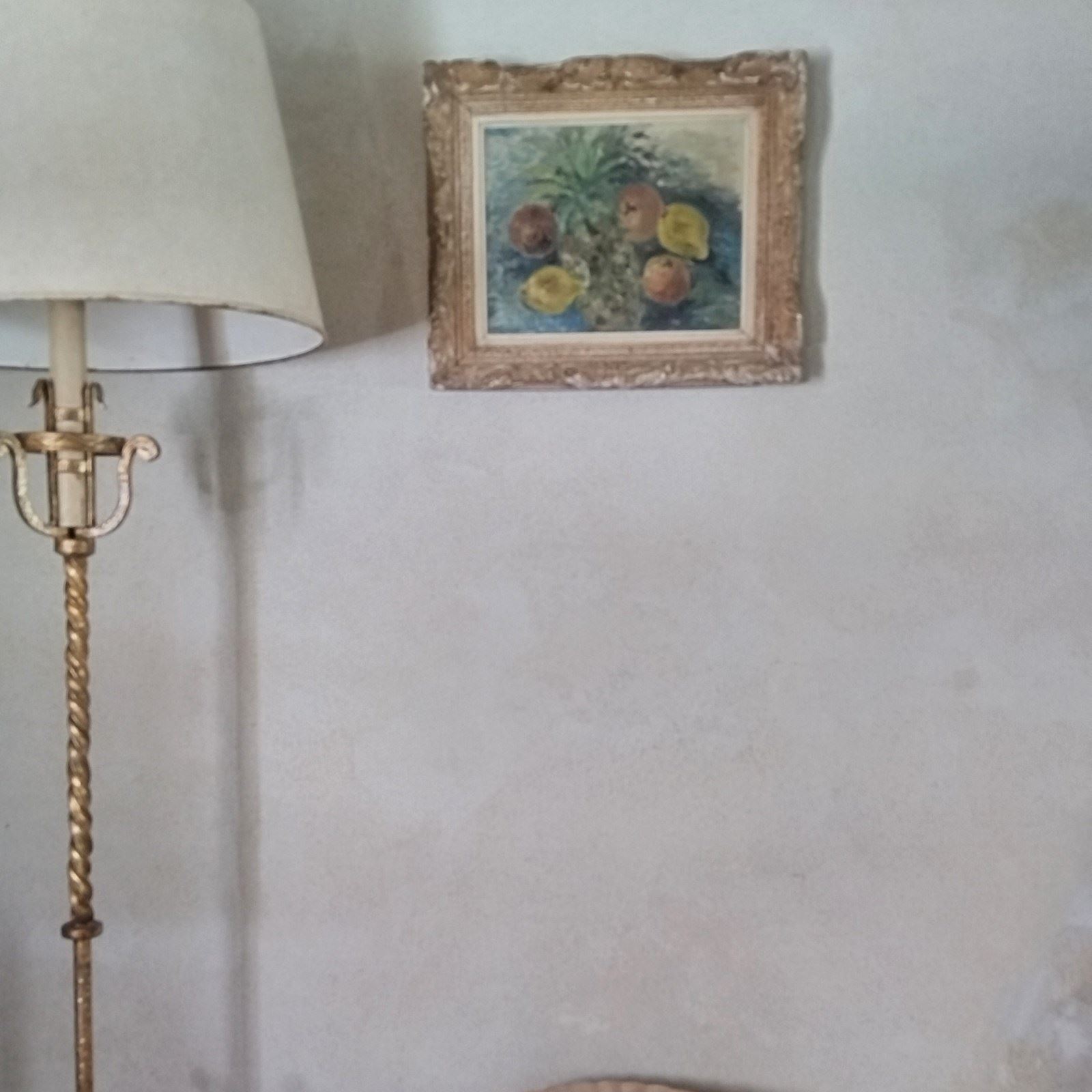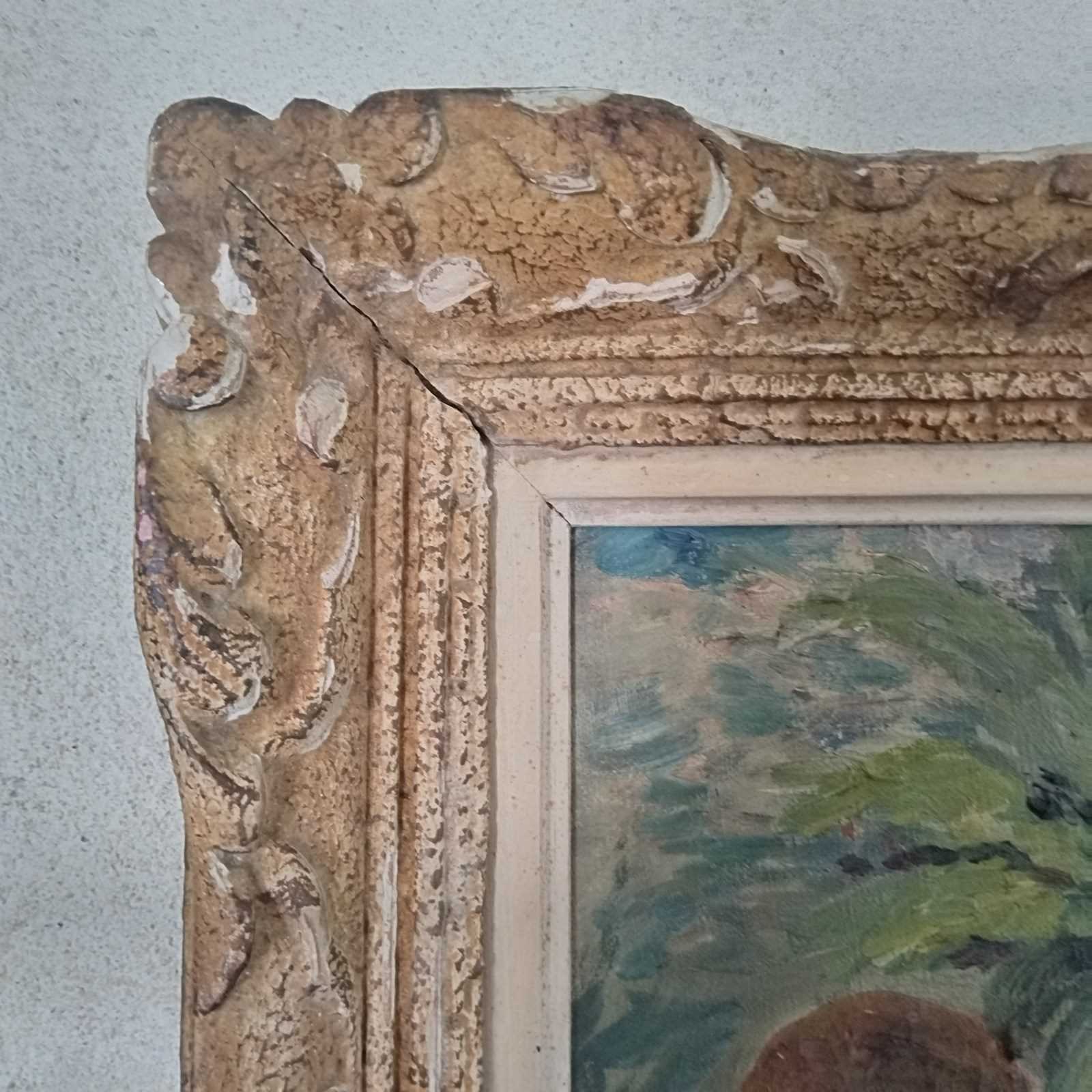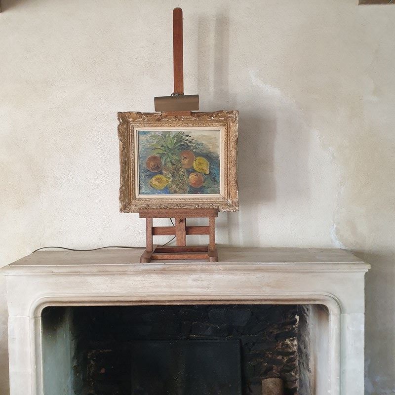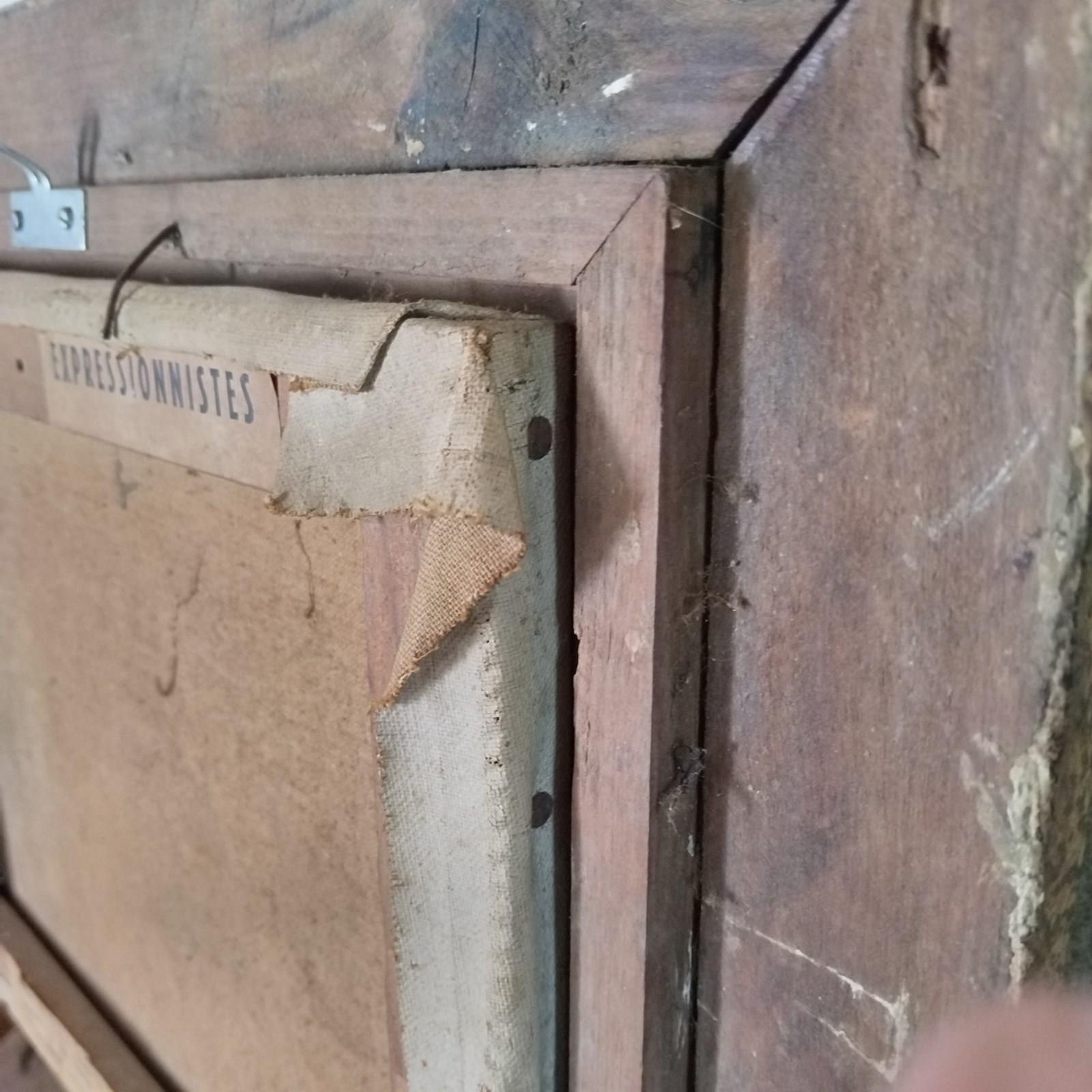 A good expressionist painting by French artist Augustine Merlier, possibly from the 1950's. Showing expressive brushstrokes and good use of colour, the painting is titled as "Still life with pineapple". It was entered into an exhibition of independent artists "Salon des Independantes" in Paris in 1967, and depicts citrus fruits and a pineapple, on a blue background. With its original Montparnasse frame, and complete with its exhibition past on the reverse side of the painting. A good sized painting with a bold frame which is sized 48cm x 41cm inc frame.