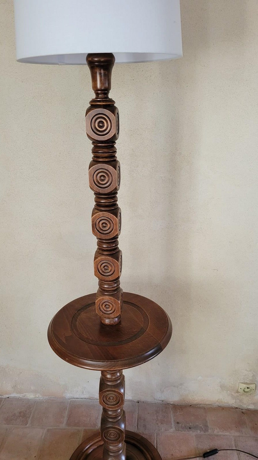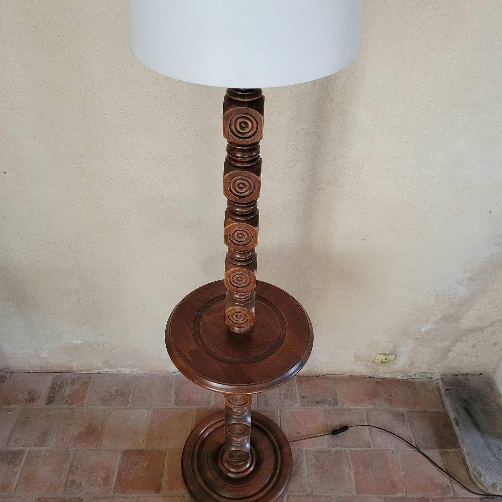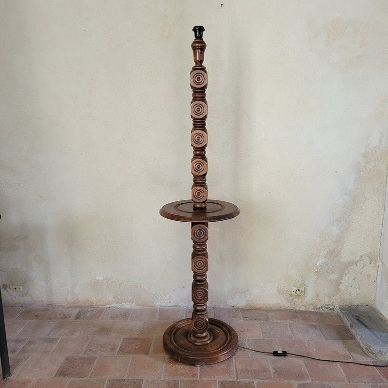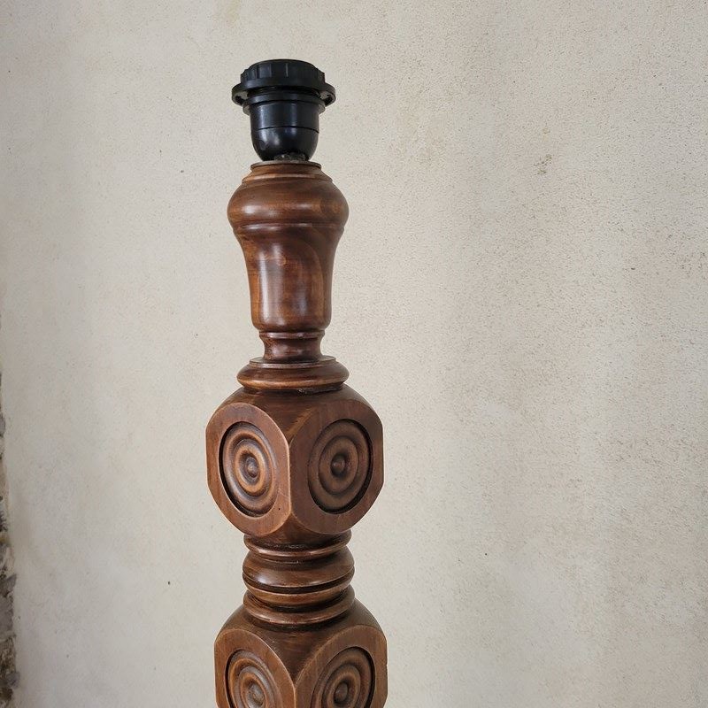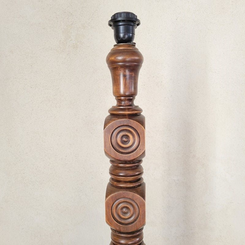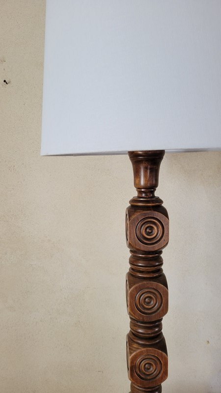 A very stylish French floor lamp dating from the 1960's. Made from oak, with wonderful carved geometric motifs making up the pedestal, and with a turned mid table and base. Sold without shade, in full working order. Height to fitting 140cm