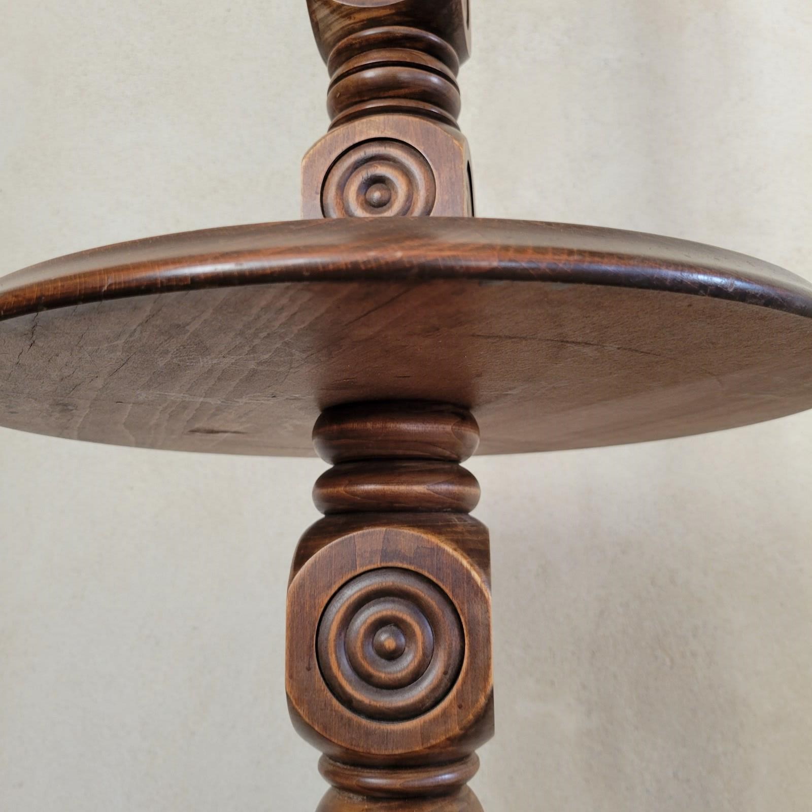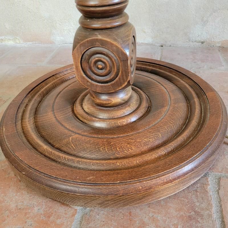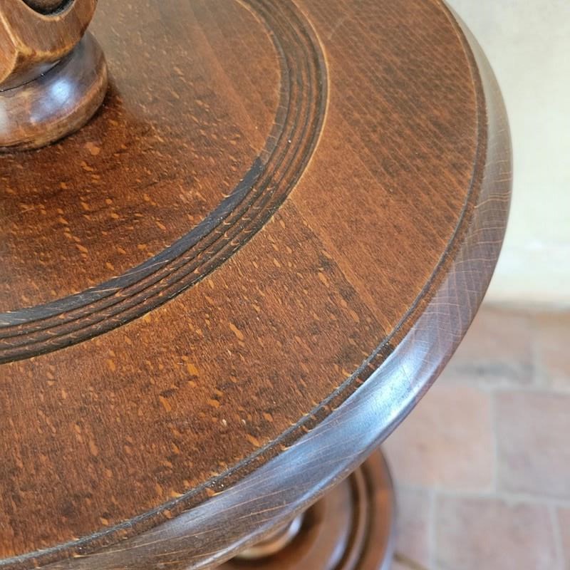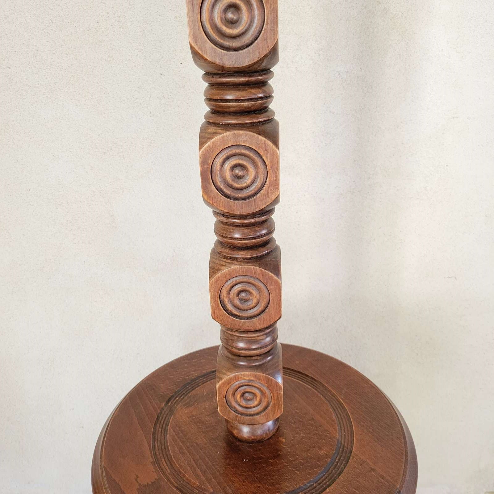 A very stylish French floor lamp dating from the 1960's. Made from oak, with wonderful carved geometric motifs making up the pedestal, and with a turned mid table and base. Sold without shade, in full working order. Height to fitting 140cm
