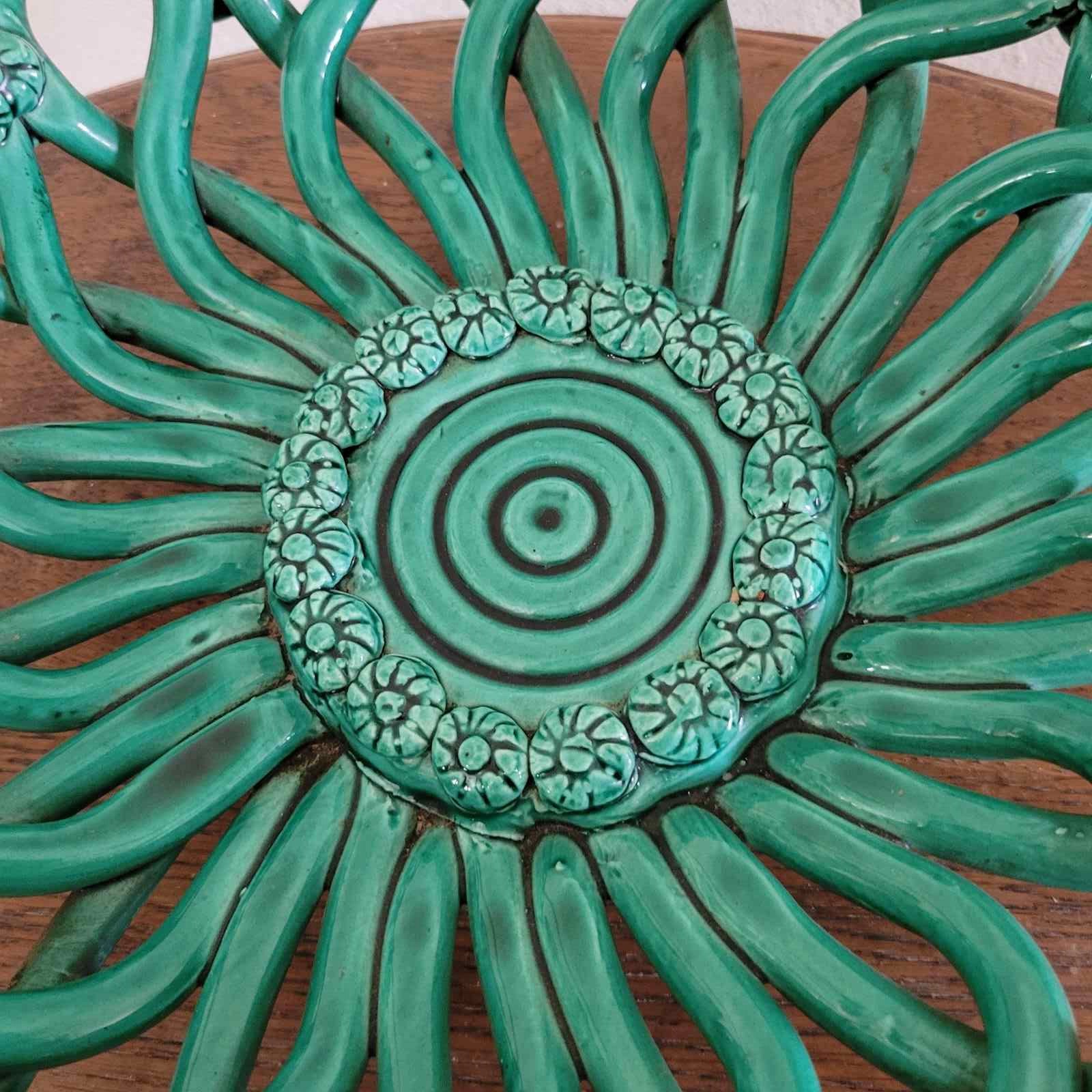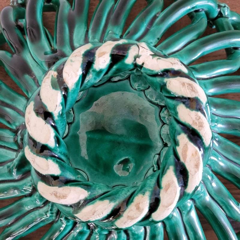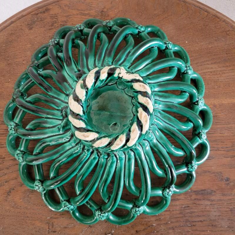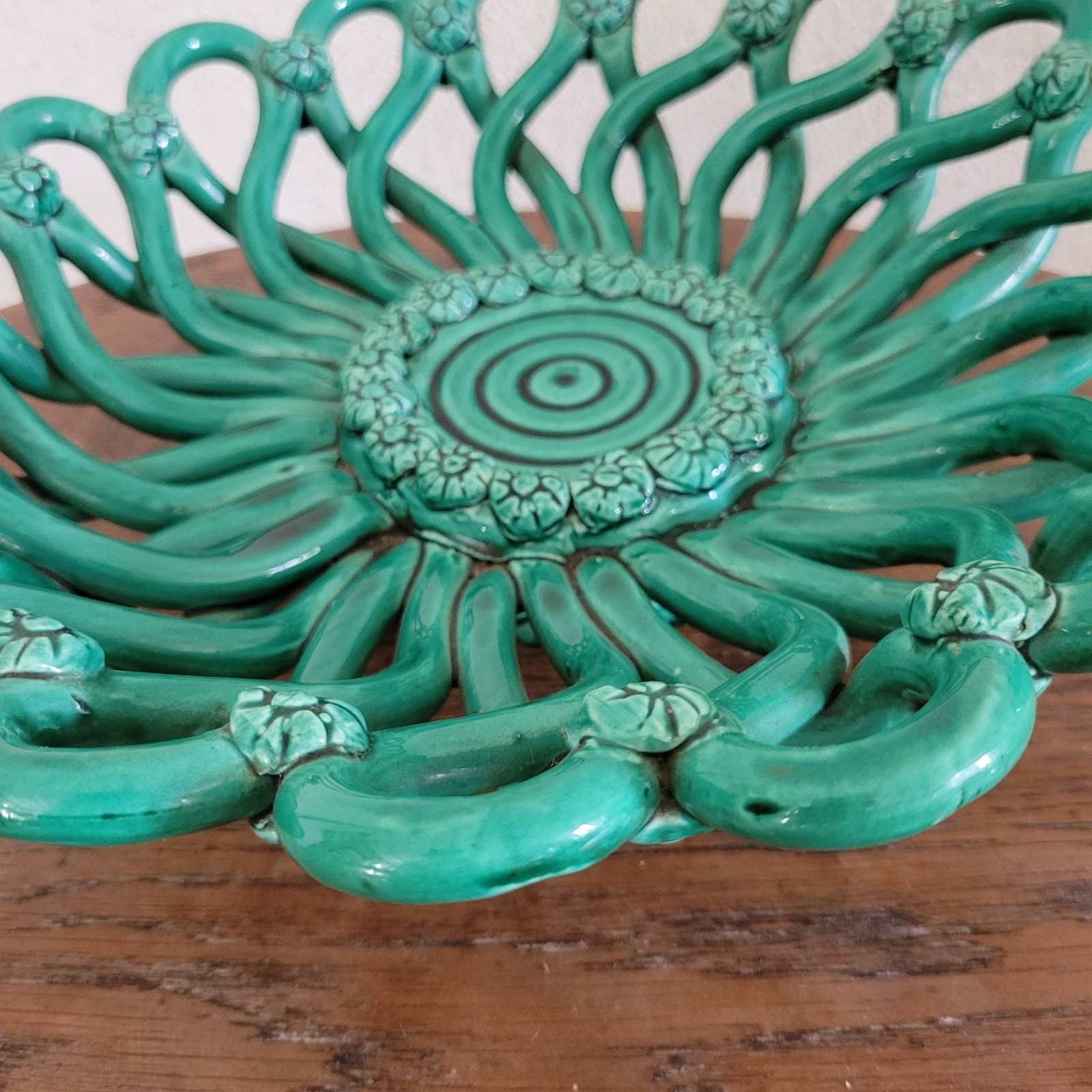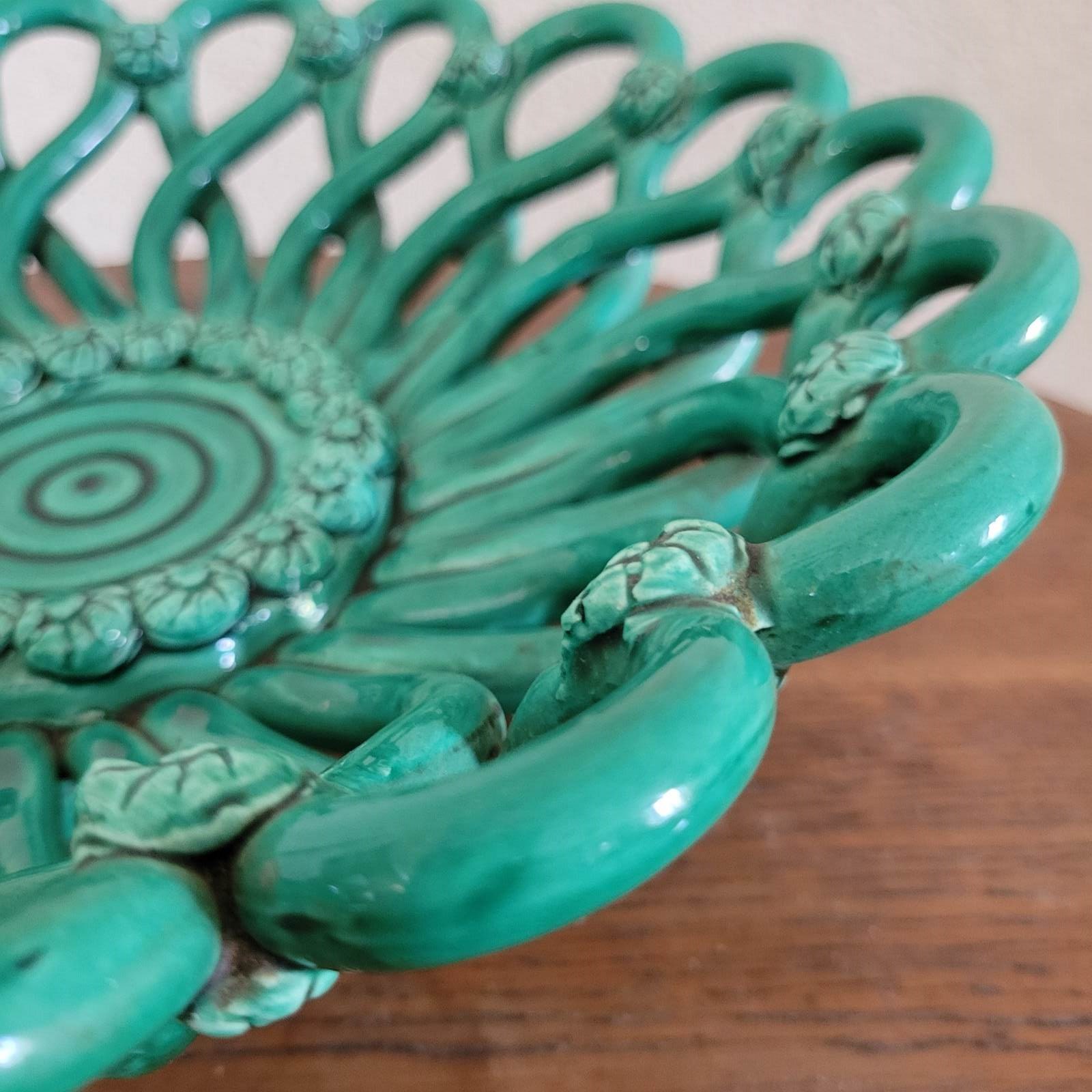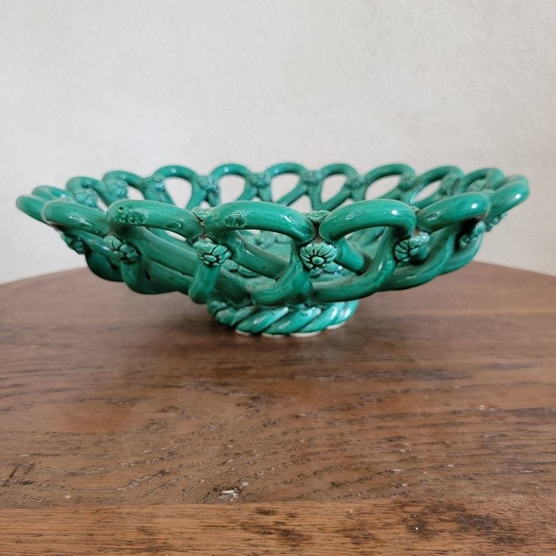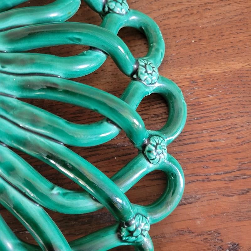 A gorgeous French ceramic fruit basket from the mid century. Made by master craftsmen in the pottery village of Vallauris, celebrated for its collaboration with Picasso. This is made entirely by hand, with a superb vibrant green glaze and subtle detailing. Condition is excellent with no knocks or chips. A beautiful item for any room. Size 33 x 9 cm