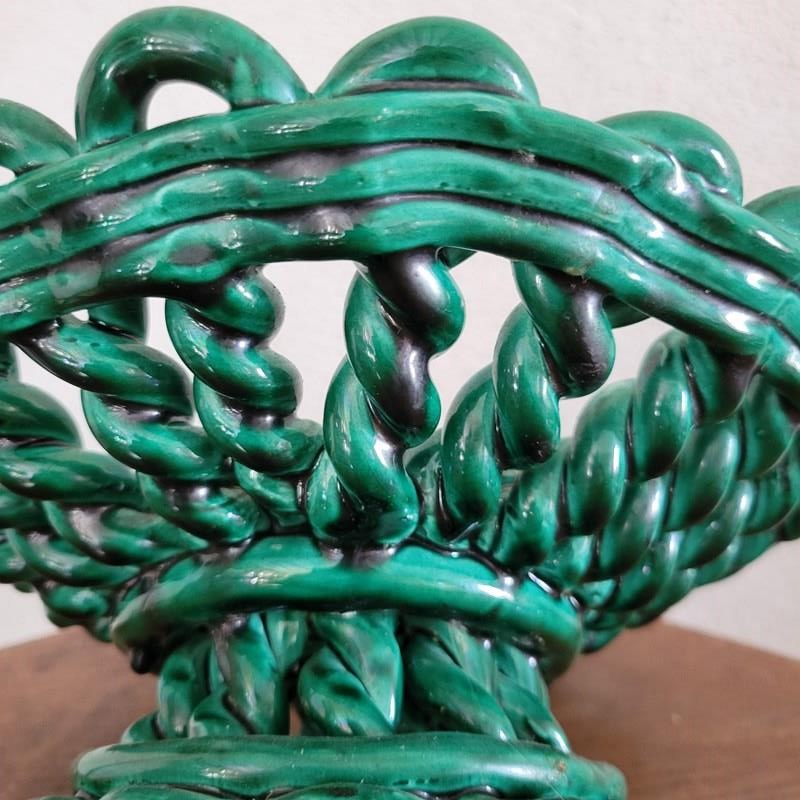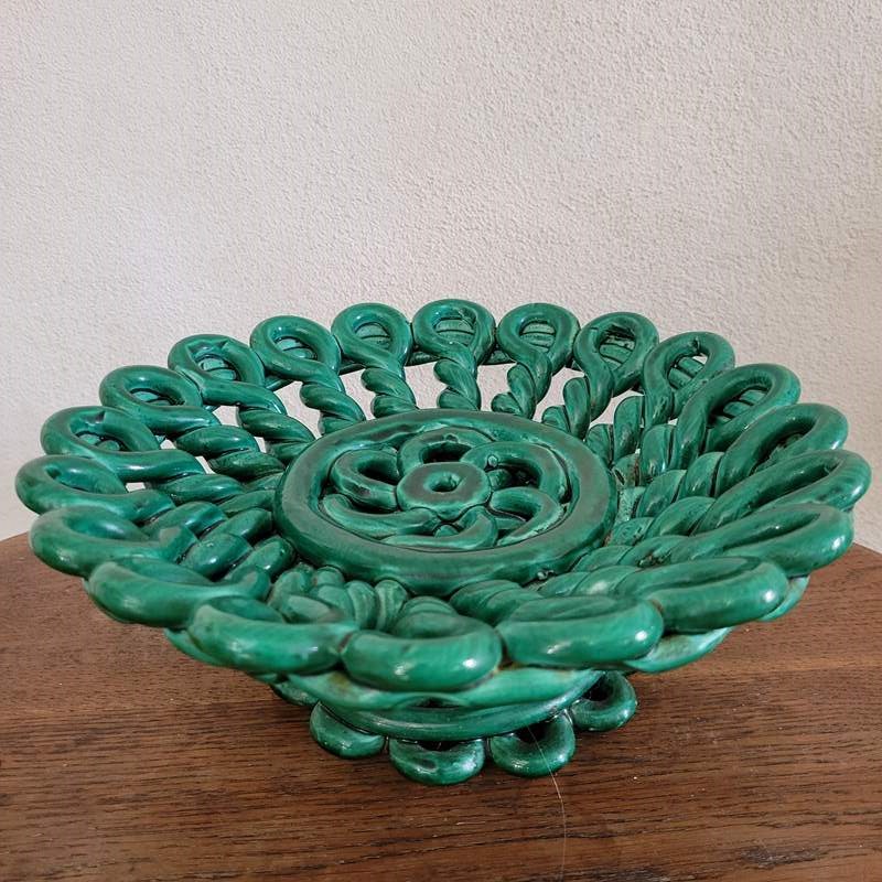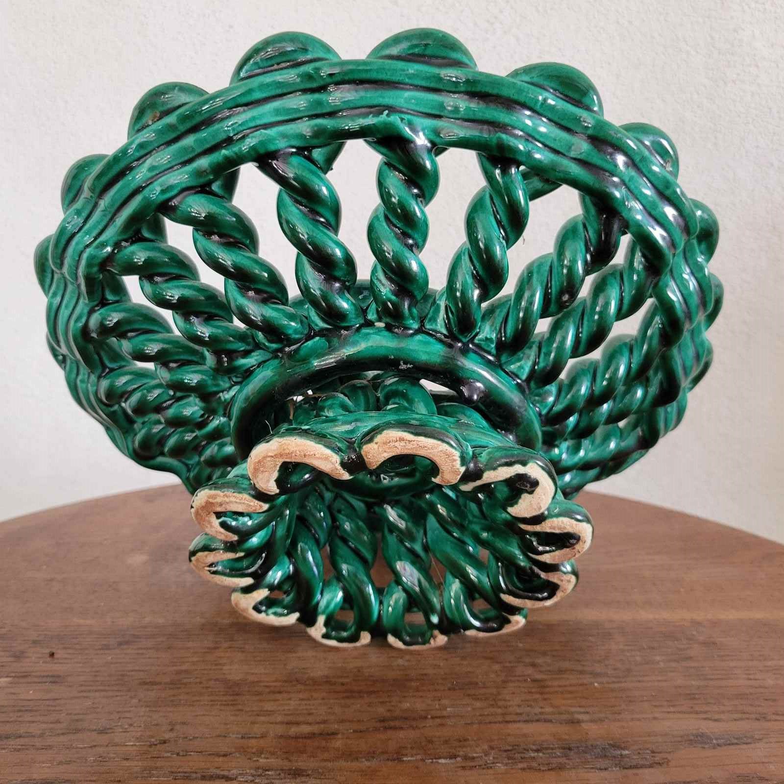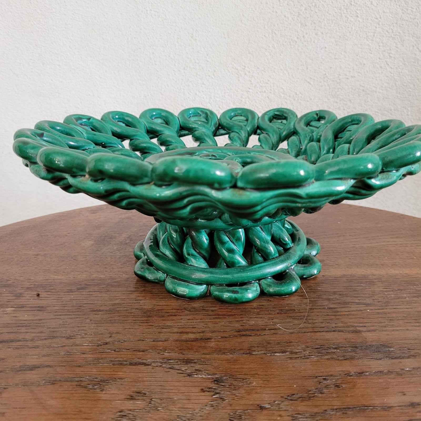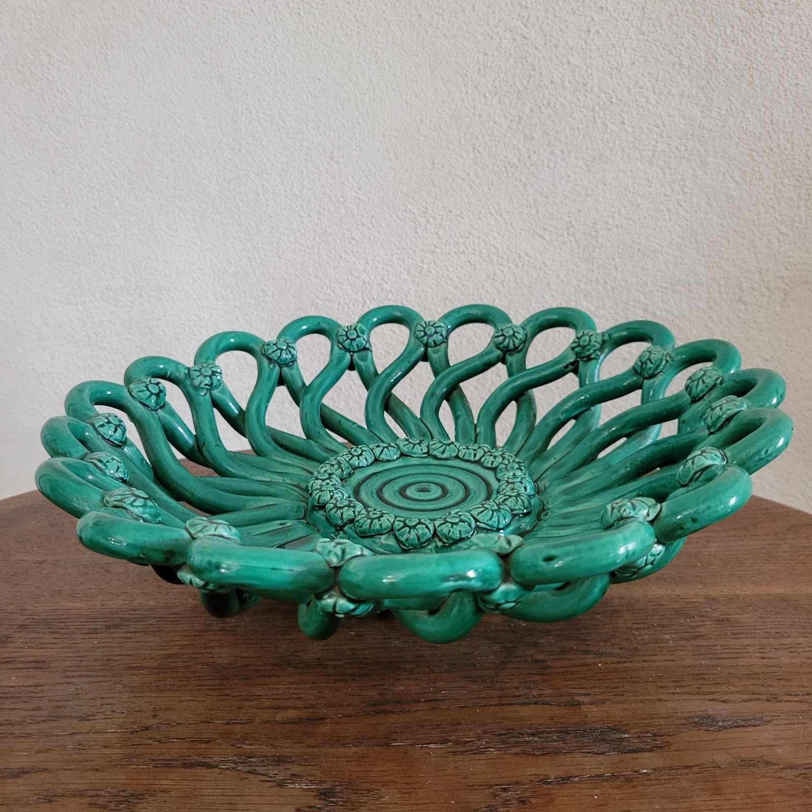 A gorgeous French ceramic fruit basket from the mid century. Made it master craftsmen in the pottery village of Vallauris, in the south of France, famous for its collaboration with Picasso. This is made entirely by hand, with a fabulous glaze and colour. Condition is excellent with no cracks or chips. This is a beautiful decorative piece for any room. Size 38 x11cm