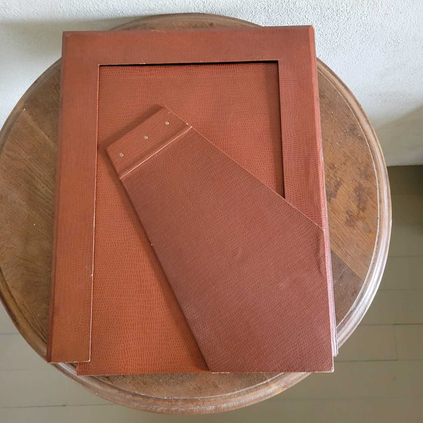 With lovely detailing and some slight foxing, adding to the authenticity of the item, this larger sized frame is backed in faux lizard, with a fold out table stand. Size 50 x 40cm