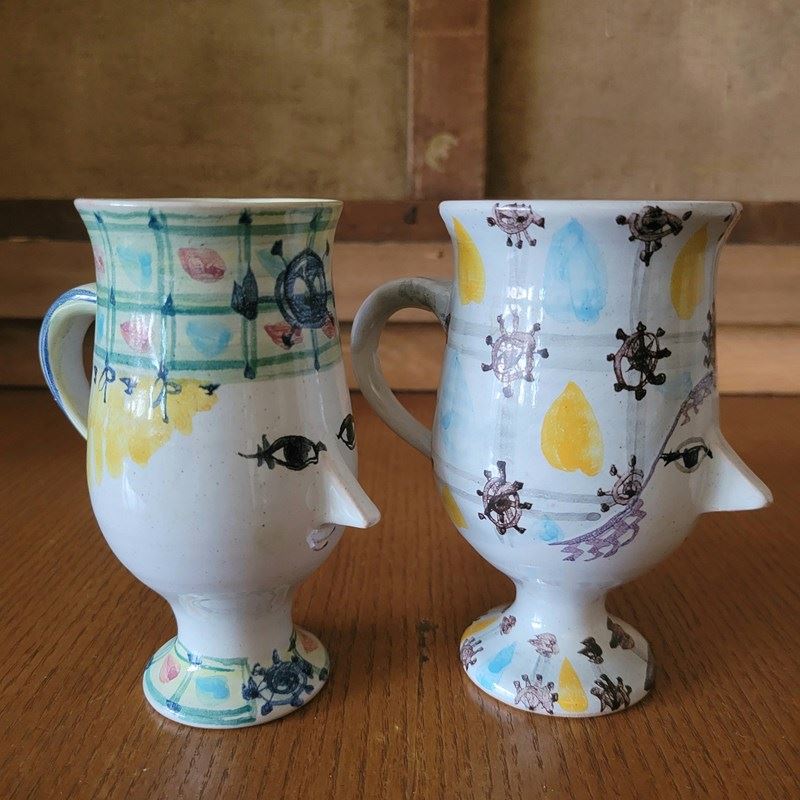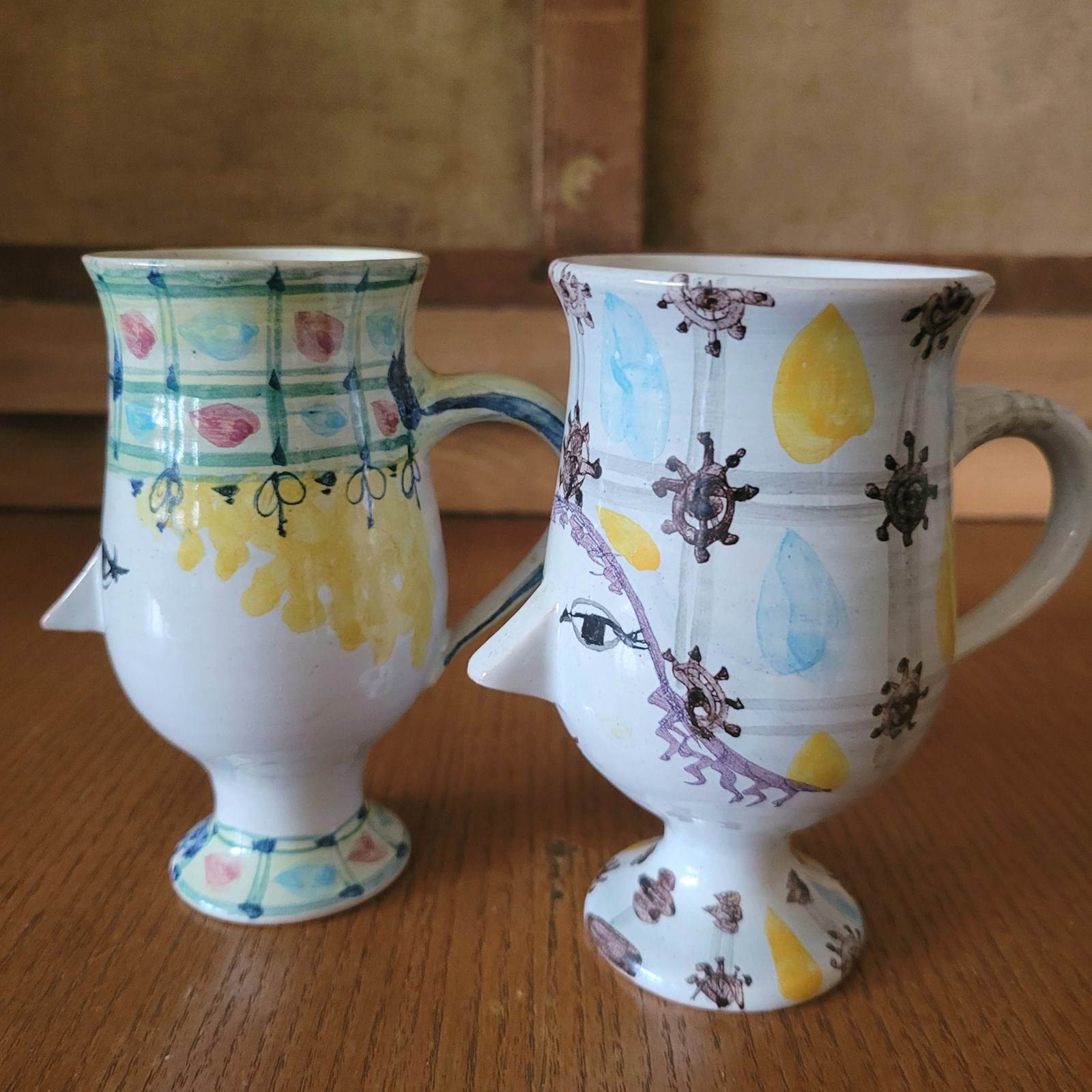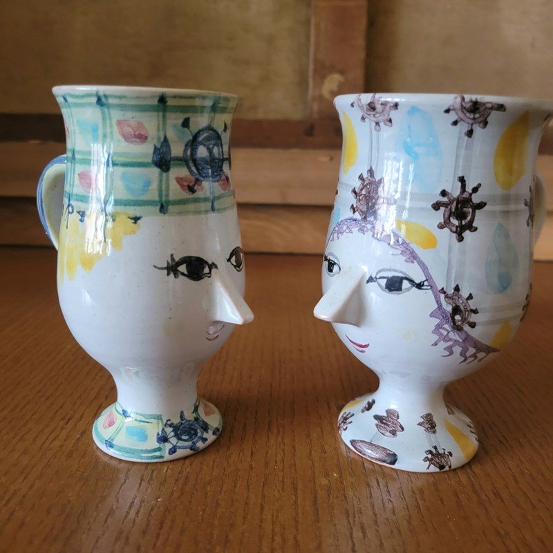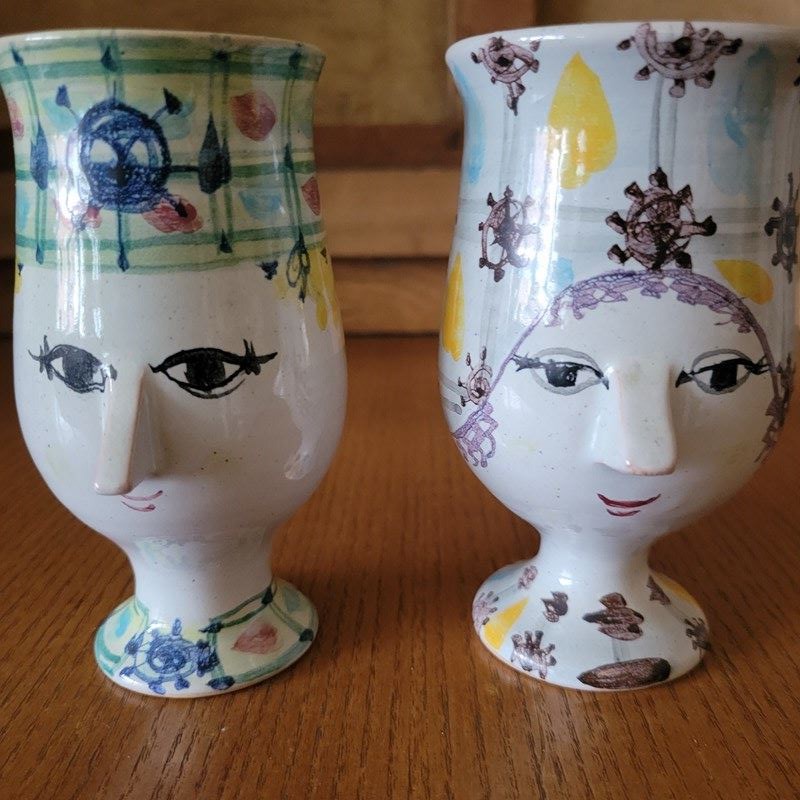 A very rare set of 2 cups by Bjorn Wiinblad studio from 1966. These whimsical cups with hand painted caricatures, are all signed and come with the original Bolighus Copenhagen shop stickers. From his Danish Blue House studio, they are in pristine condition. Featuring both female and male heads, in his trademark style, they are beautifully painted in gorgeous clear colour. These are beautiful display pieces and not to be confused with his commercial diffusion work for Rosenthal.