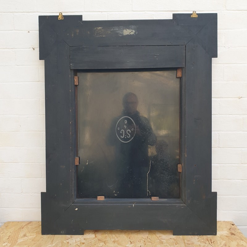 A large stylish solid walnut Dutch style ripple mirror, probably dating from the early 1900's. With geometric corners featuring angular carved stud detailing, and intricate waved and undulating carving along the sides, it also has a wonderful mercury mirror with beveled, edges, with a nicely foxed and mottled reflective surface. The back is open. 86 x 106cm