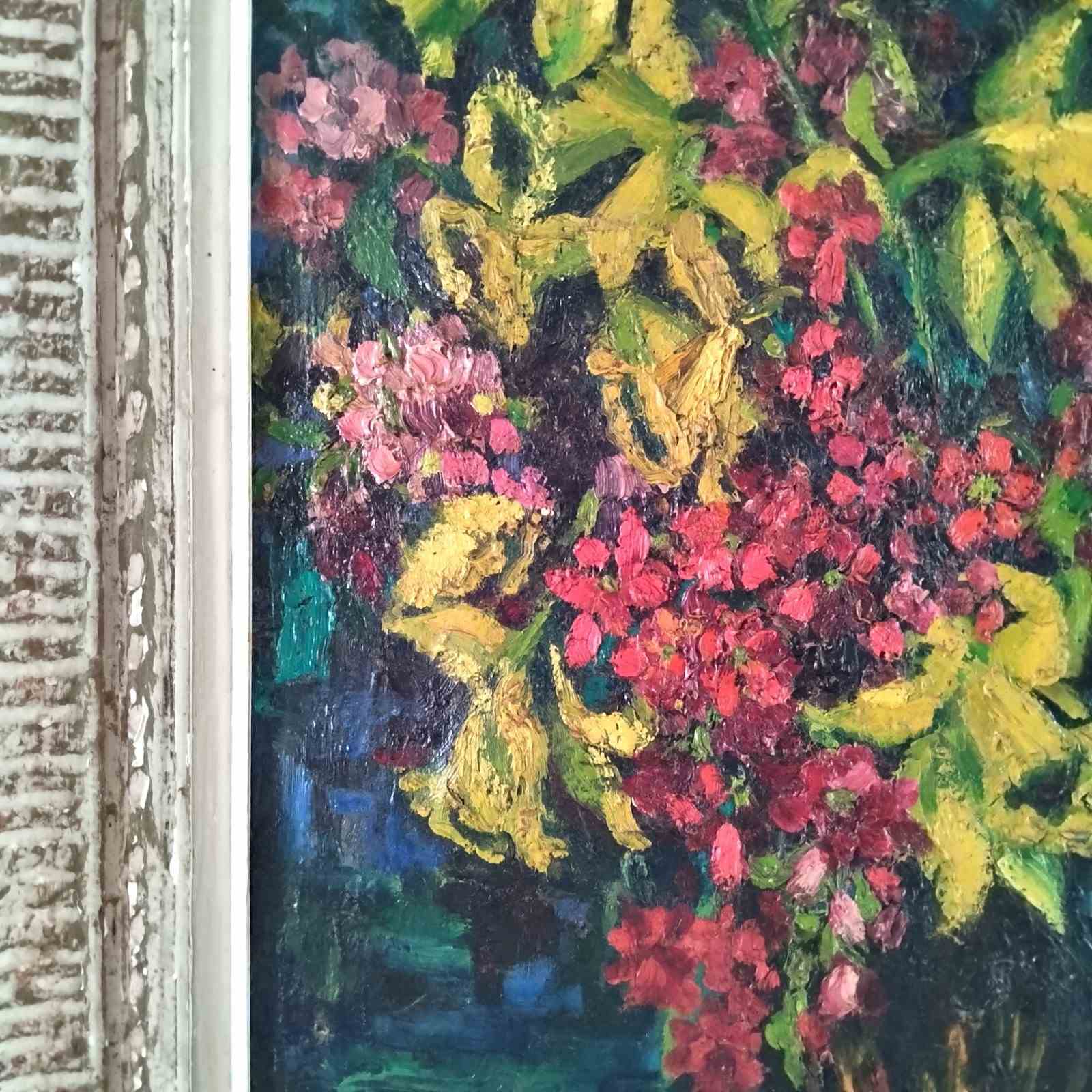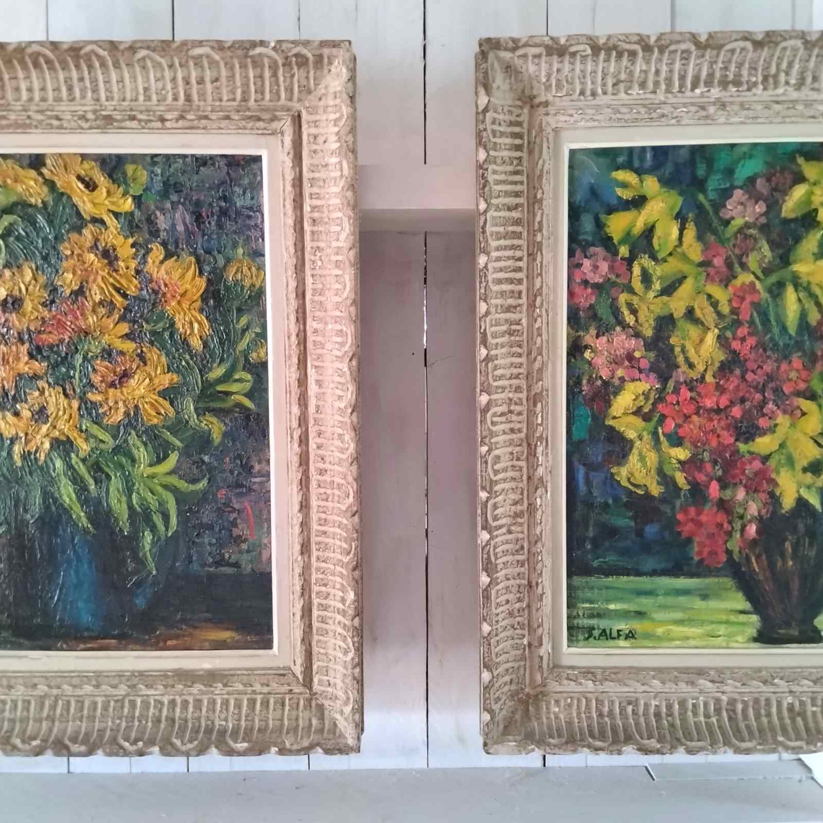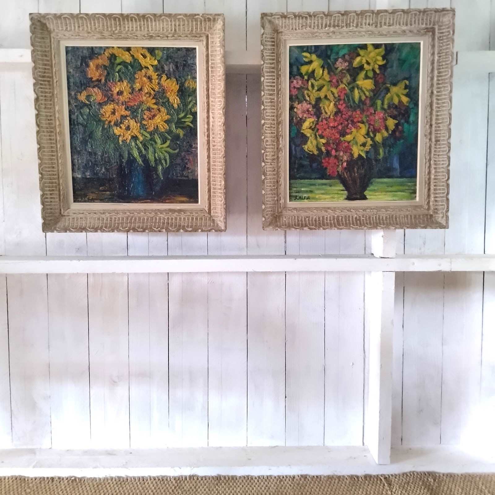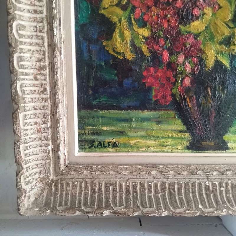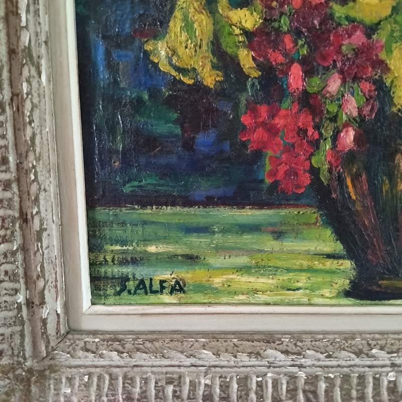 A wonderful expressionist style oil painting from France from the 1950's, depicting a floral composition. Painted in a bold impasto technique, with a darker mixed background of blue tones, with vibrant flowers of predominantly pinks and yellow, set in a vase. Signed S Alfa, and in its original excellent Montparnasse frame, it makes a bold statement for any interior, and can be paired with another painting in the series with identical proportions. Size with frame 72cm x 64cm, artwork 55cm x 46cm