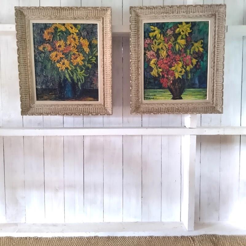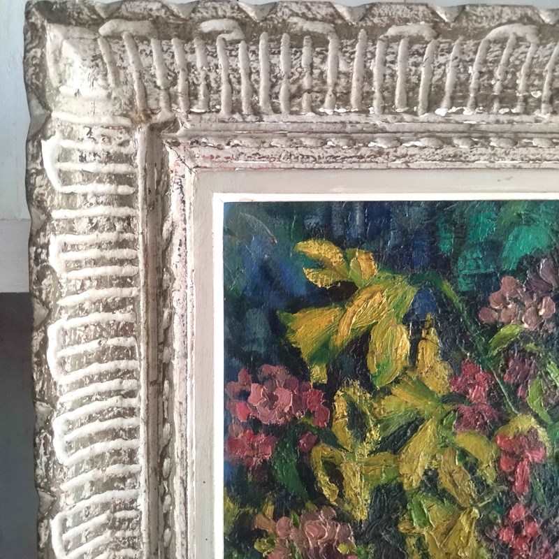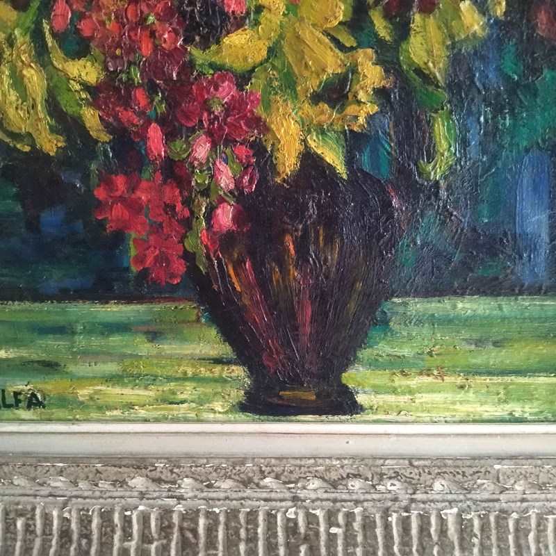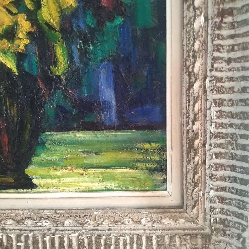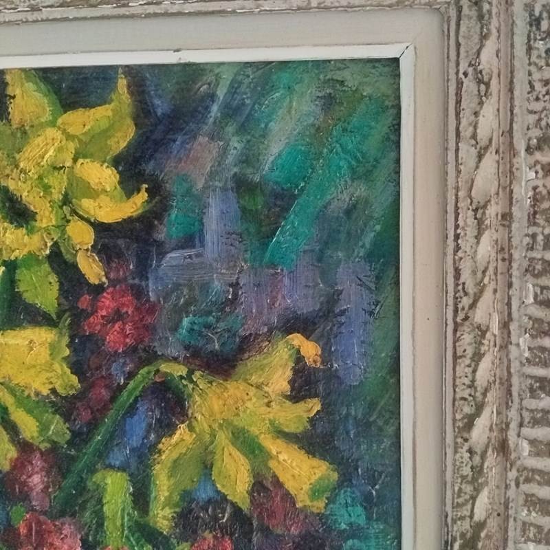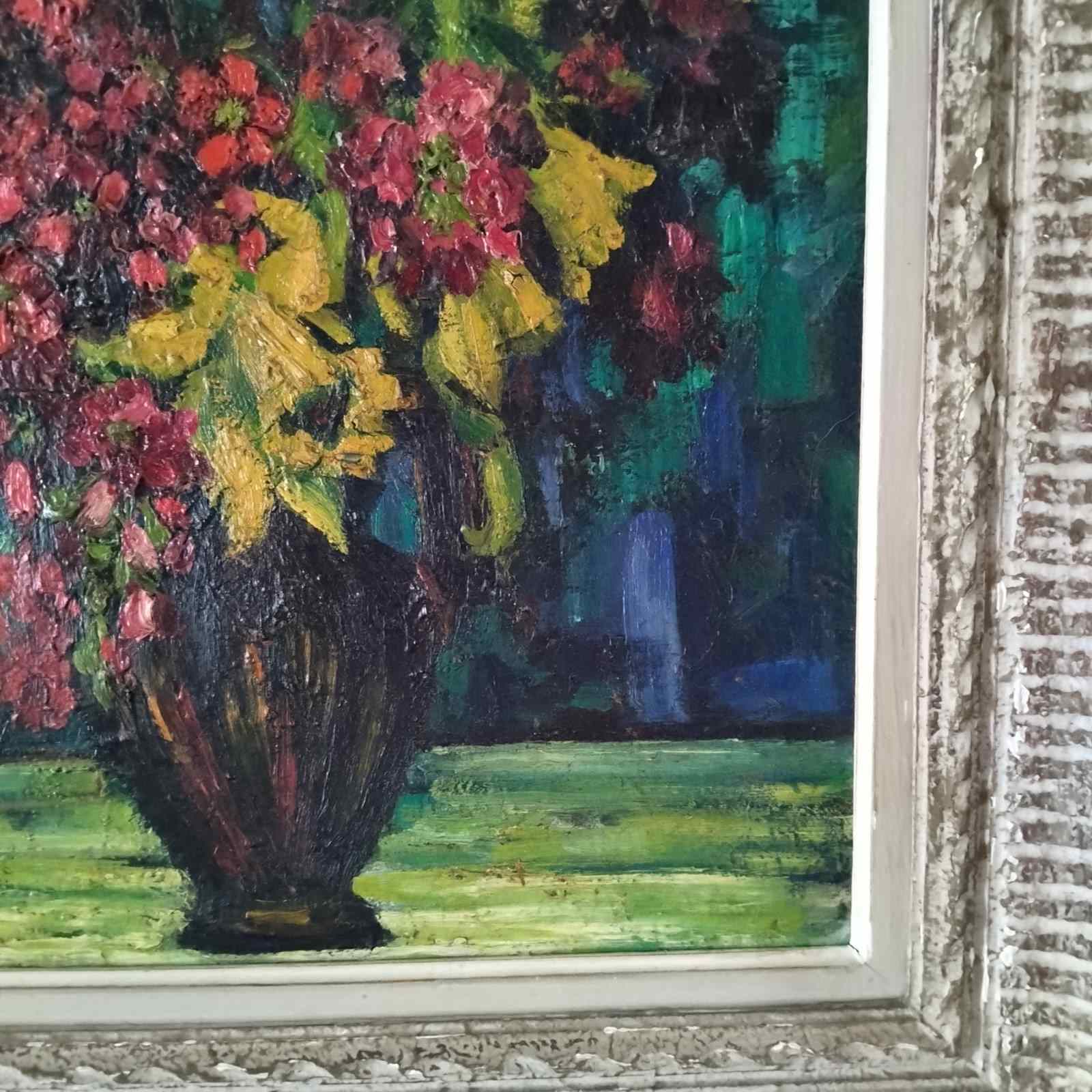 A wonderful expressionist style oil painting from France from the 1950's, depicting a floral composition. Painted in a bold impasto technique, with a darker mixed background of blue tones, with vibrant flowers of predominantly pinks and yellow, set in a vase. Signed S Alfa, and in its original excellent Montparnasse frame, it makes a bold statement for any interior, and can be paired with another painting in the series with identical proportions. Size with frame 72cm x 64cm, artwork 55cm x 46cm