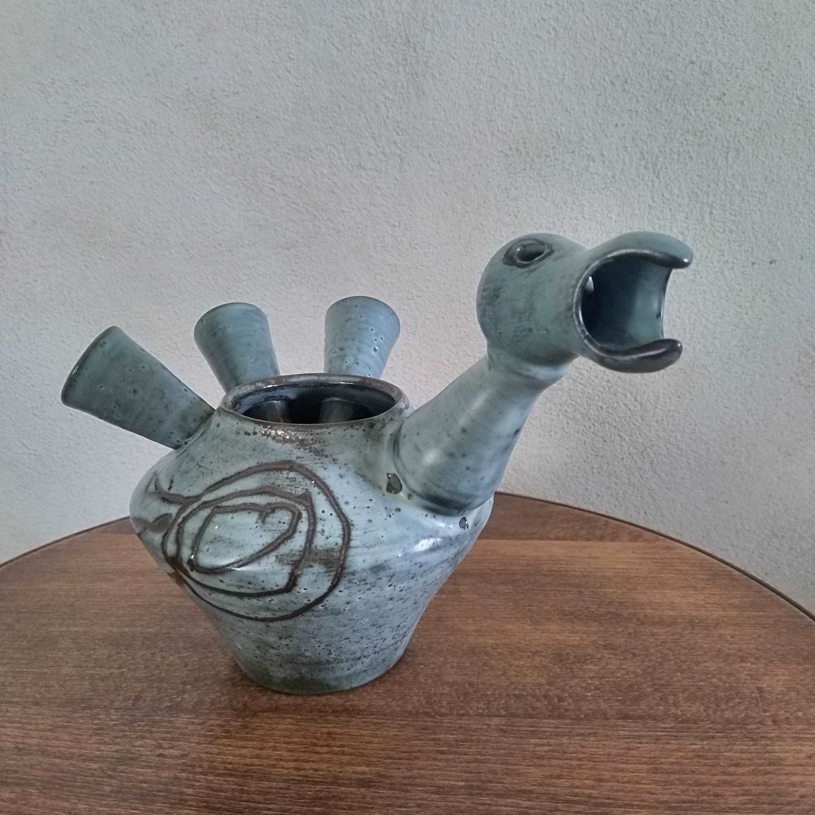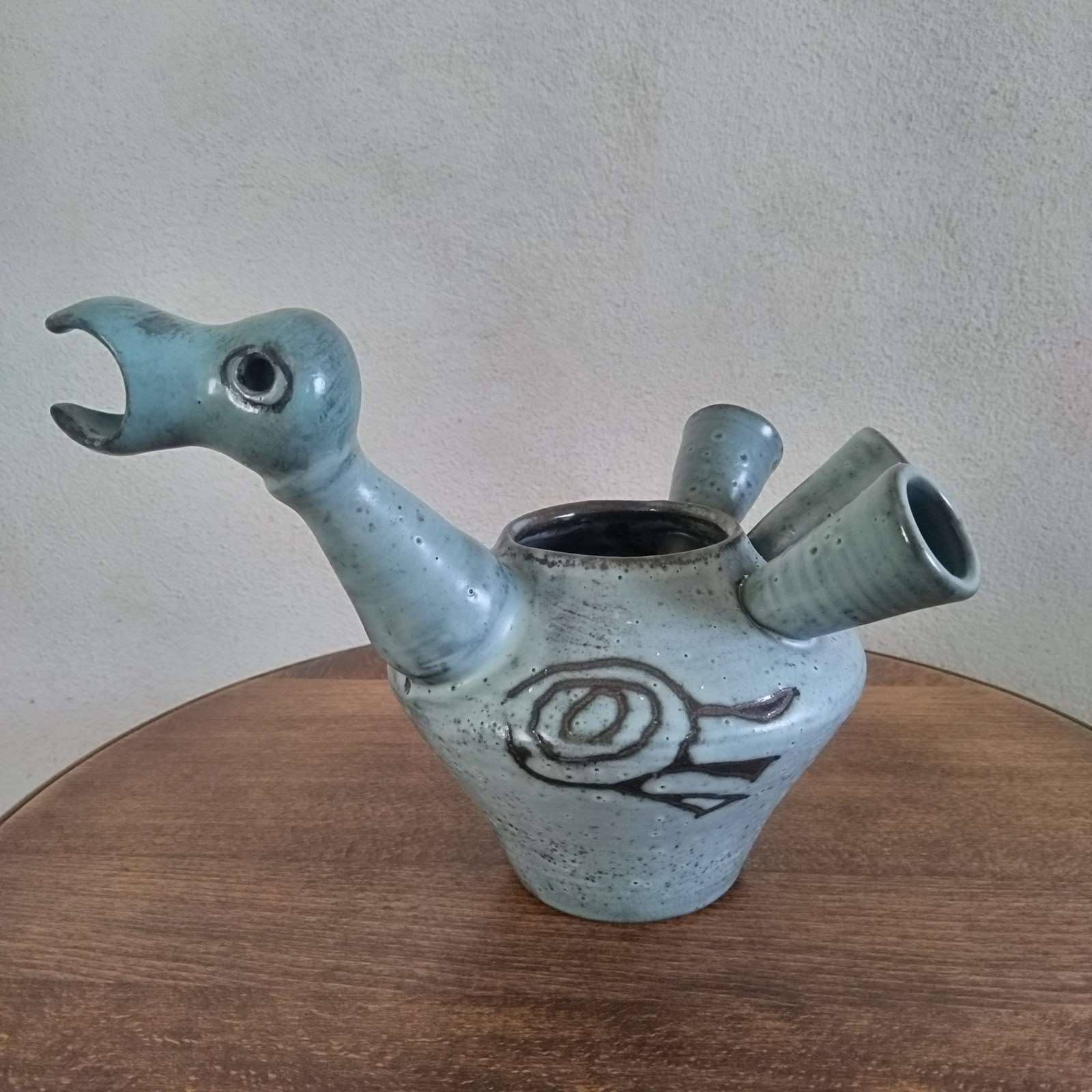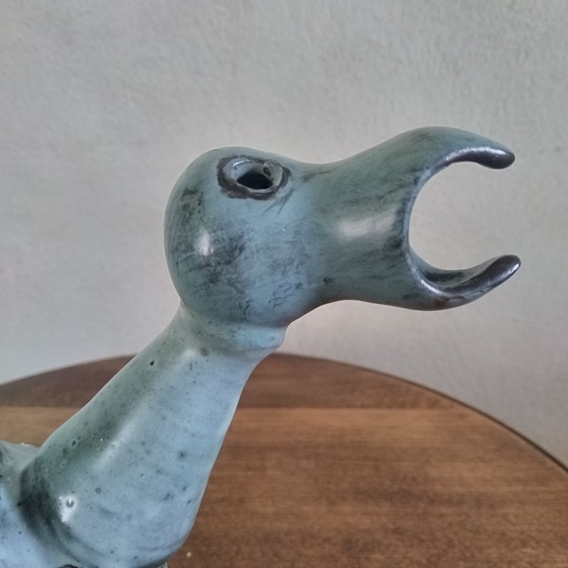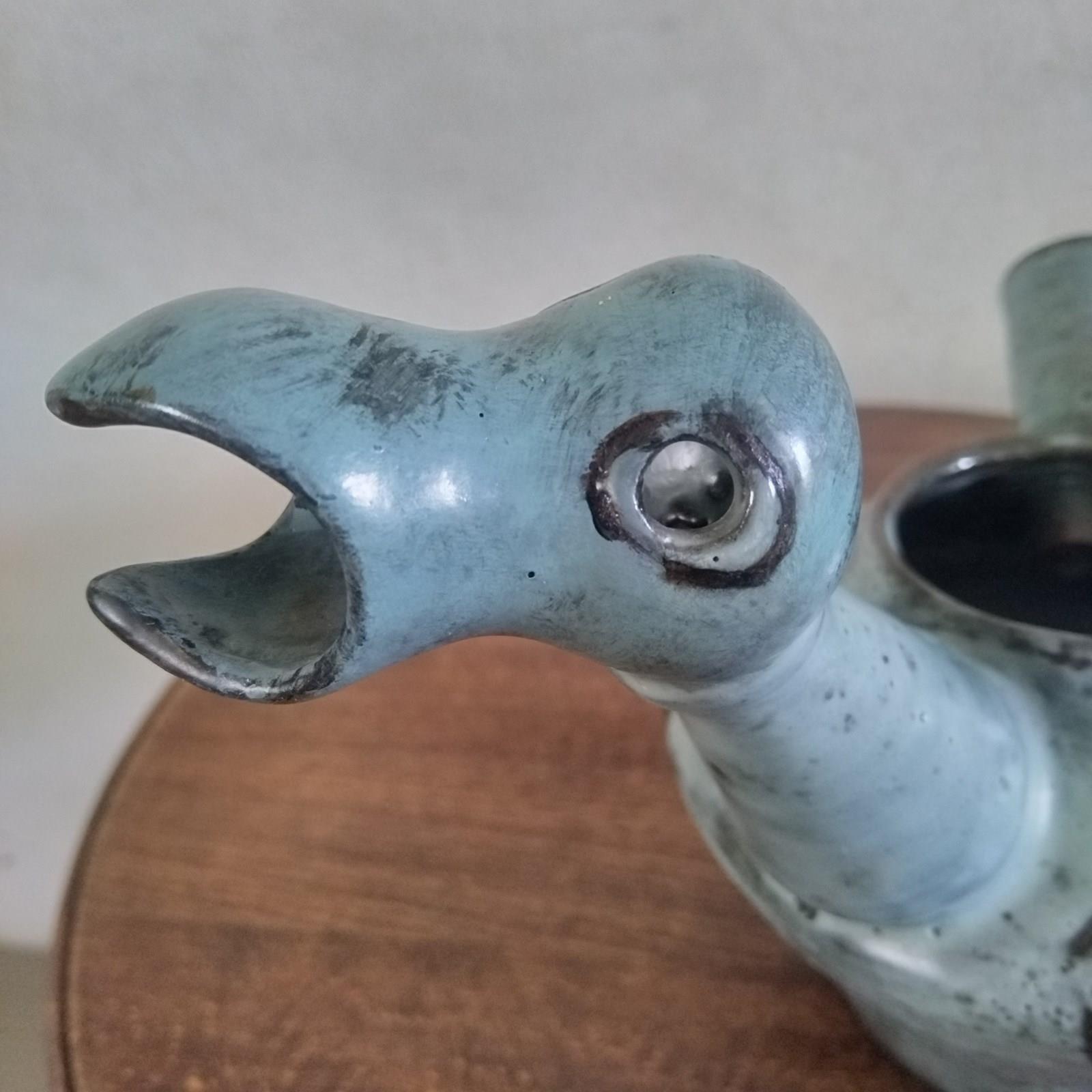 A very good quality French ceramic from the 1950's of a stylized bird. With excellent glazing and sculpting, the vessel or vase features a hollow body and tail plumage, through to its hollow neck and head. with fine colour layers, and an abstract pattern to both sides, the figure is well sized for a good decorative display presence. Unsigned and in excellent vintage condition. 18cm tall 29cm long 18cm wide