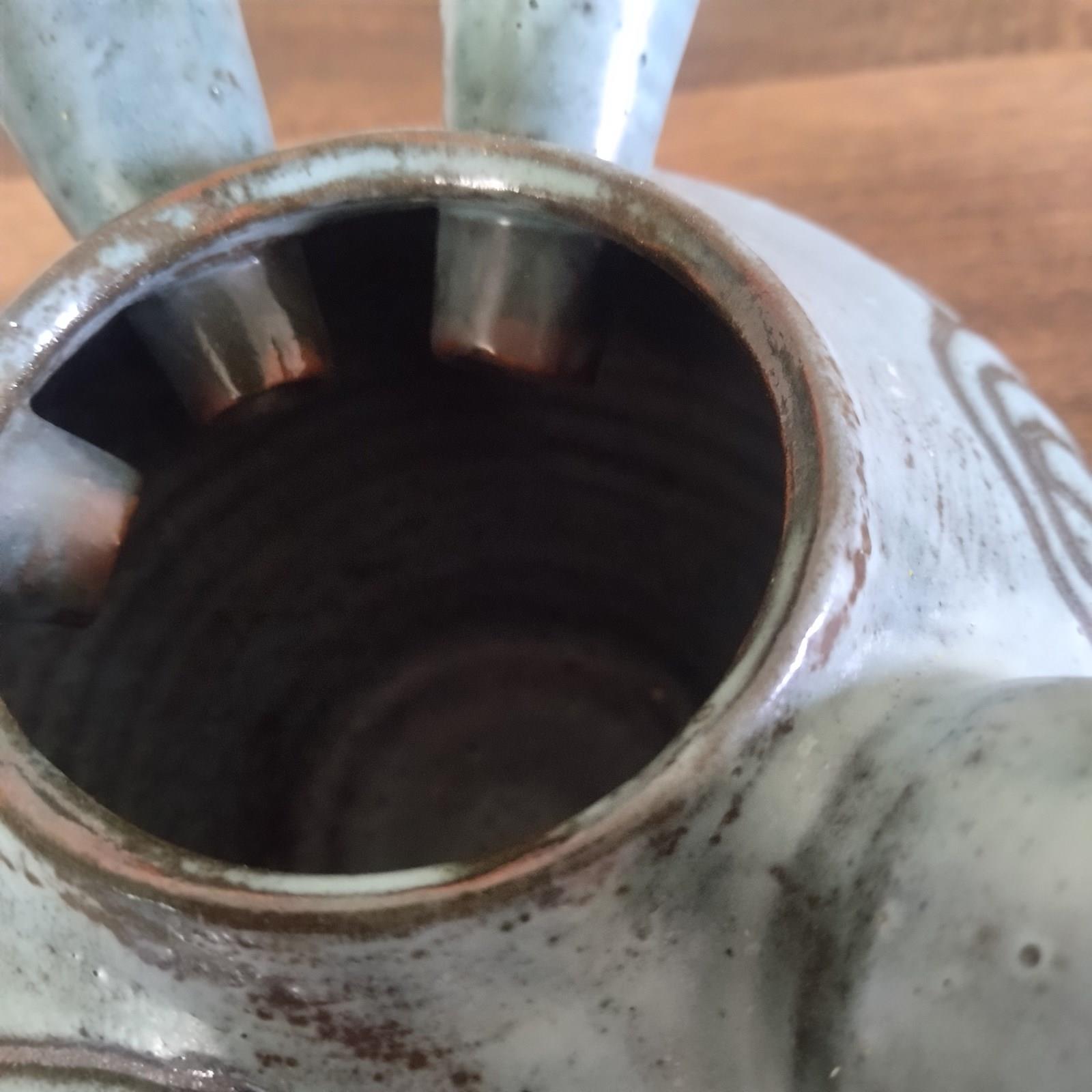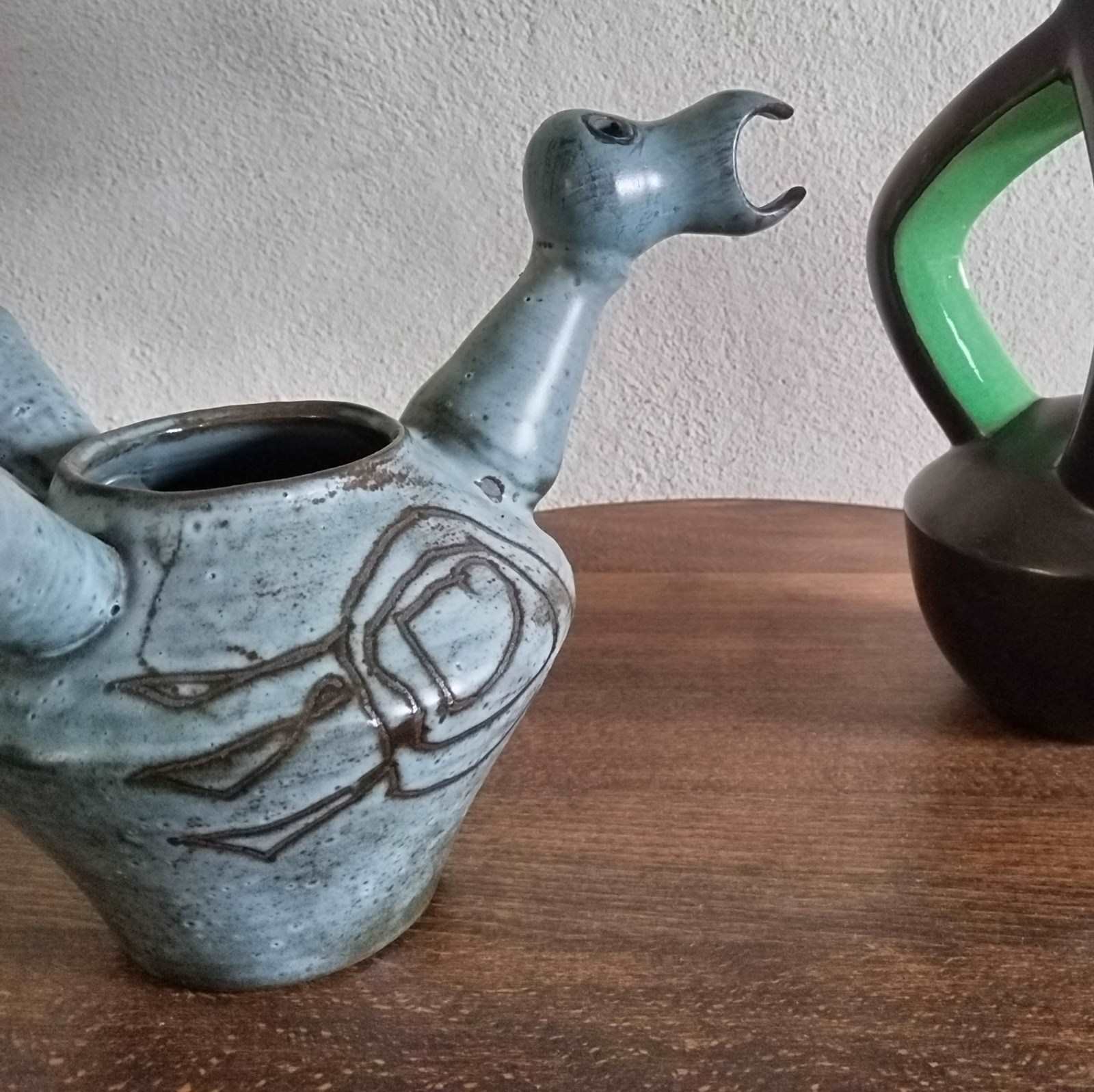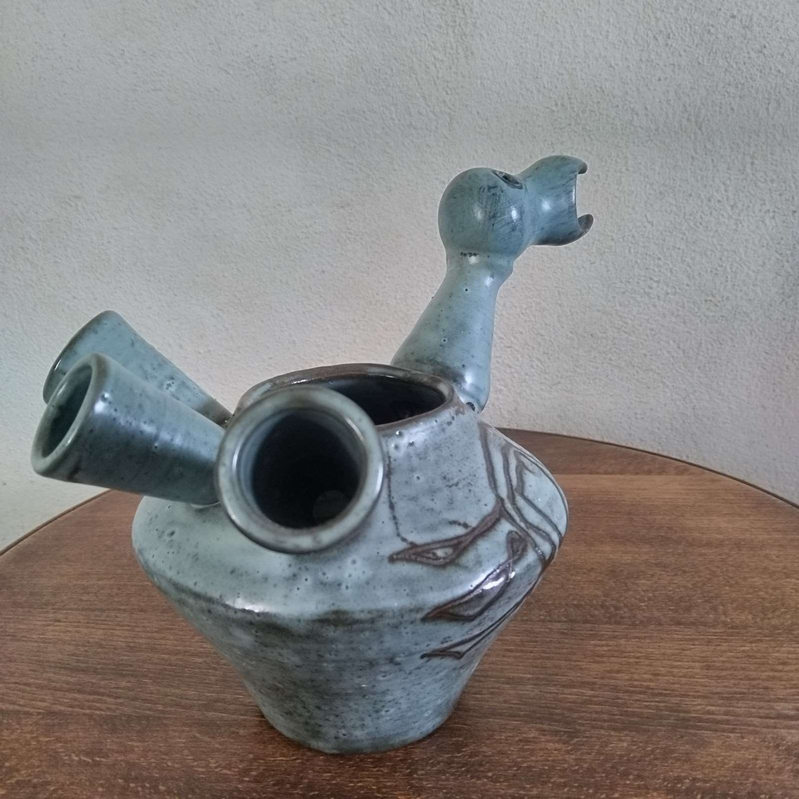 A very good quality French ceramic from the 1950's of a stylized bird. With excellent glazing and sculpting, the vessel or vase features a hollow body and tail plumage, through to its hollow neck and head. with fine colour layers, and an abstract pattern to both sides, the figure is well sized for a good decorative display presence. Unsigned and in excellent vintage condition. 18cm tall 29cm long 18cm wide