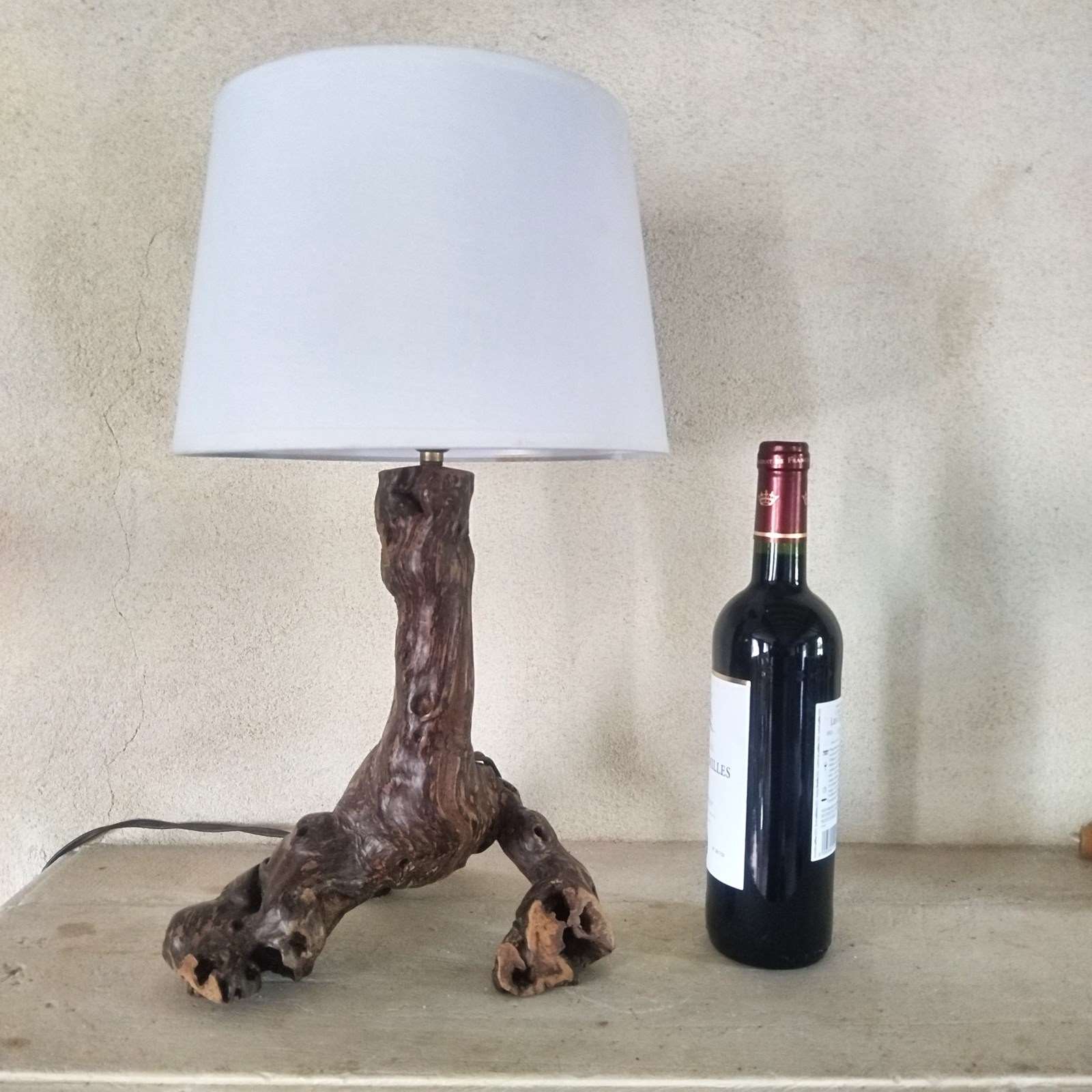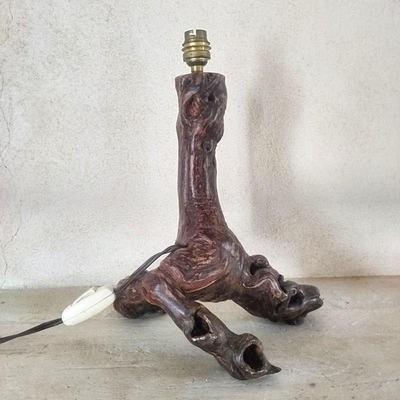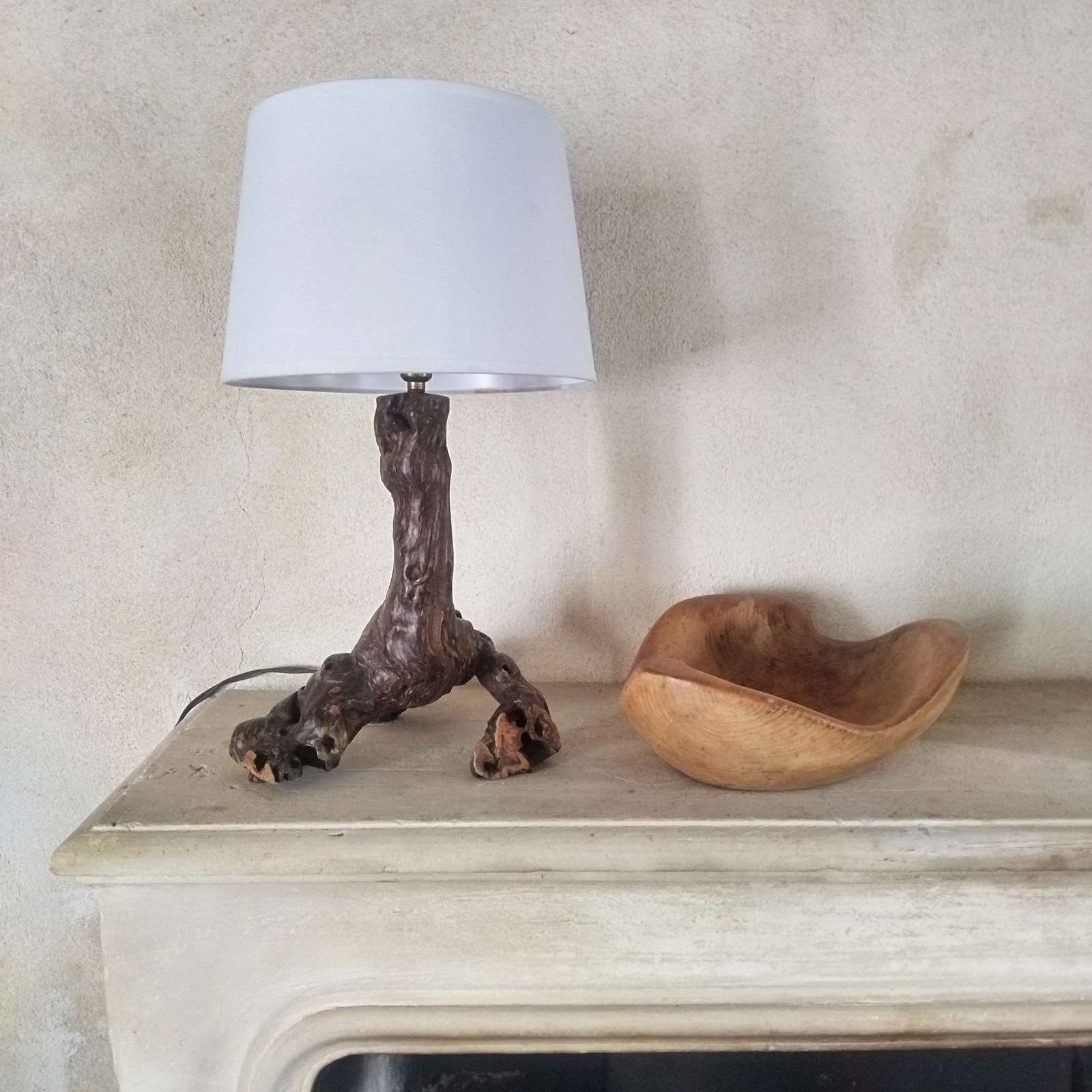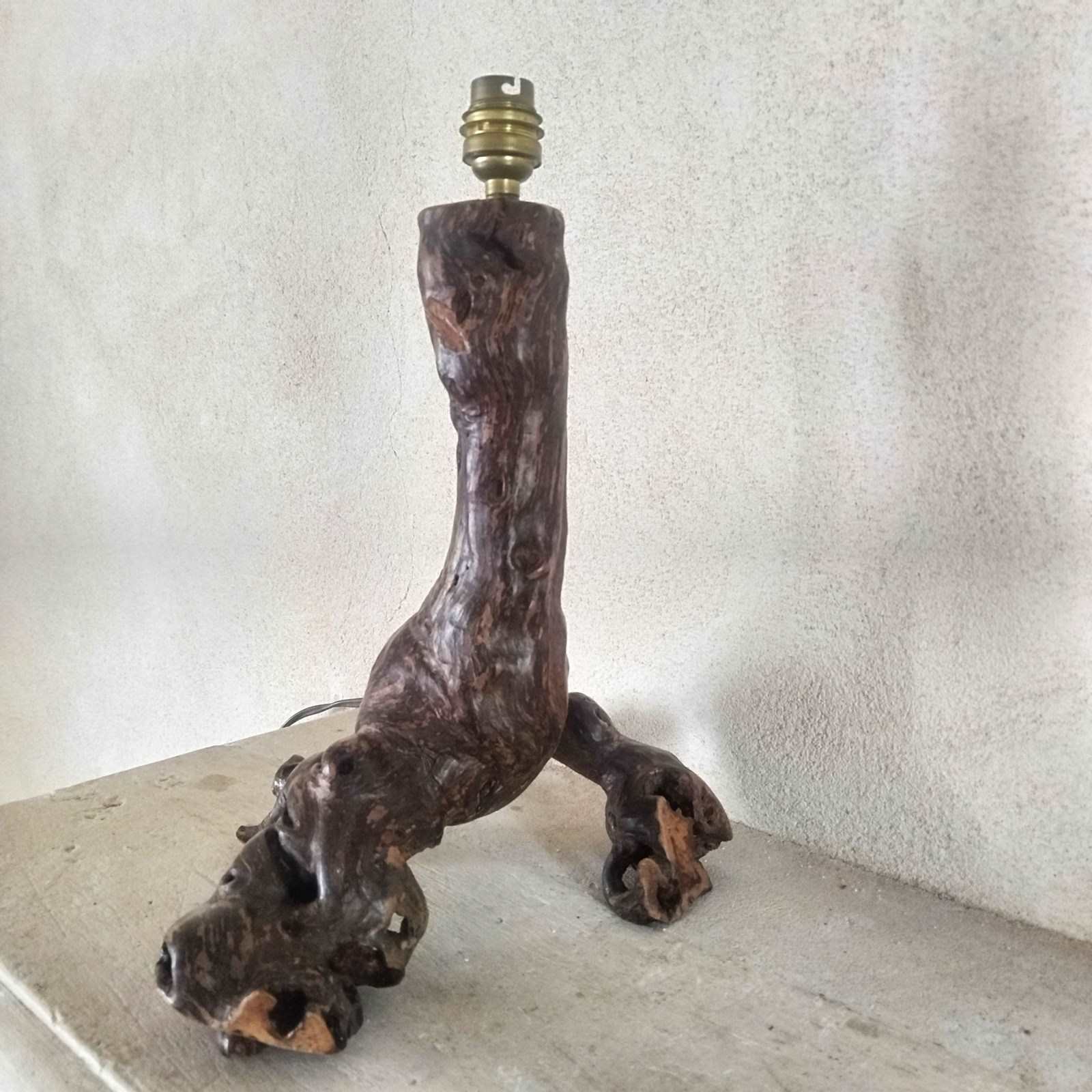 A fabulous sculptural French table lamp dating from the 1950's, and made from old grape vine wood, with rural brutalist sensibilities. Sold without shade and 32cm tall to top of fitting and 25cm widest. Ready to use.