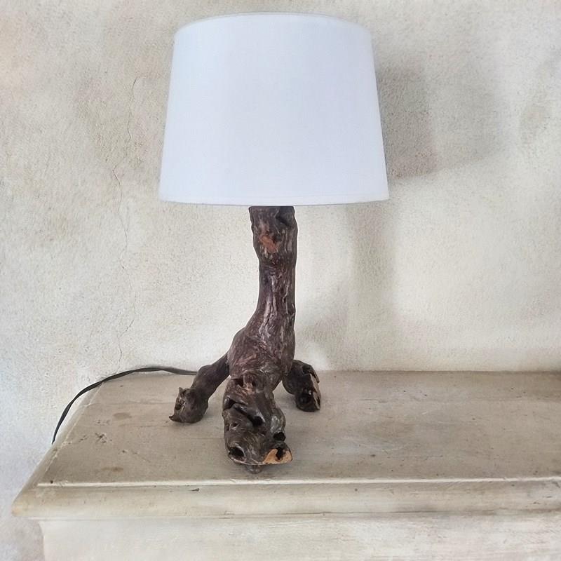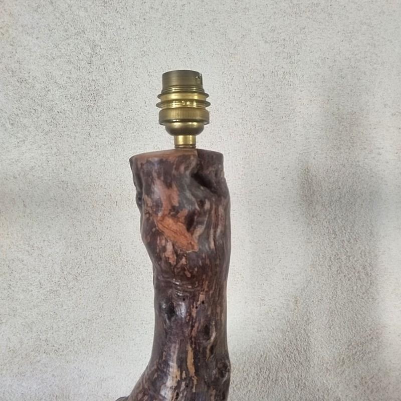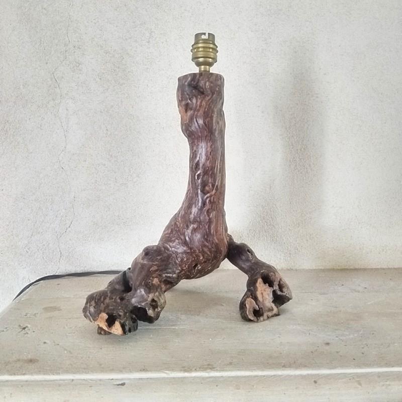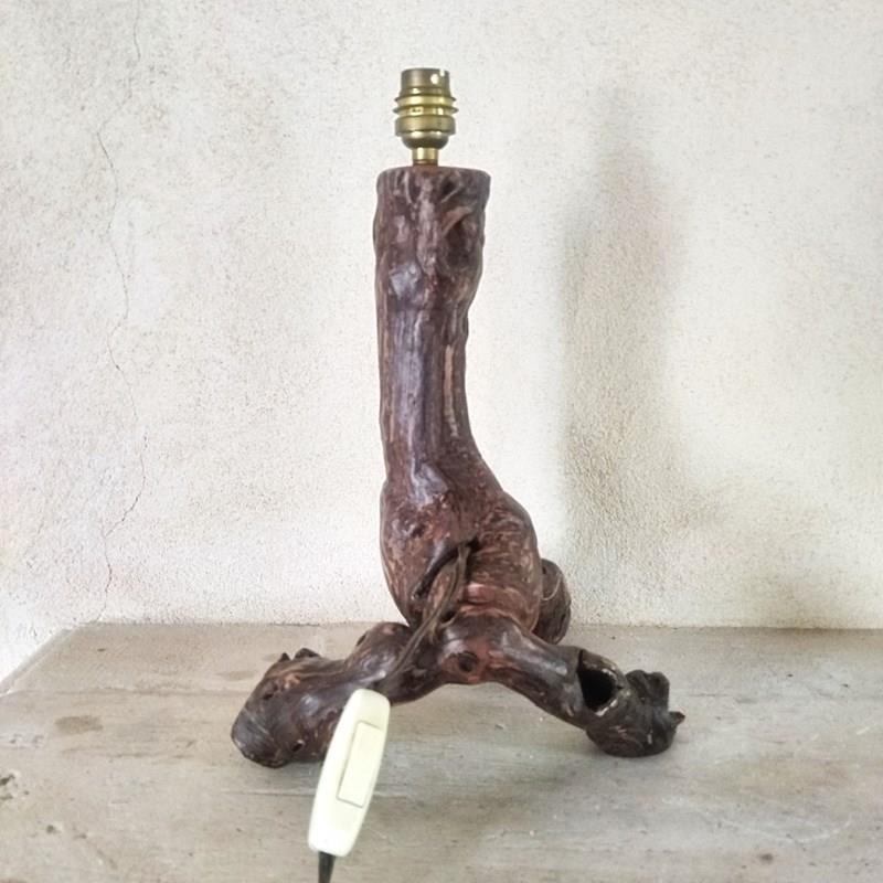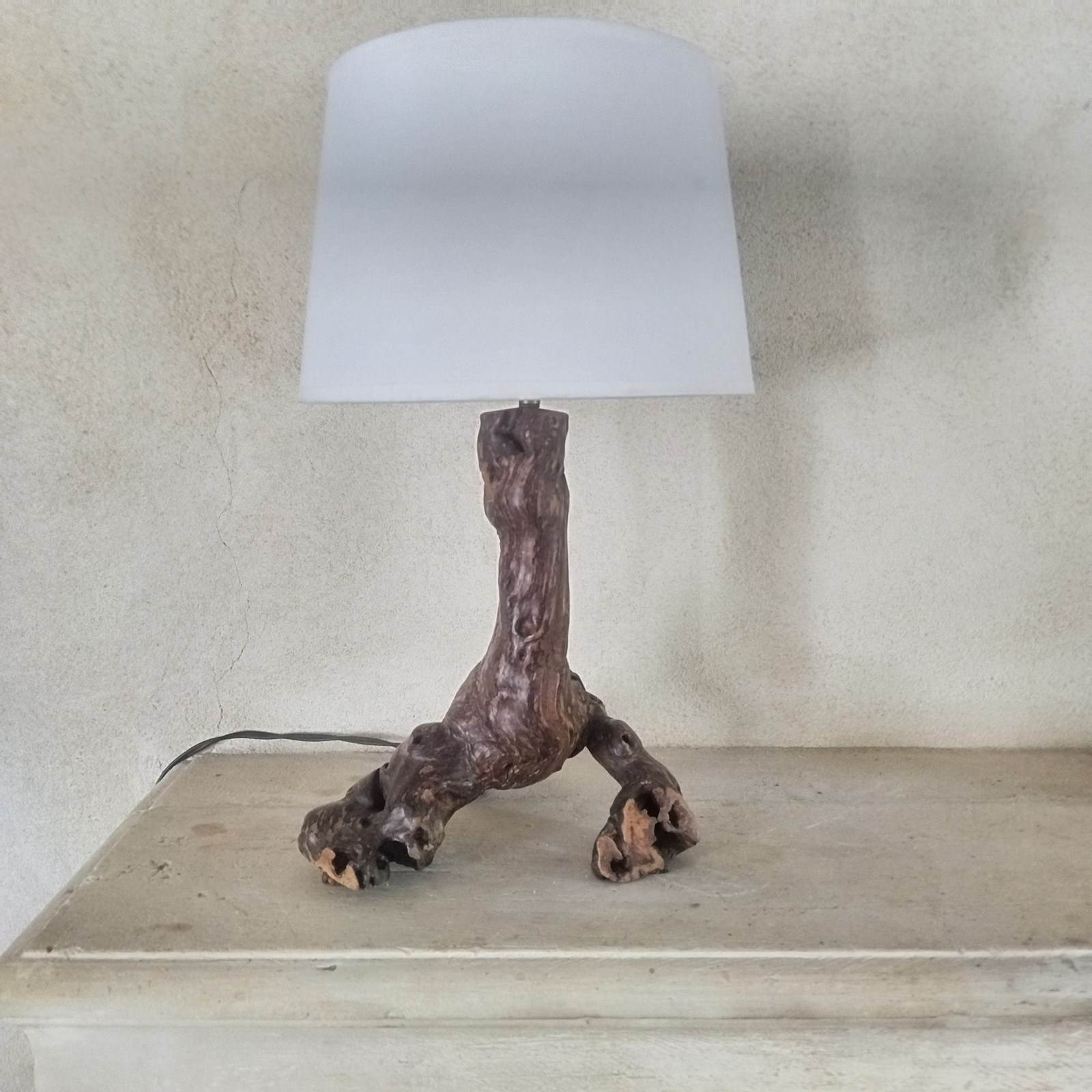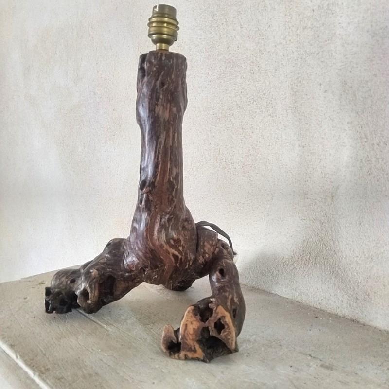 A fabulous sculptural French table lamp dating from the 1950's, and made from old grape vine wood, with rural brutalist sensibilities. Sold without shade and 32cm tall to top of fitting and 25cm widest. Ready to use.