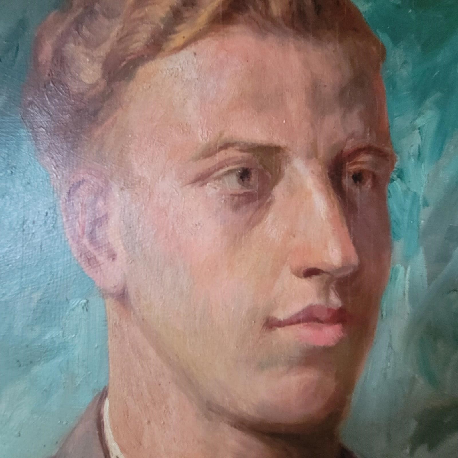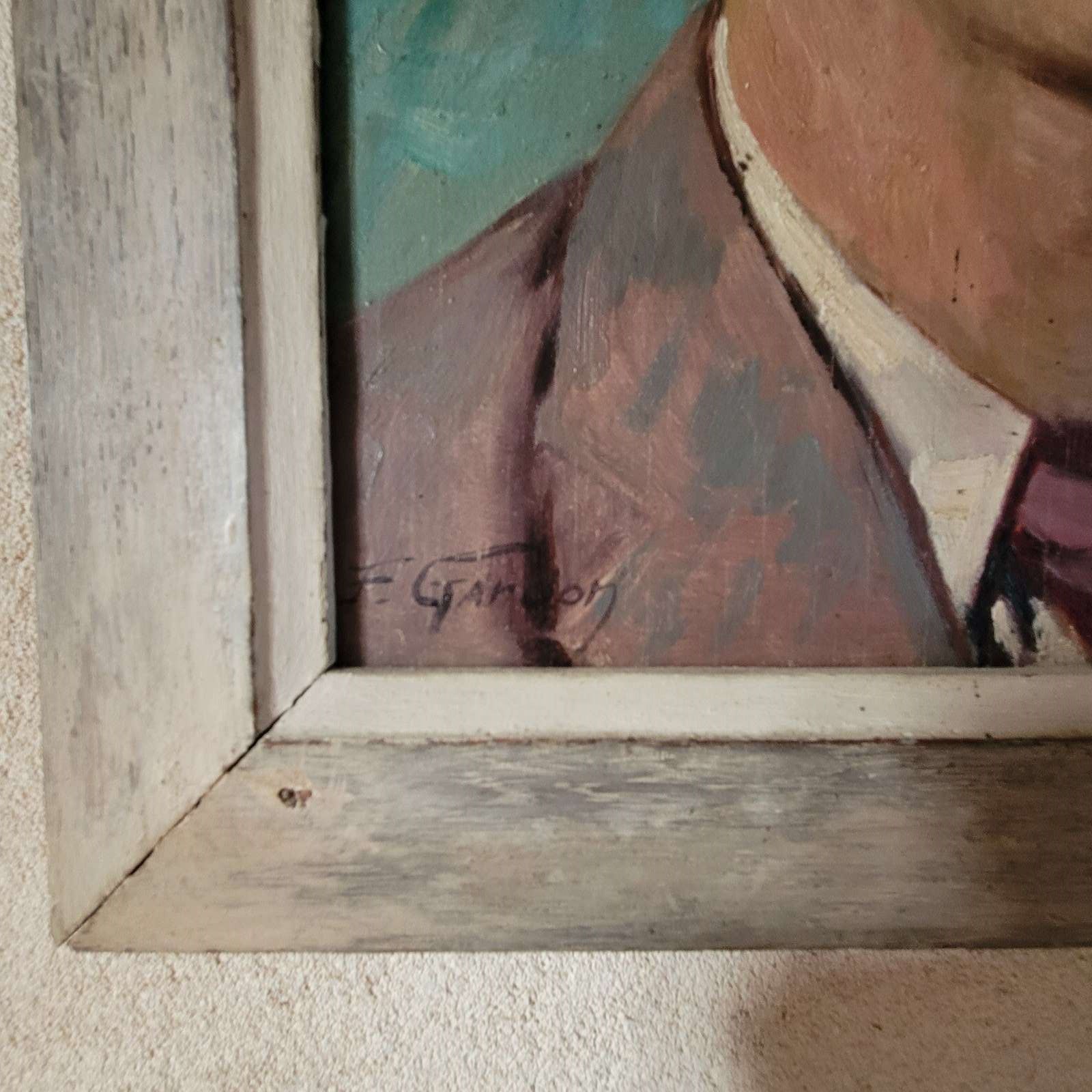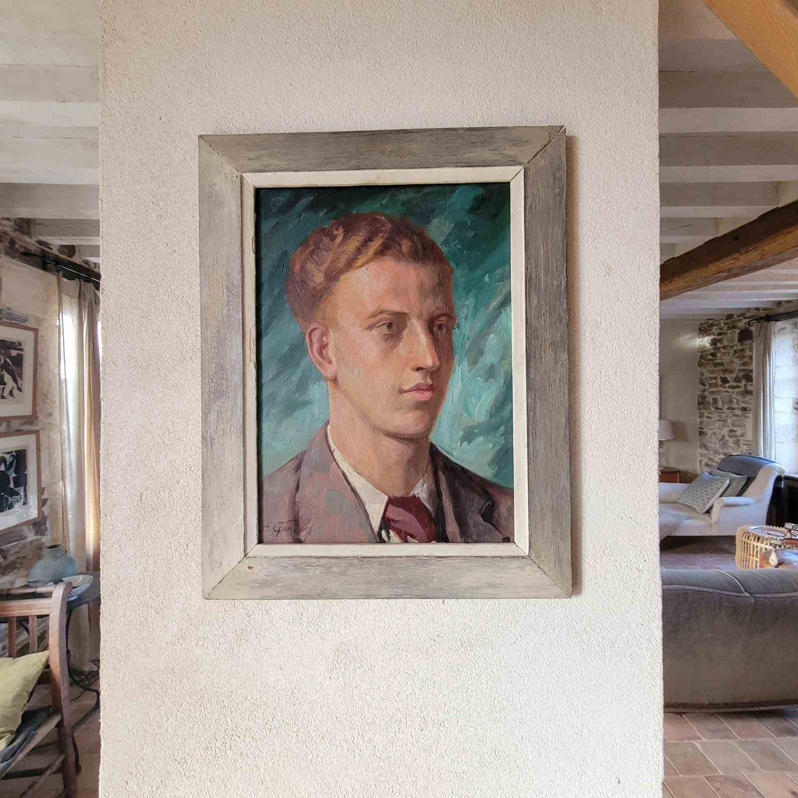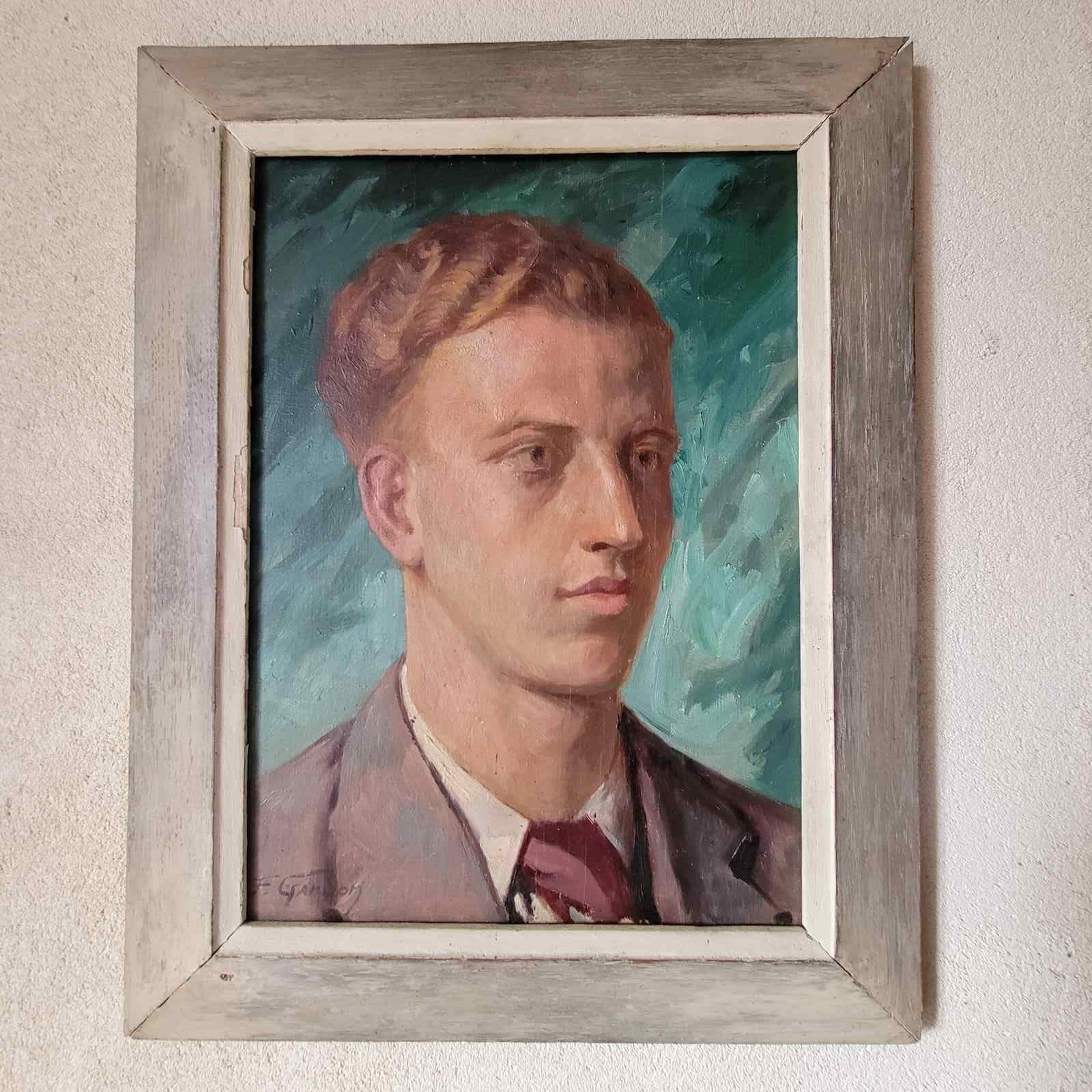 A very stylish French portrait dated 1937, and signed by F Gardon. An elegant young man painted with beautiful skin tones and features, and with a striking sea green background colour. Framed oil on wood board, and with an inscription on the reverse in French, translated as " to my young cousin, J Crommer, as a souvenir of my visit to London, F Gardon August 1937. Size 48 x 38cm including frame