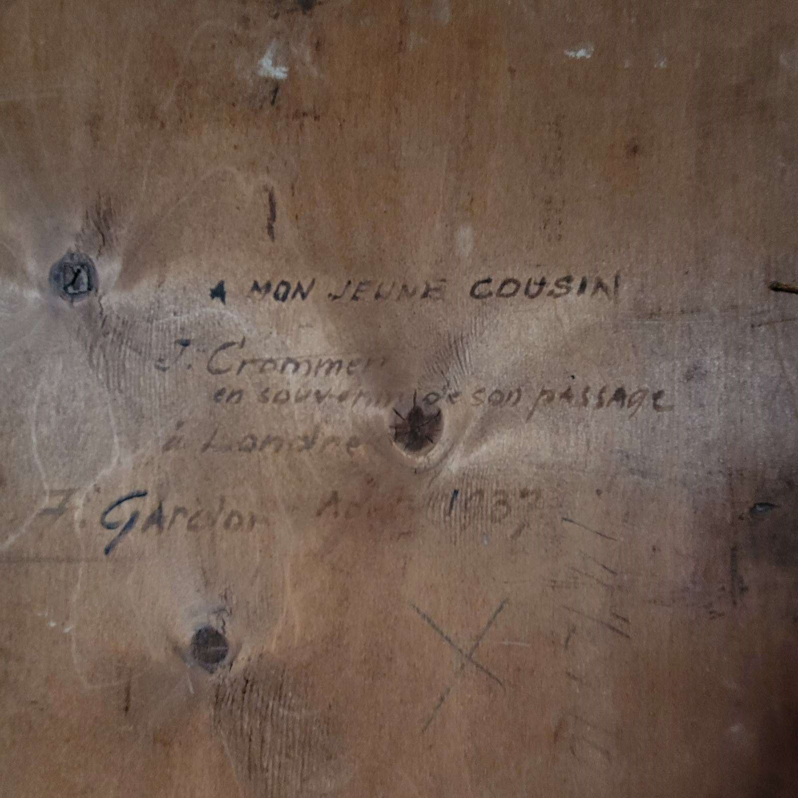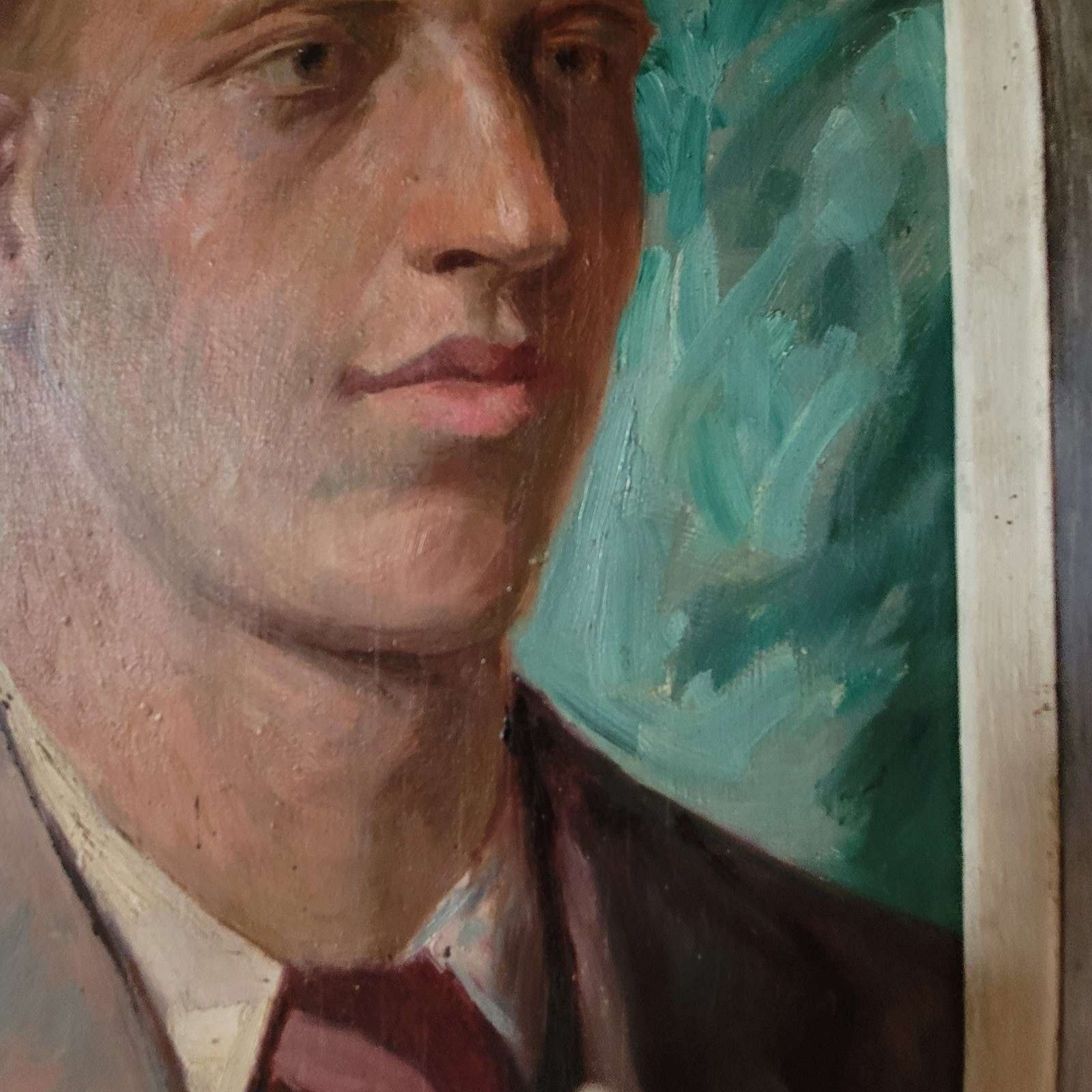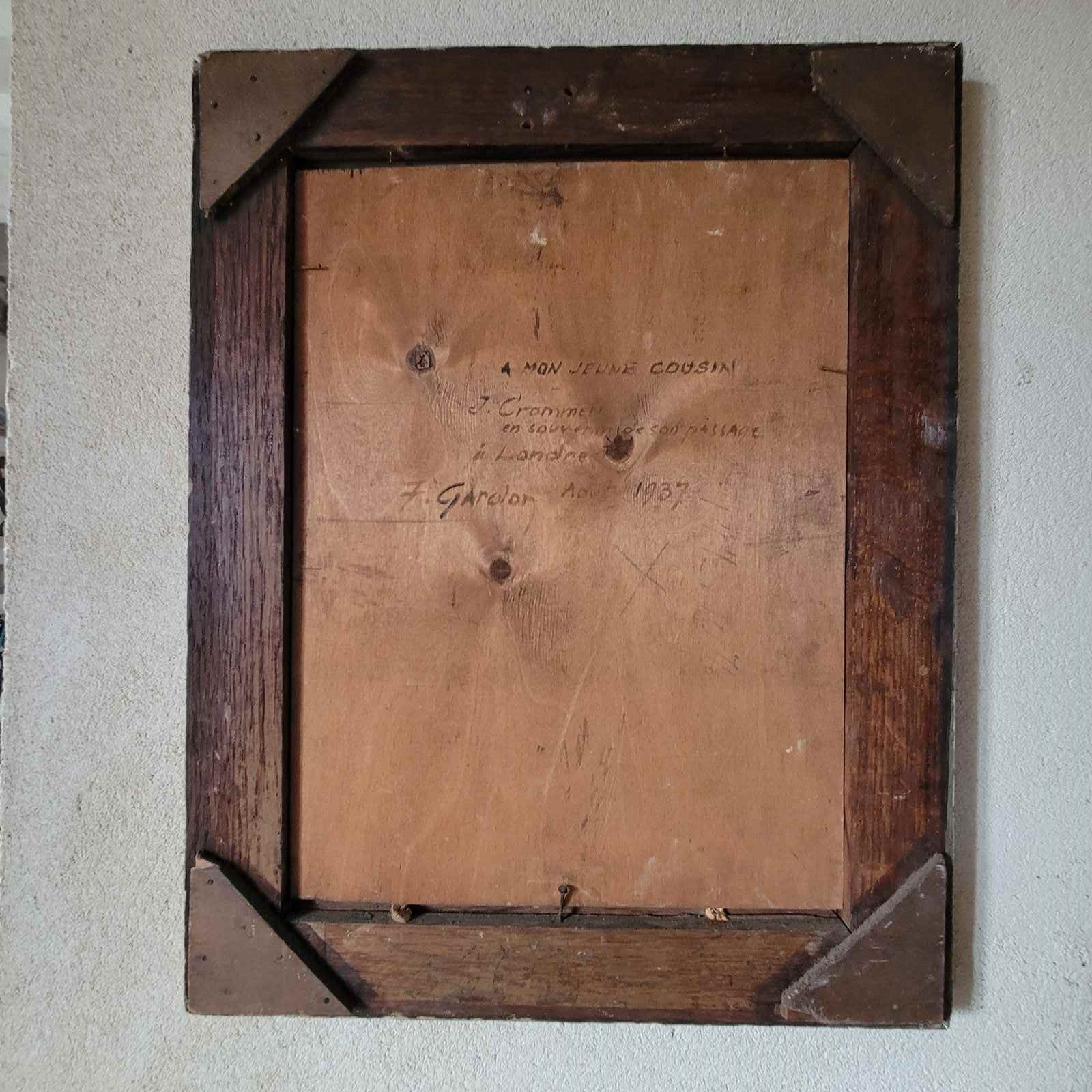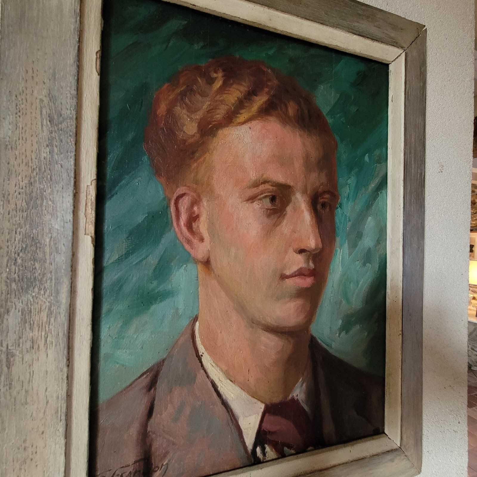 A very stylish French portrait dated 1937, and signed by F Gardon. An elegant young man painted with beautiful skin tones and features, and with a striking sea green background colour. Framed oil on wood board, and with an inscription on the reverse in French, translated as " to my young cousin, J Crommer, as a souvenir of my visit to London, F Gardon August 1937. Size 48 x 38cm including frame