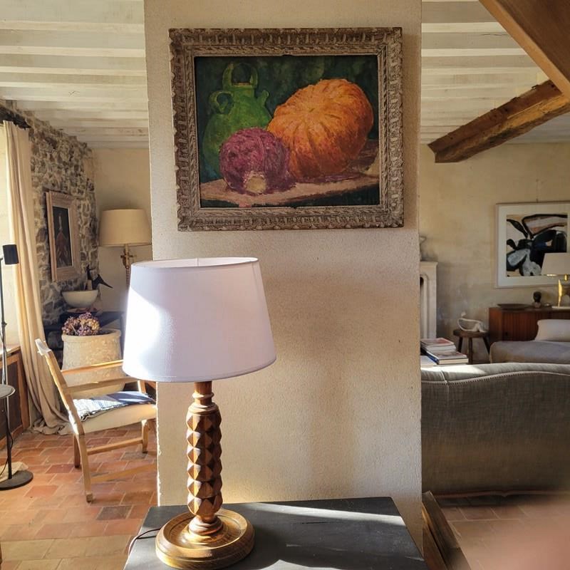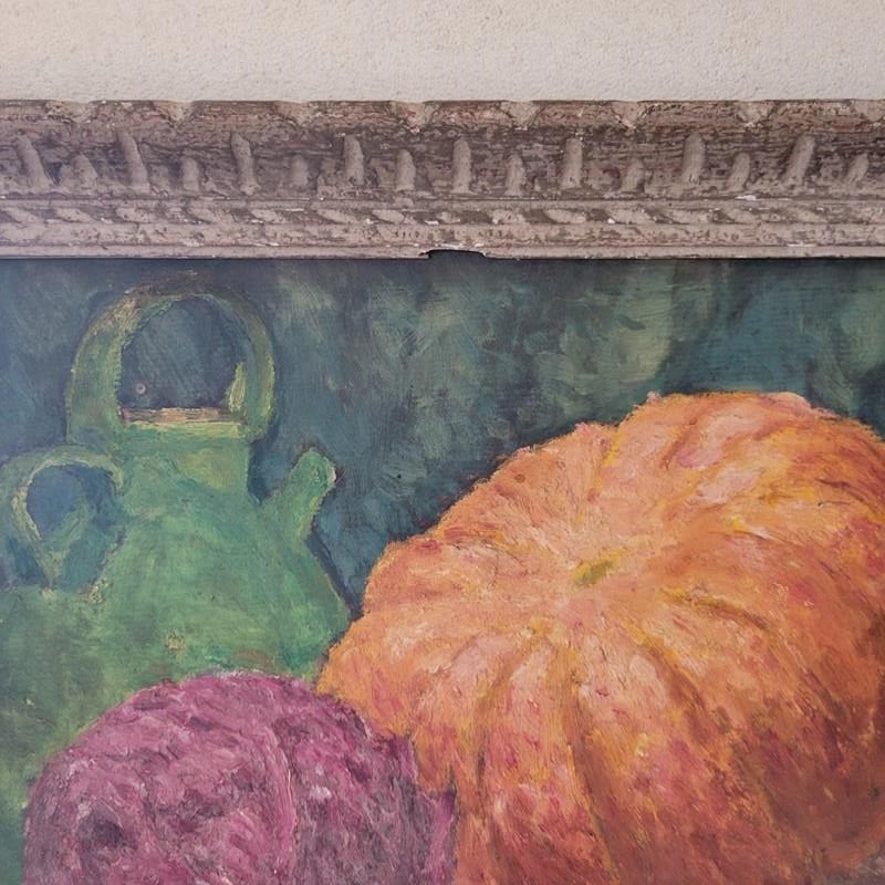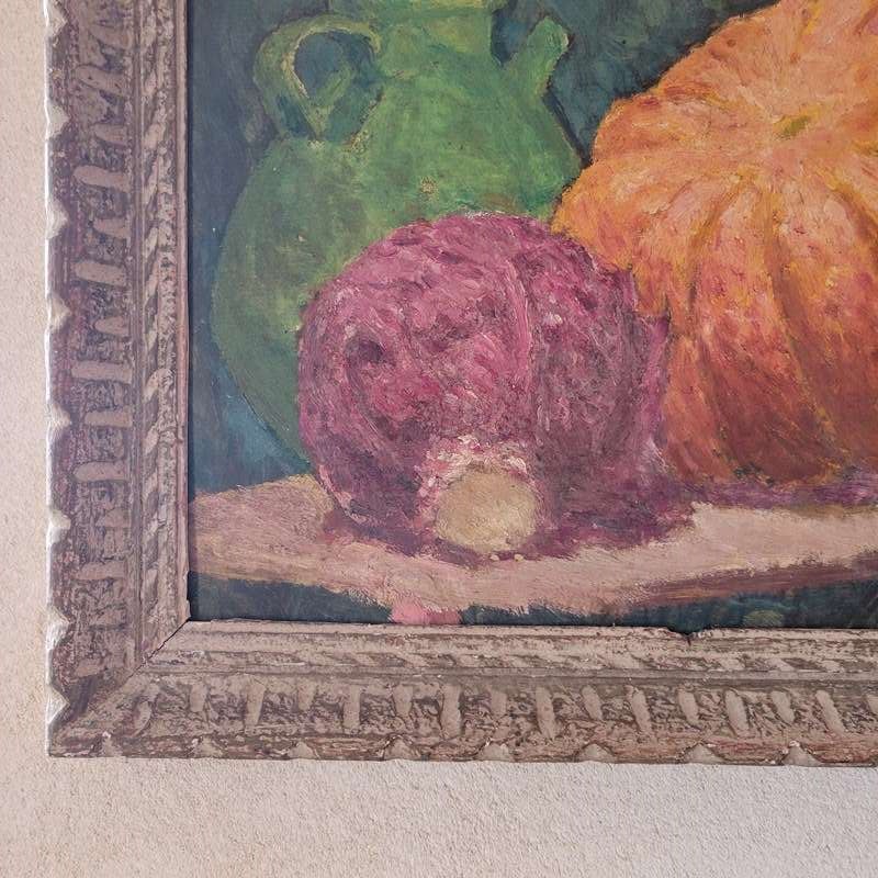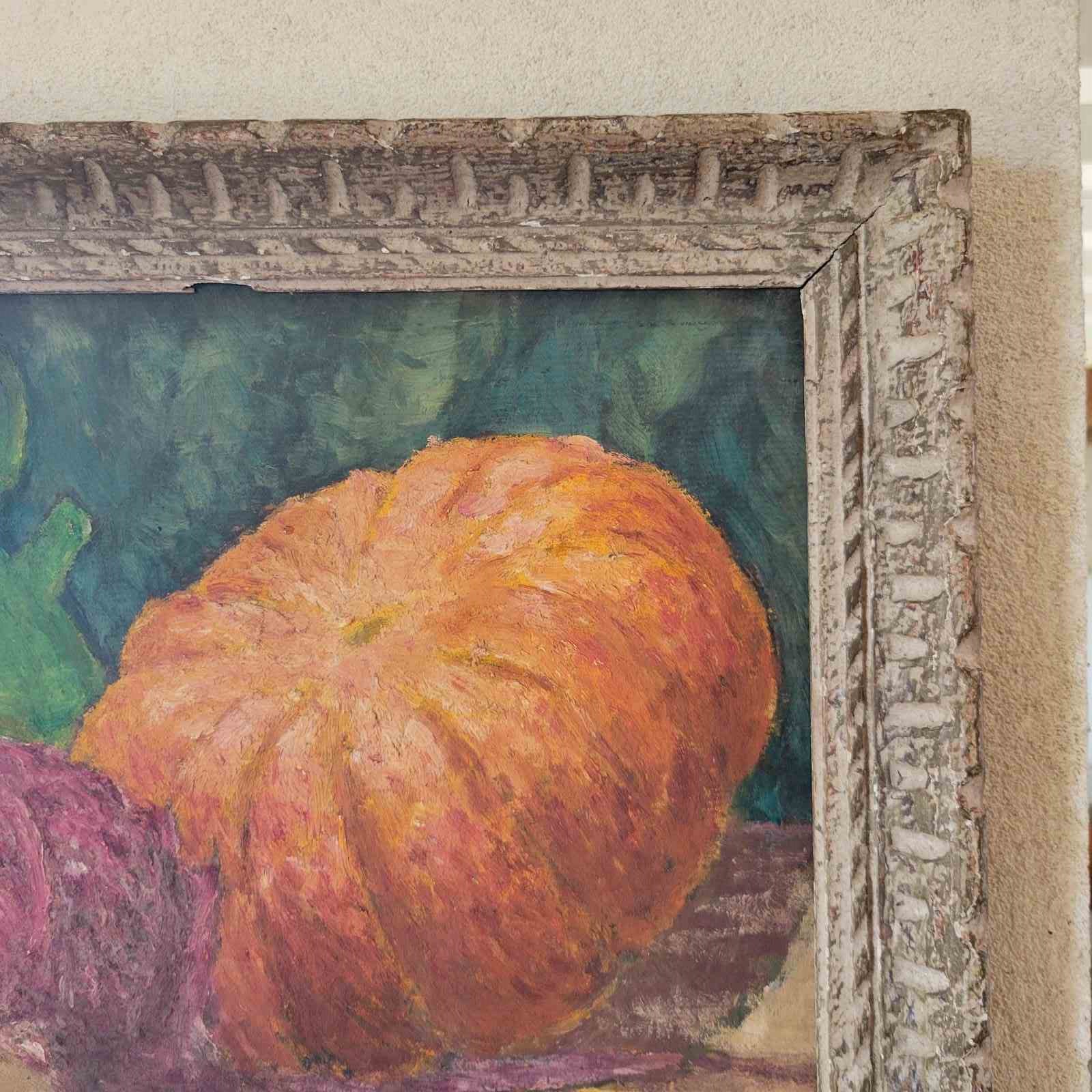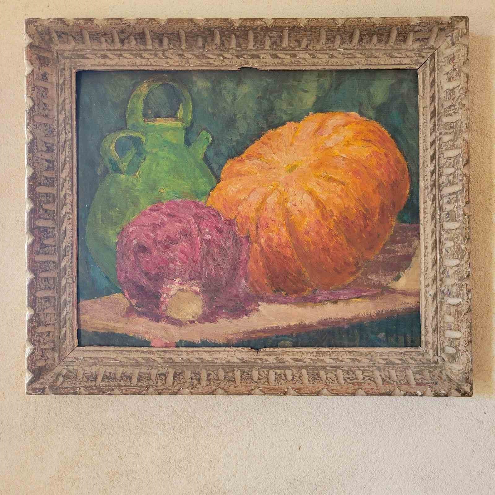 A very charming French still life from the 1930s, in oil on board. Within a beautiful Montparnasse frame, the painting portrays a pumpkin, red cabbage and a green glazed crushed, or pitcher. The colours are superb. Note that there are 2 discrete chips on the frames inside edge, visible in photos, but doing nothing to distract from the ensemble.