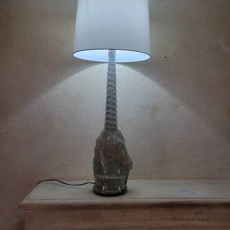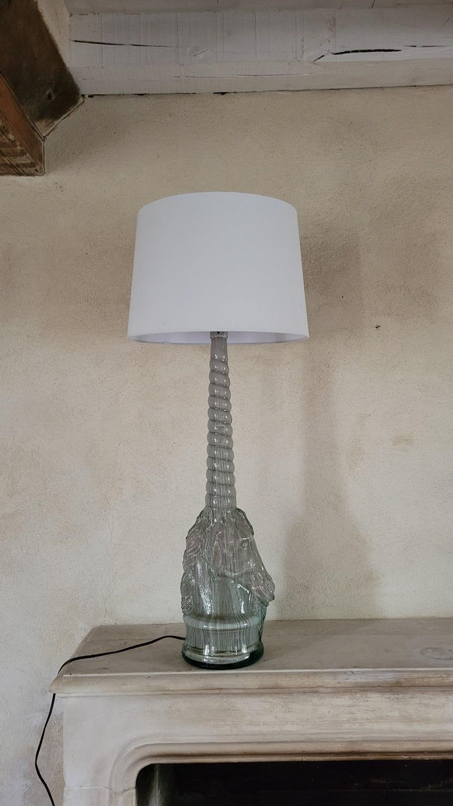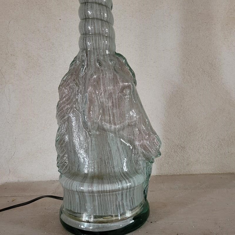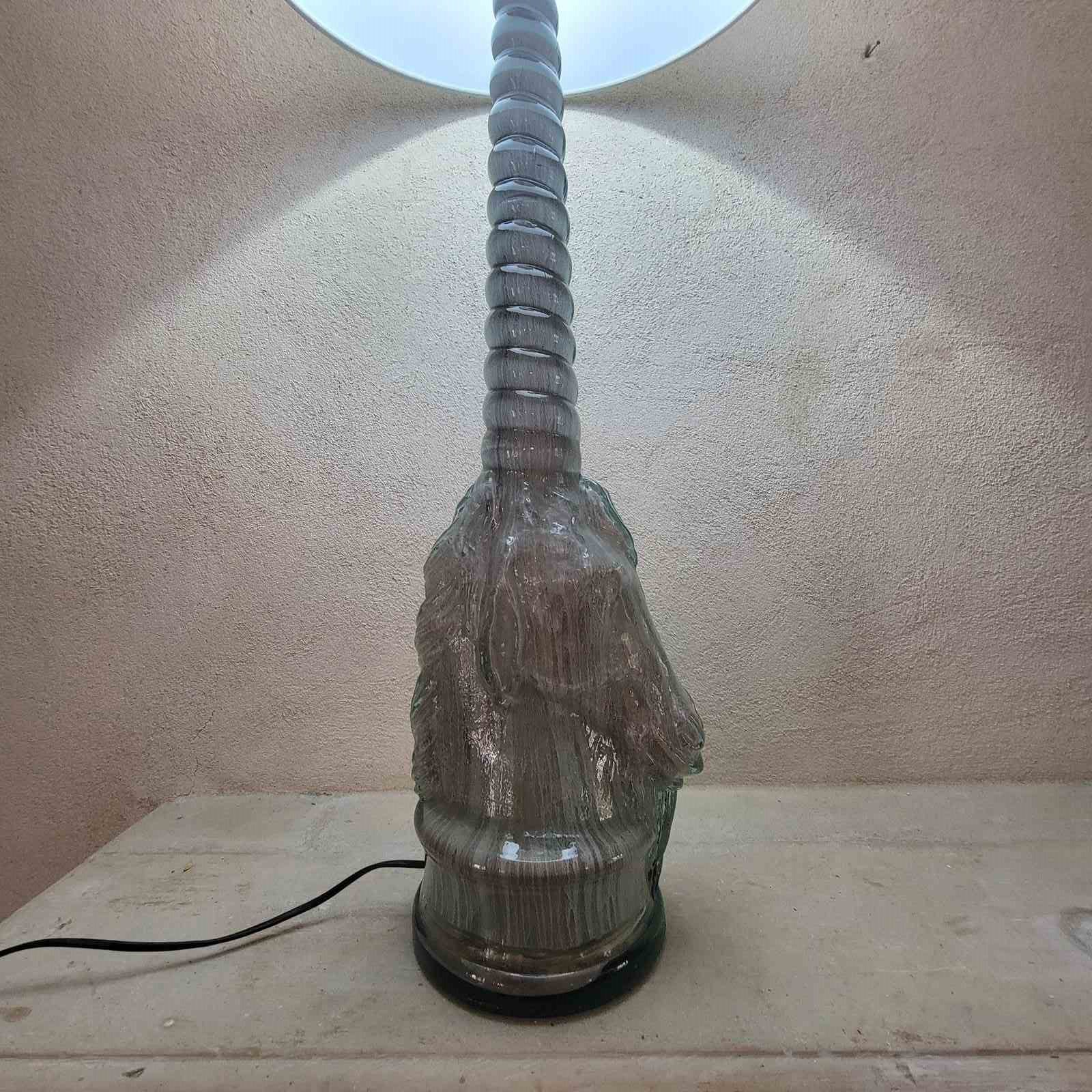 A spectacular glass lamp from the 1960's in the form of a unicorn. Made from a pale green grey molded glass, probably from Italy. Impressive height of 74cm with fitting and 94cm with shade. Shade not included but this is a standard readily available size , 26cm.