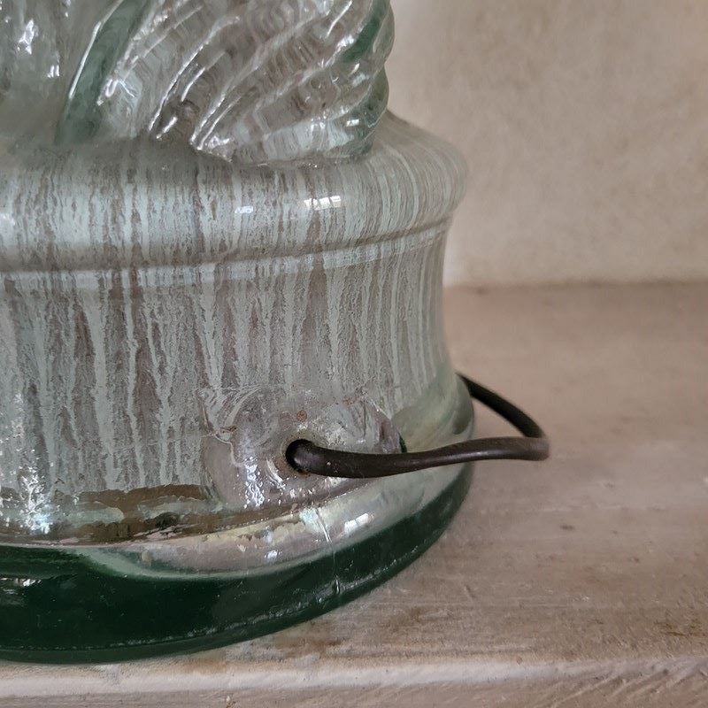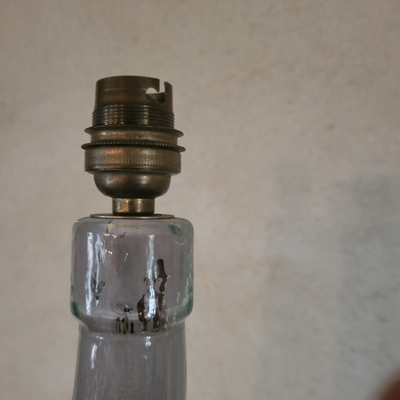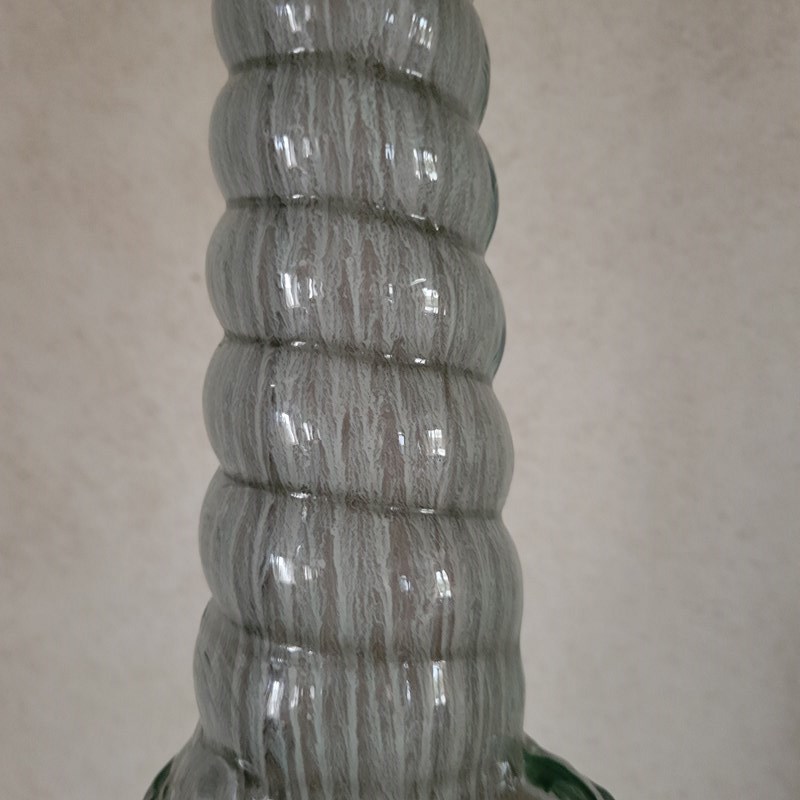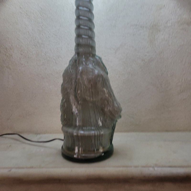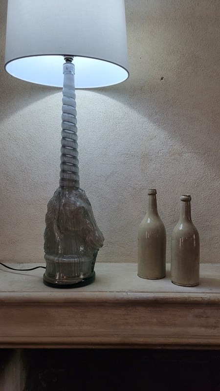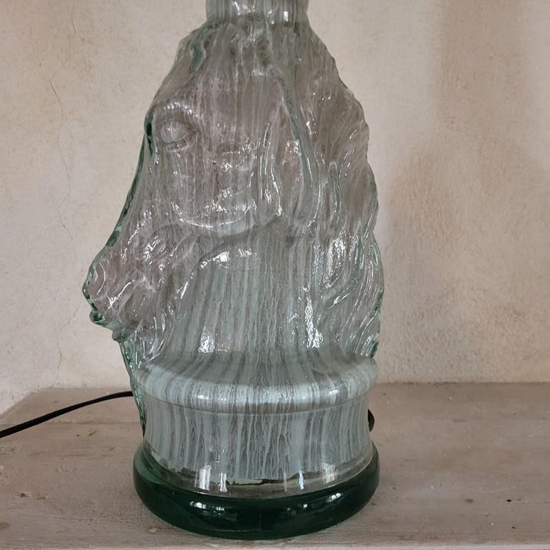 A spectacular glass lamp from the 1960's in the form of a unicorn. Made from a pale green grey molded glass, probably from Italy. Impressive height of 74cm with fitting and 94cm with shade. Shade not included but this is a standard readily available size , 26cm.
