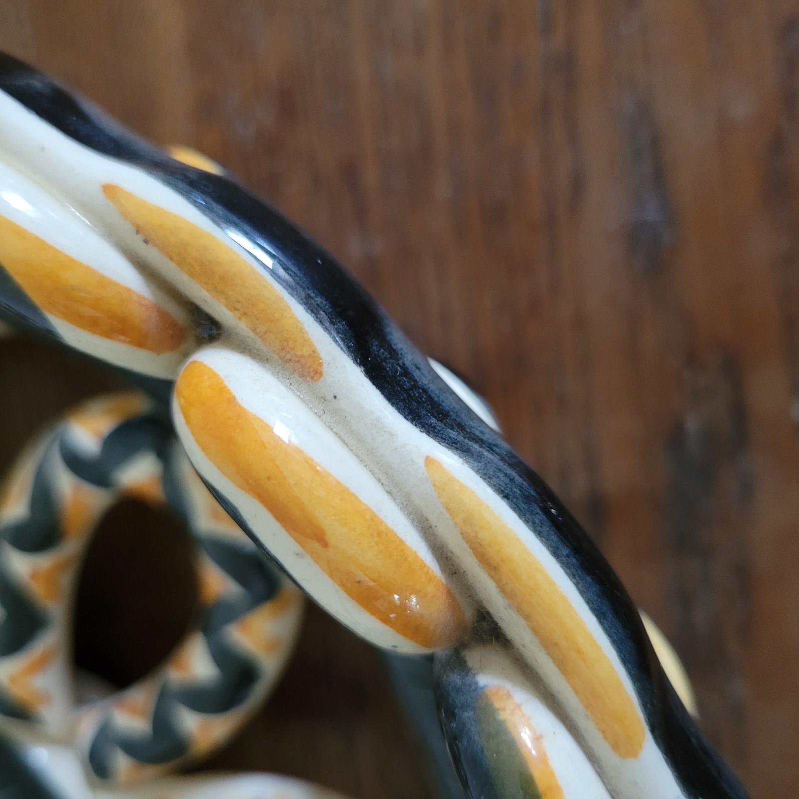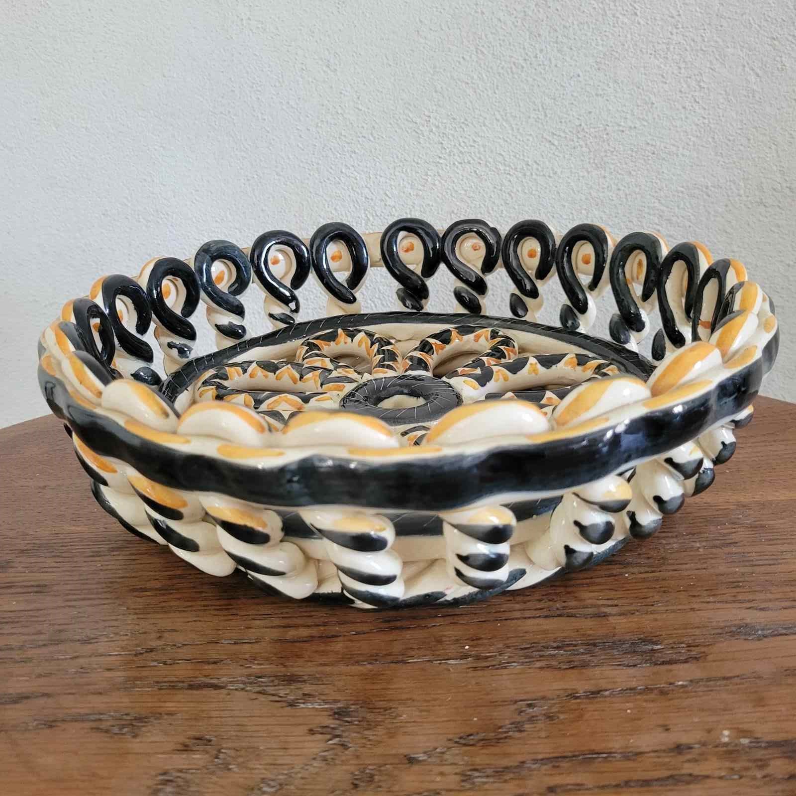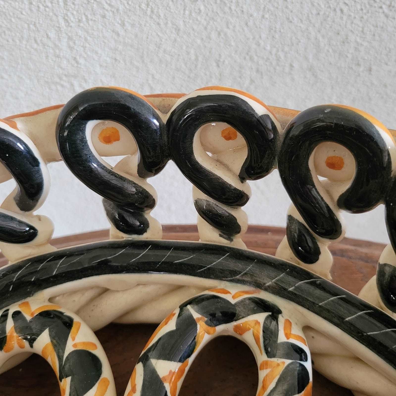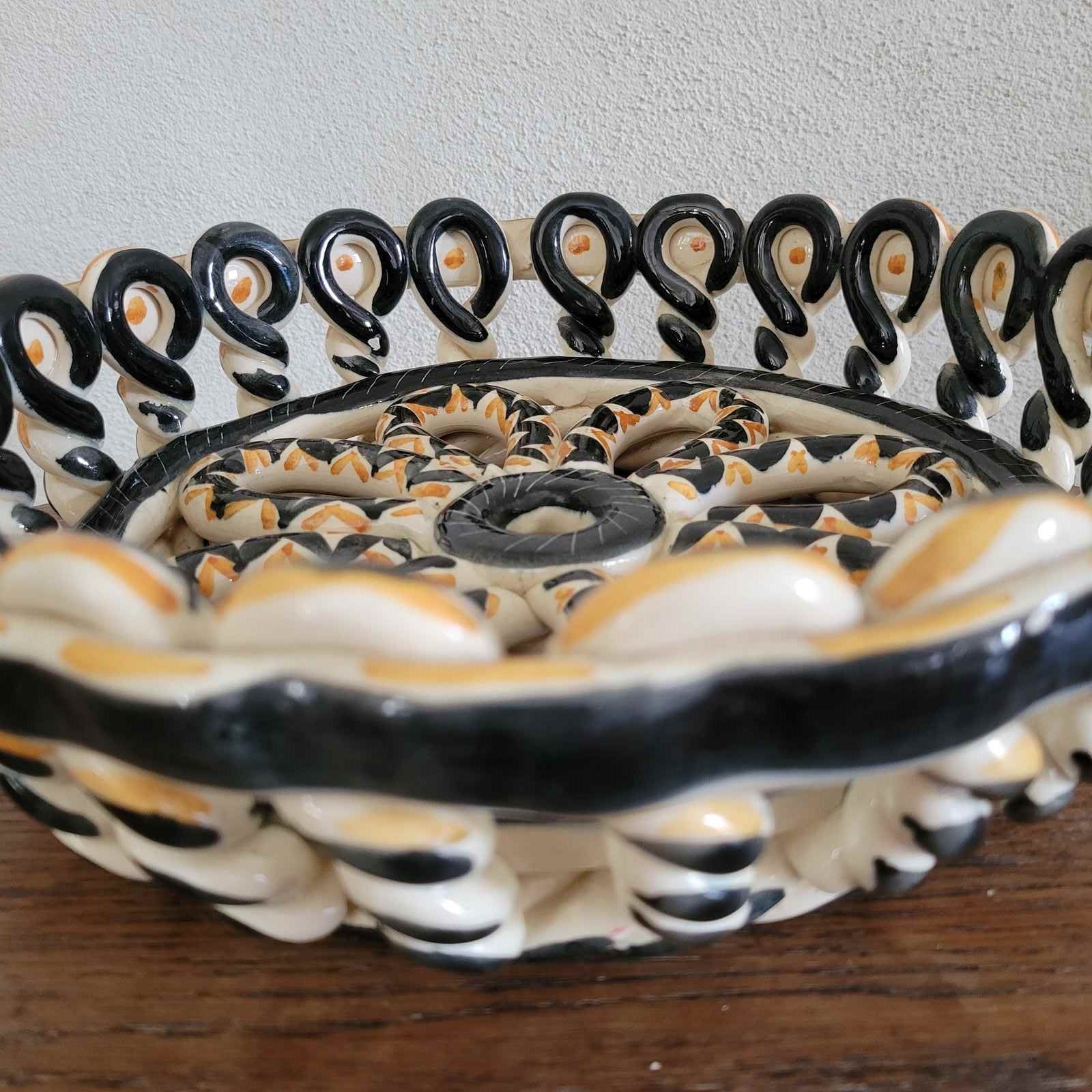 zed ceramic. Crafted in the southern French pottery village of Vallauris, famous for its collaborations with Picasso, this piece is signed by the Fase atelier. In rare perfect condition, it is made by hand plaiting clay, and then glazed and painted in superb pattern and coloration. A beautiful decorative item for the home. 30 x 7cm