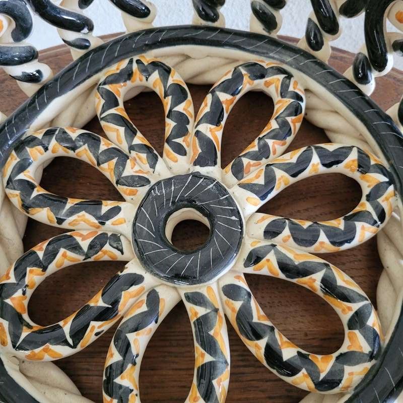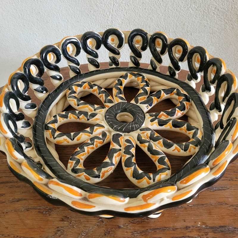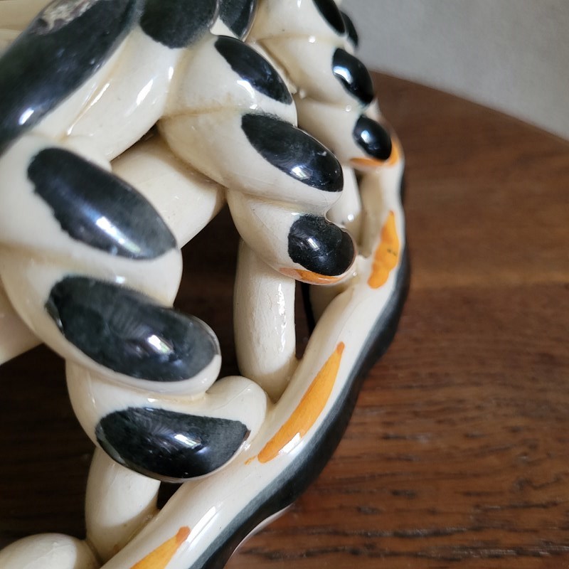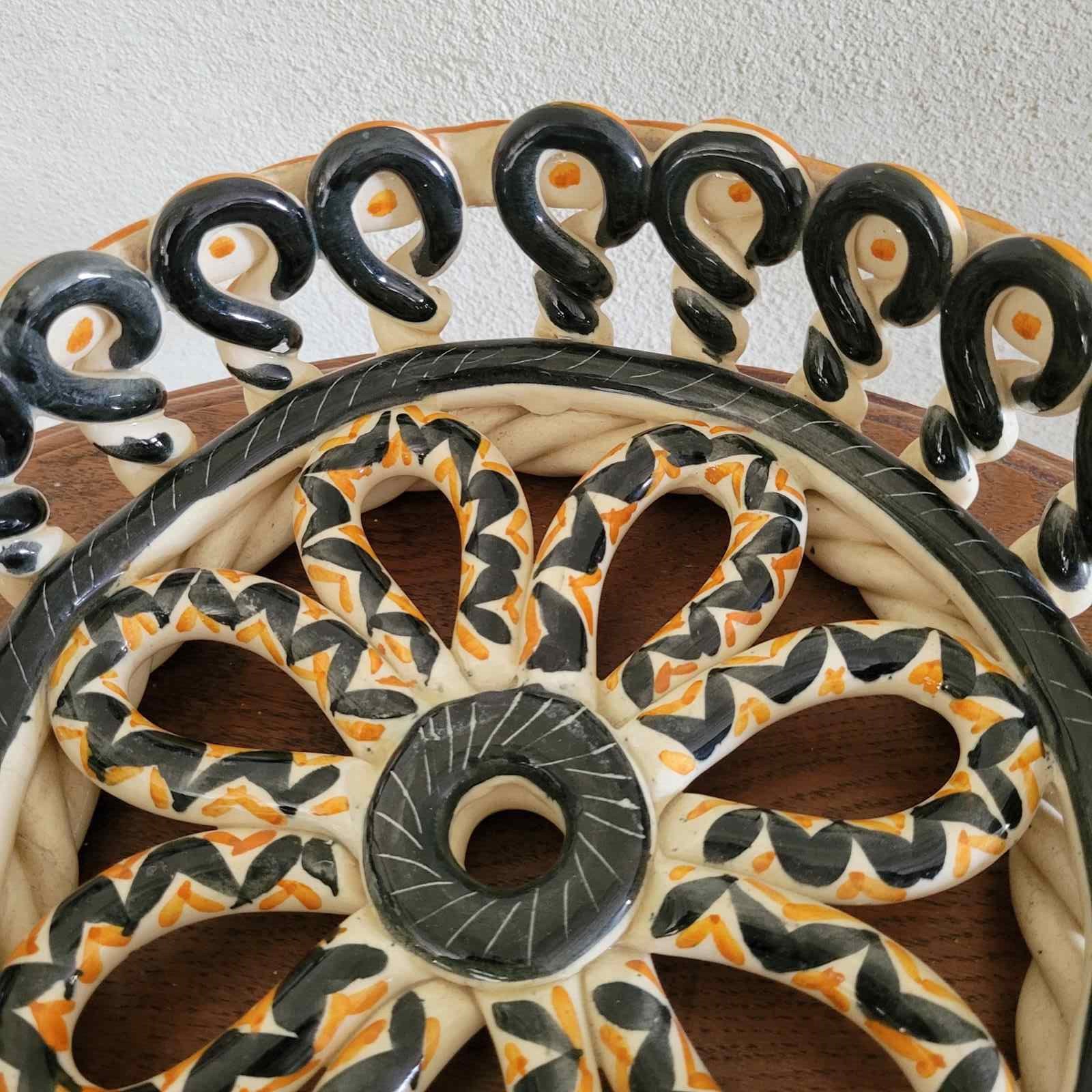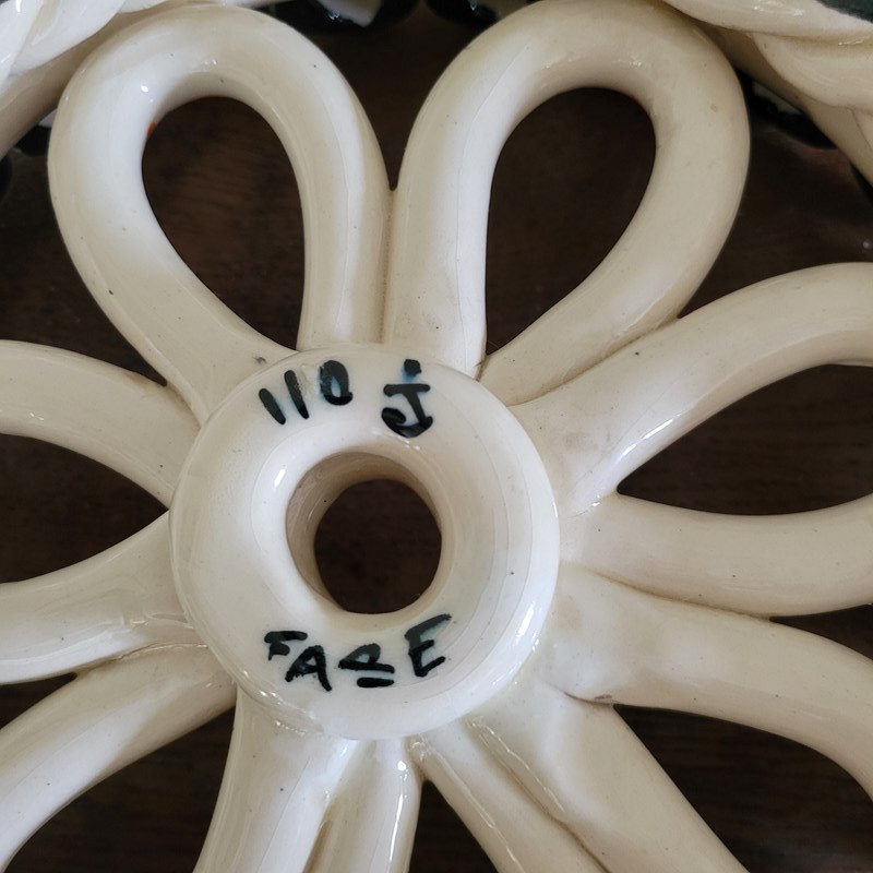 zed ceramic. Crafted in the southern French pottery village of Vallauris, famous for its collaborations with Picasso, this piece is signed by the Fase atelier. In rare perfect condition, it is made by hand plaiting clay, and then glazed and painted in superb pattern and coloration. A beautiful decorative item for the home. 30 x 7cm
