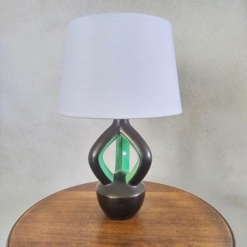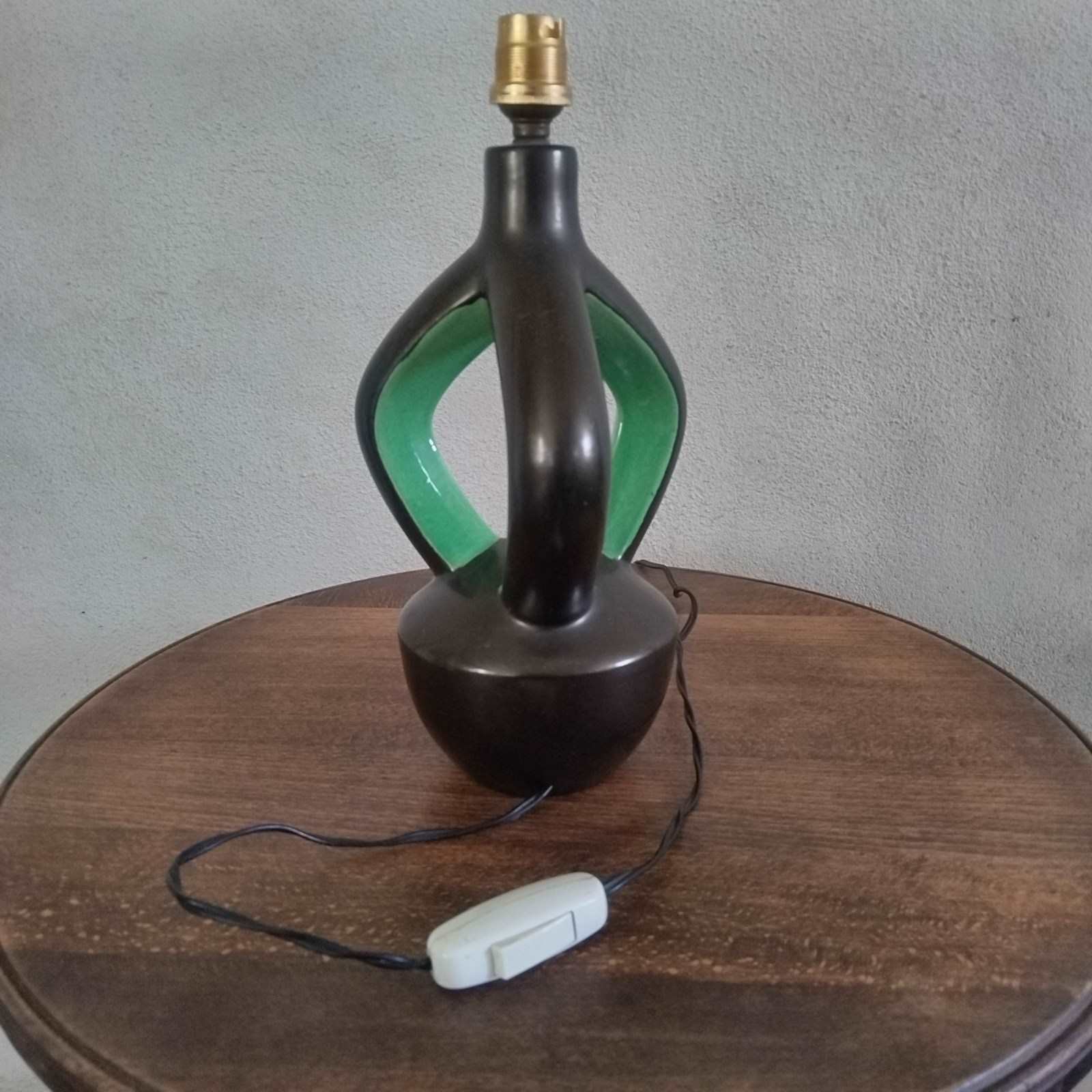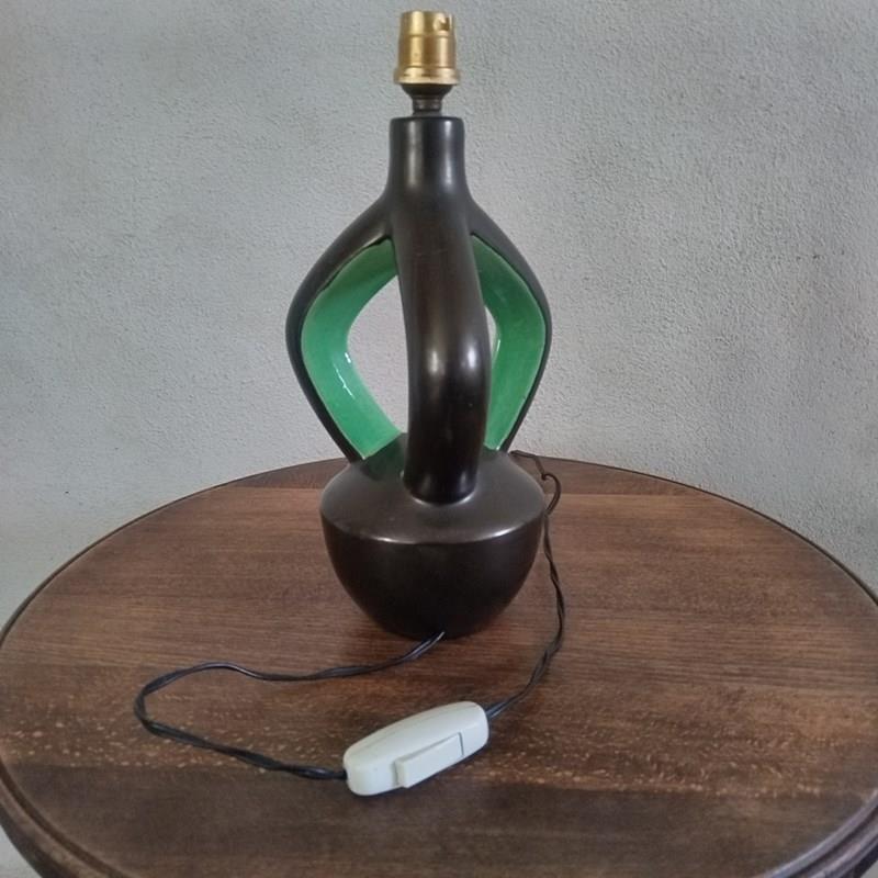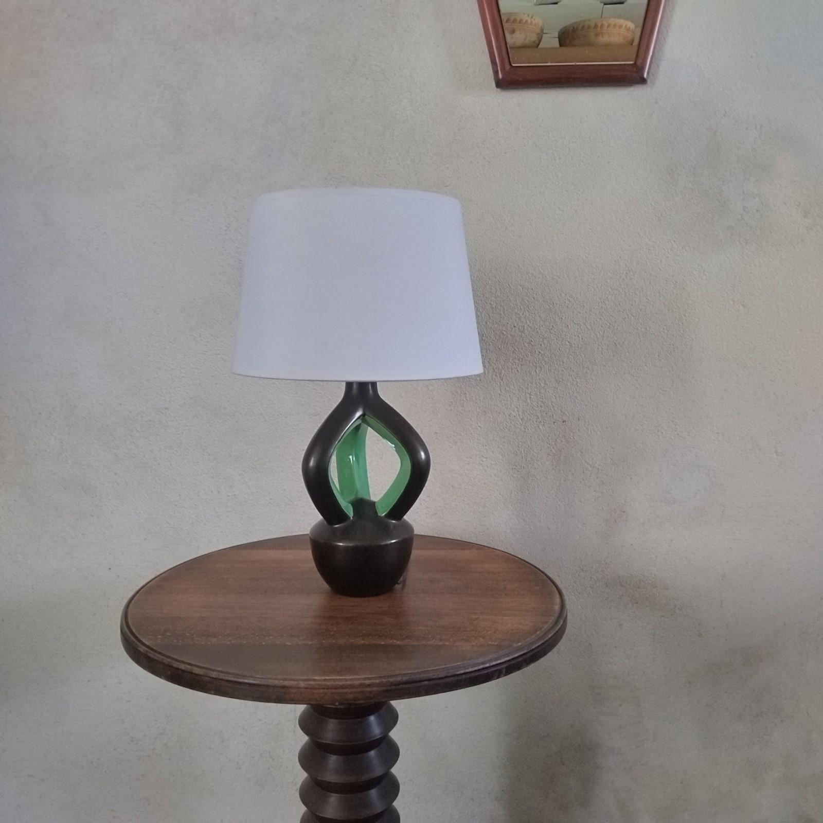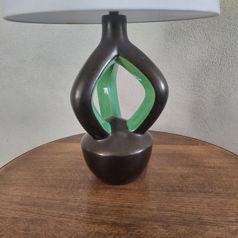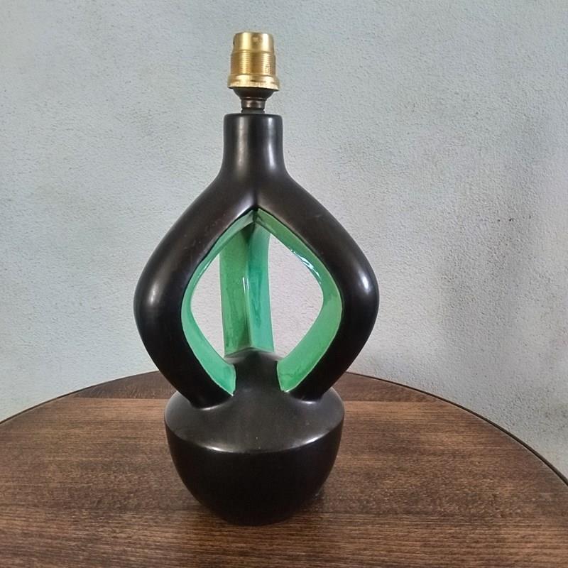 A wonderful French table lamp by Elchinger from about 1960. With a ceramic sculptural form, glazed in near black with green inside the 3 supports, the lamp is super stylish for any room. Sold without lampshade and ready to use.
