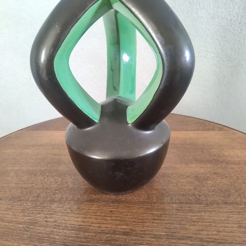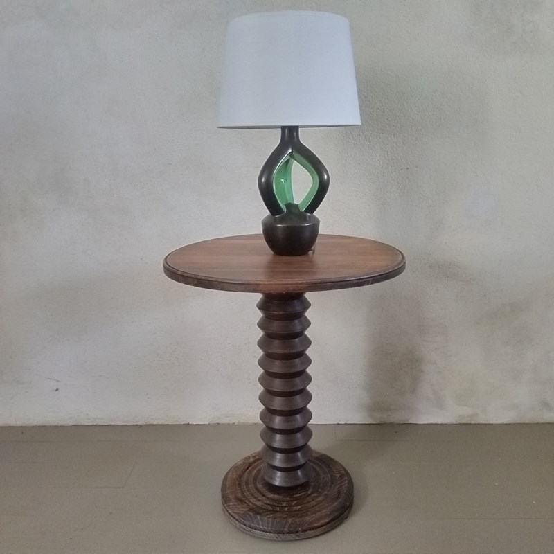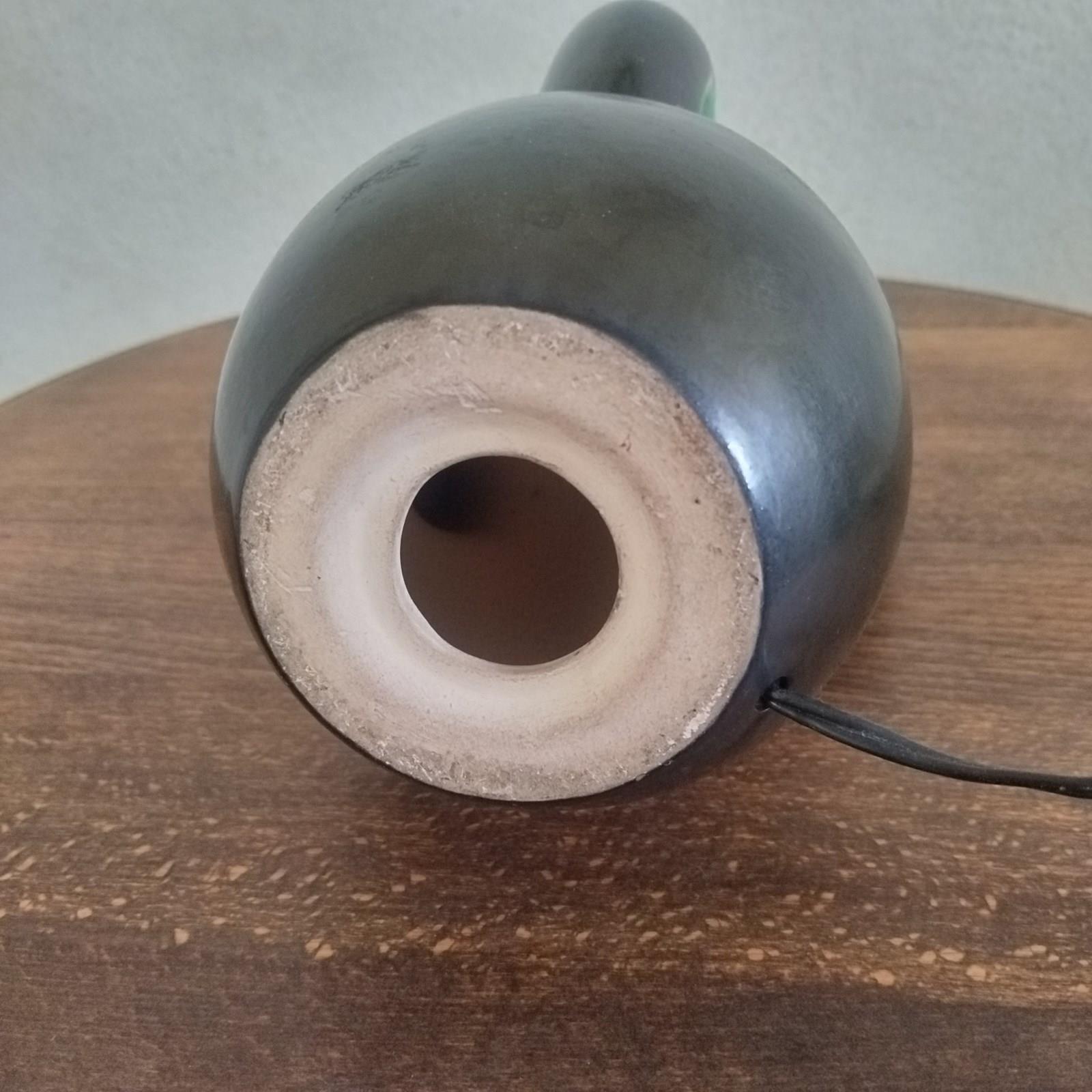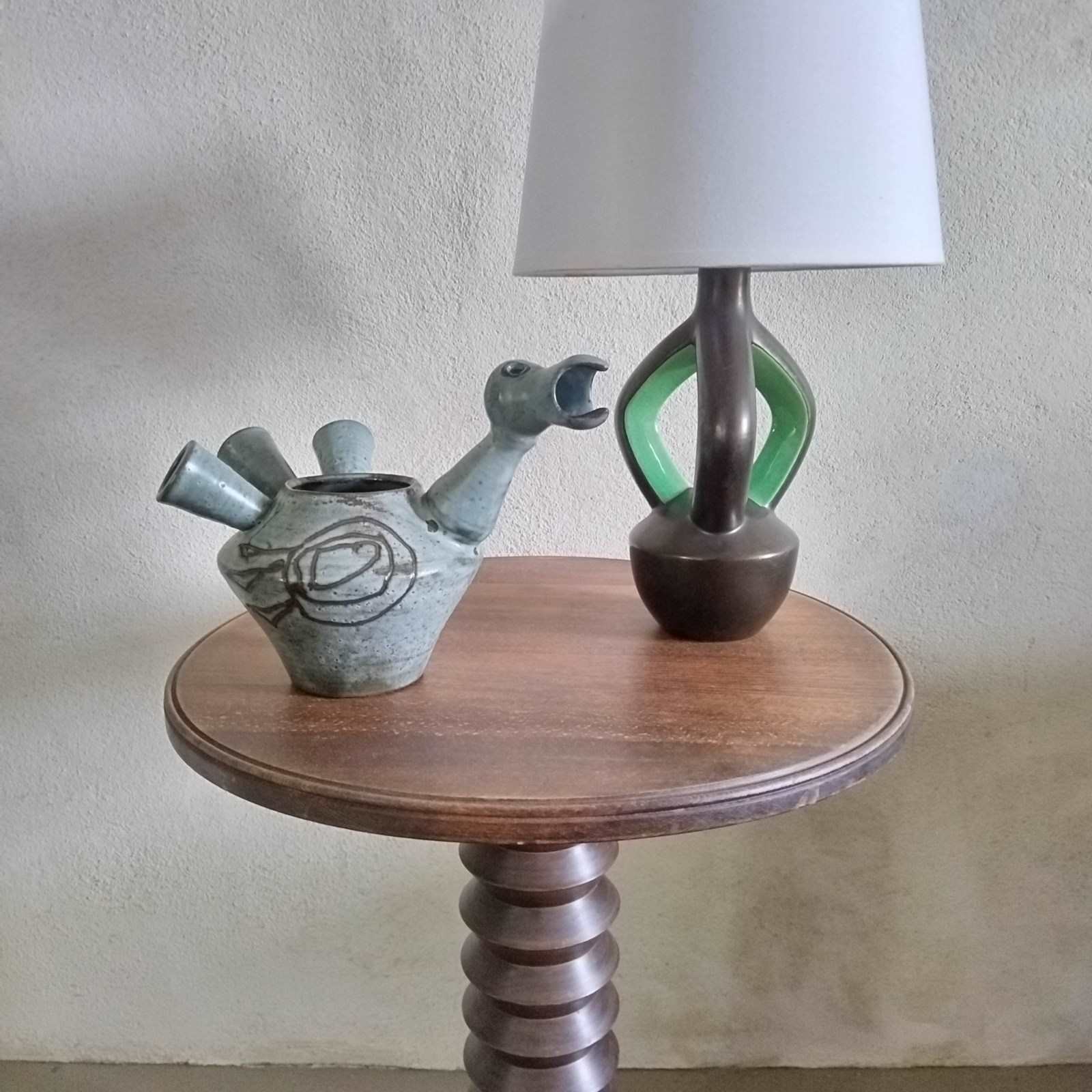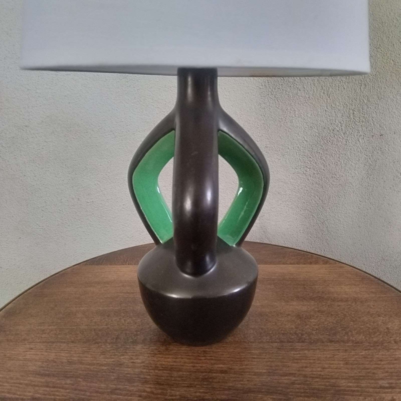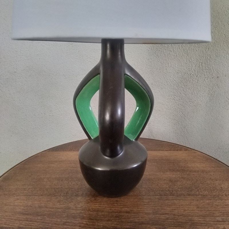 A wonderful French table lamp by Elchinger from about 1960. With a ceramic sculptural form, glazed in near black with green inside the 3 supports, the lamp is super stylish for any room. Sold without lampshade and ready to use.