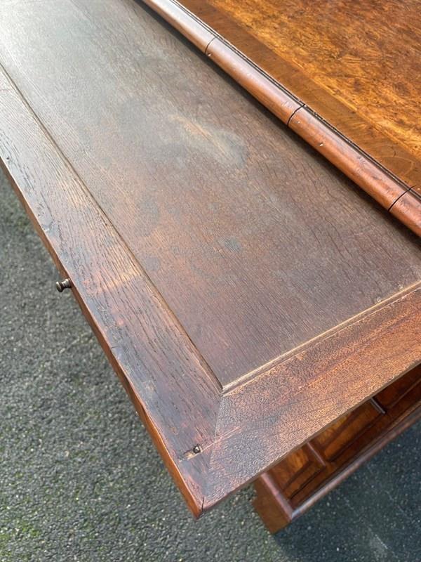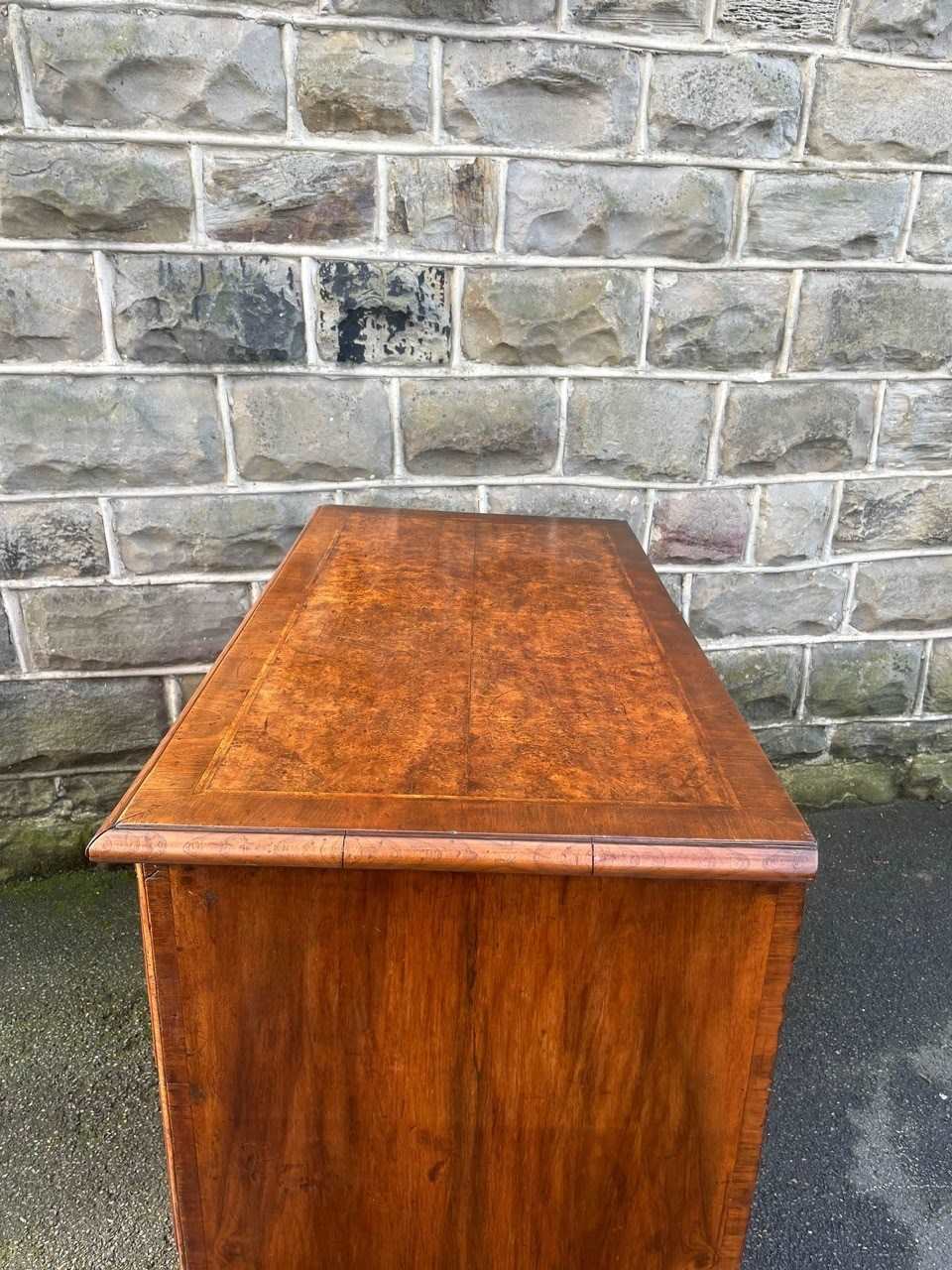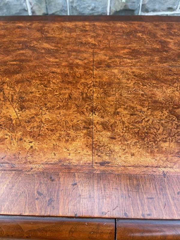 Lovely size & proportions & great colour. Burr walnut top with a crossbanded border & herringbone inlay, pull out slide, 2 small over 2 larger draws which are all burr walnut fronted with herringbone inlay & brass handles & escutcheons. All the draws are oak lined. Polished walnut sides standing on bracket feet.