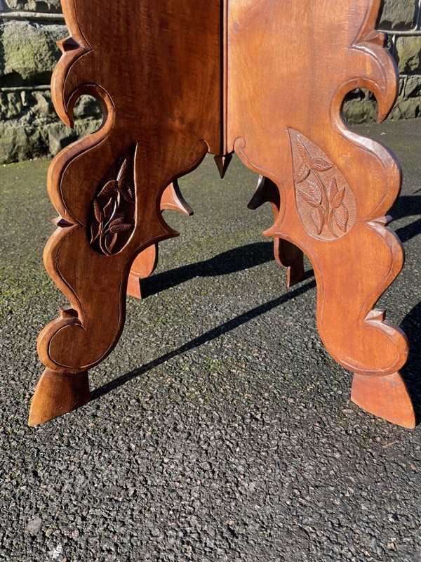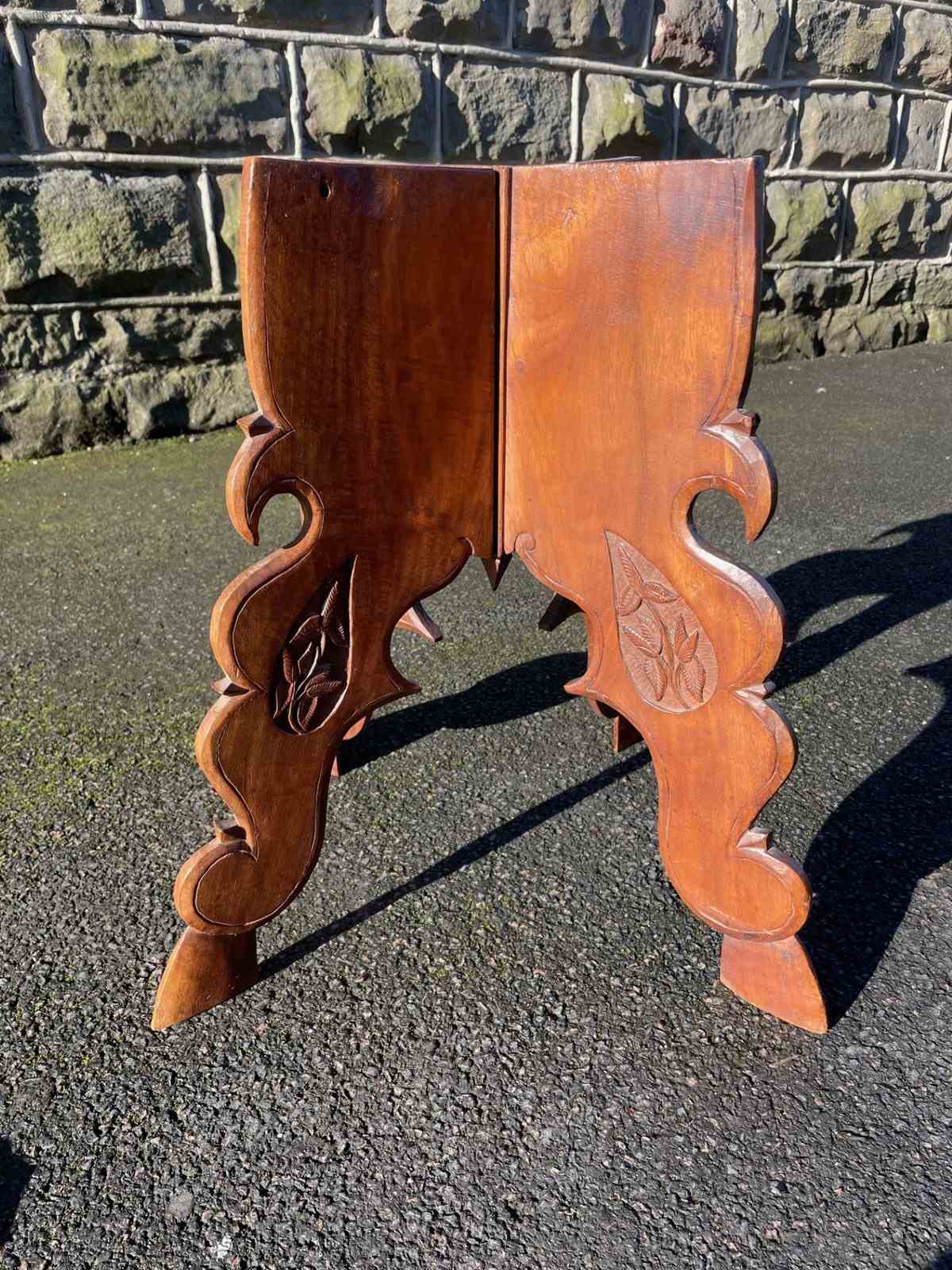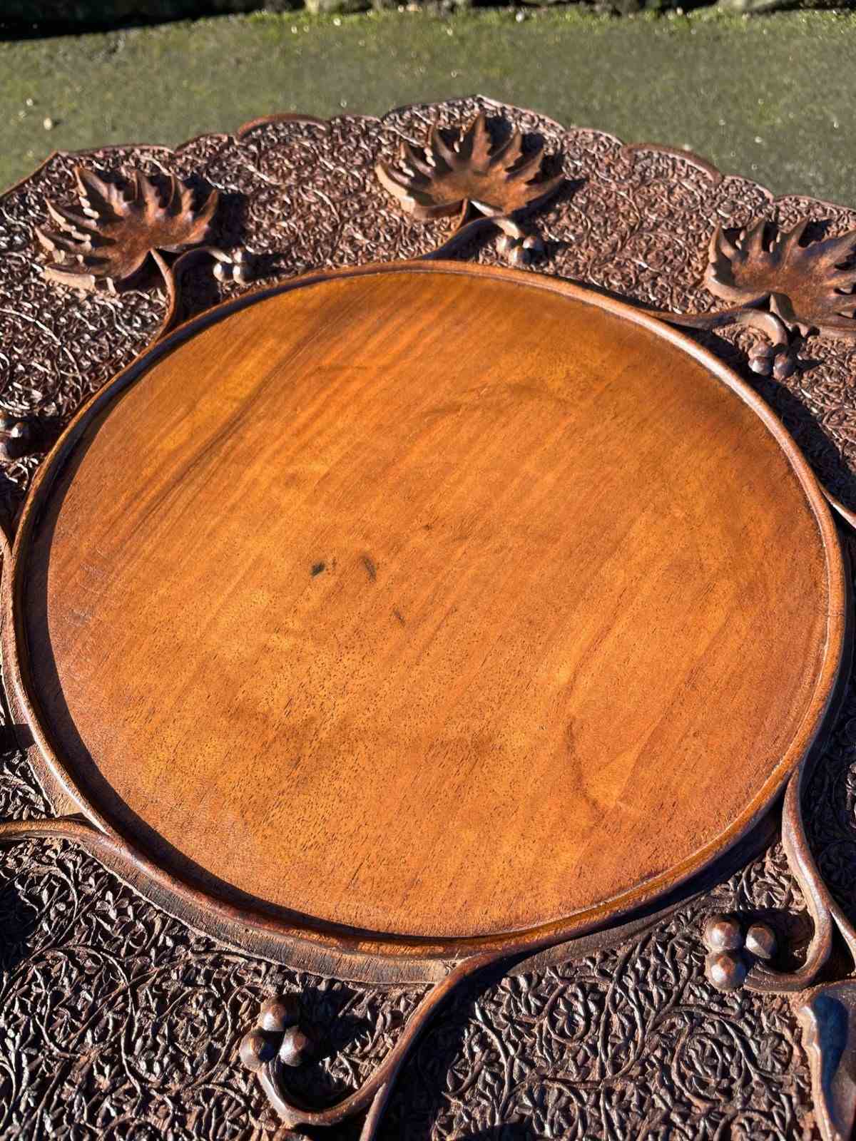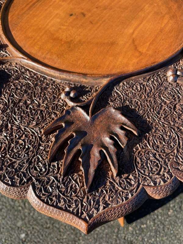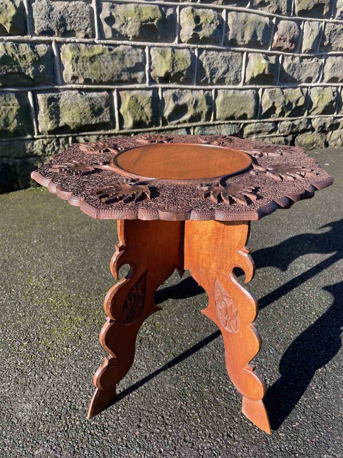The decorative teak top heavily carved with leaves. The shaped folding base having similar carved detail. Wonderful colour,