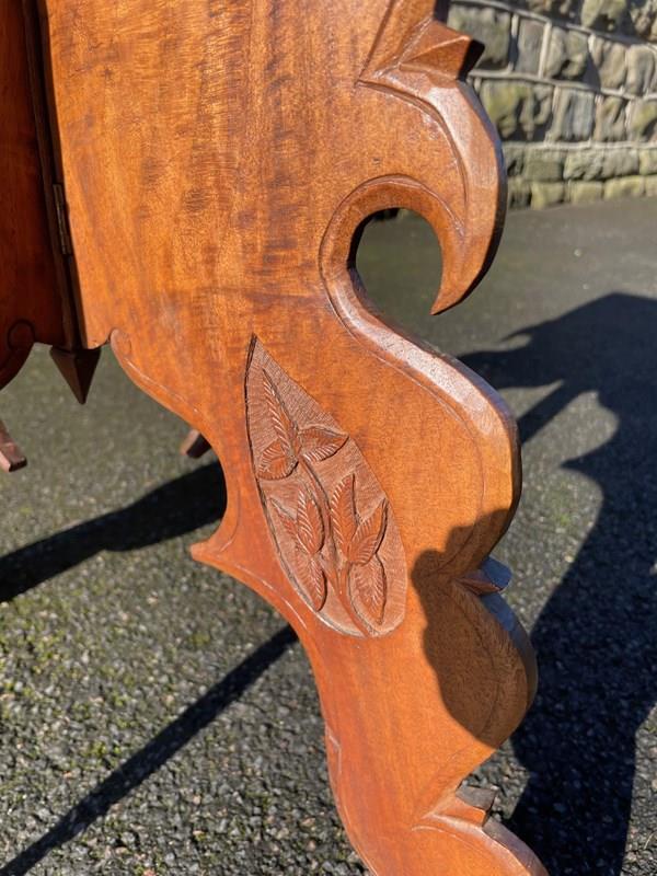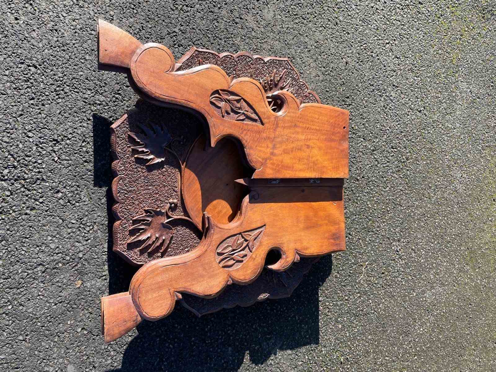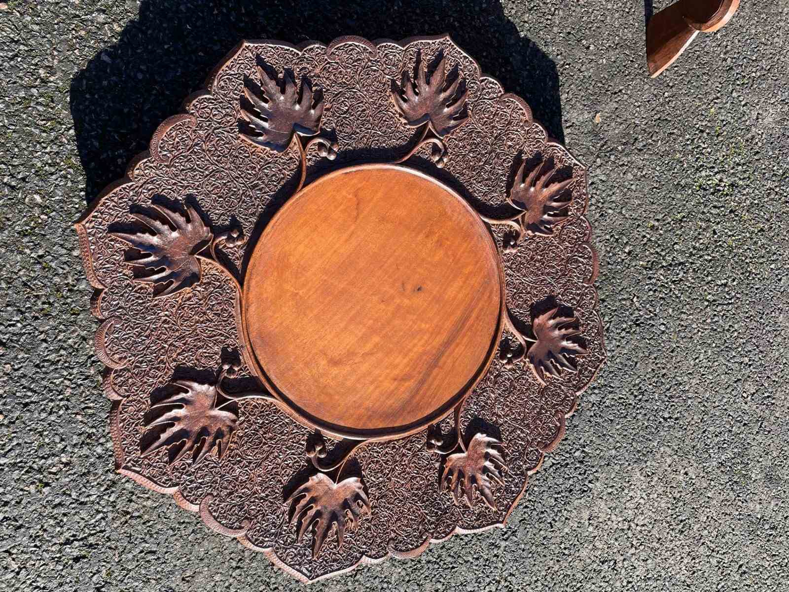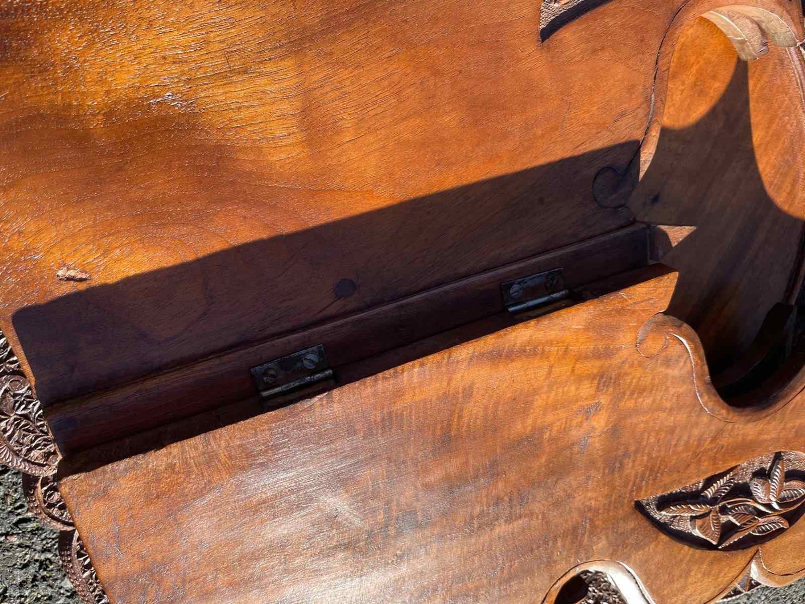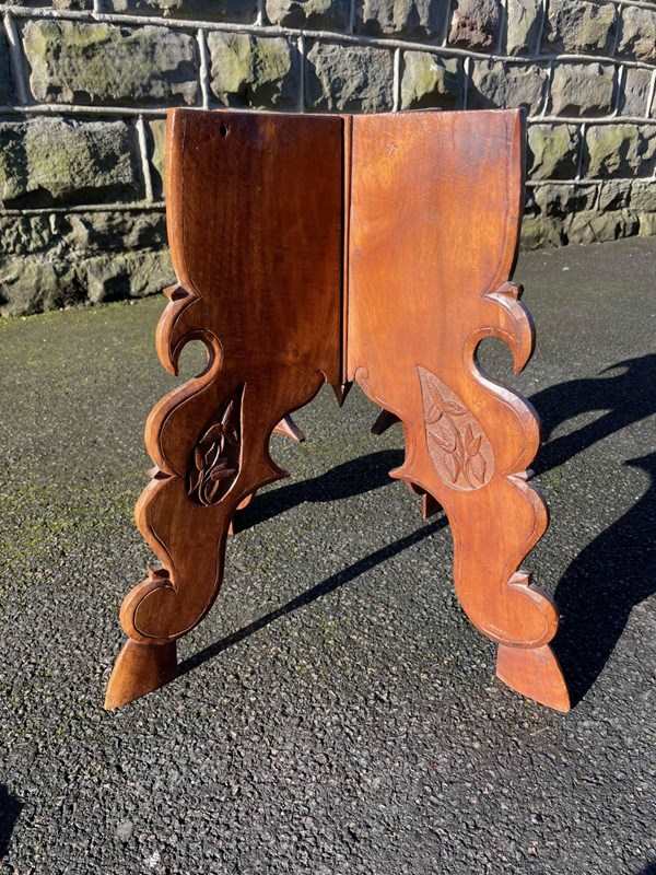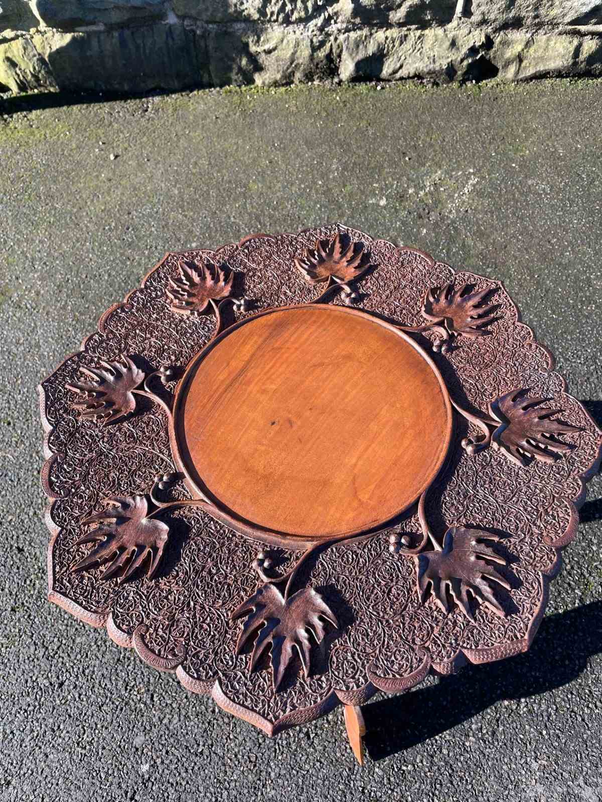 The decorative teak top heavily carved with leaves. The shaped folding base having similar carved detail. Wonderful colour,