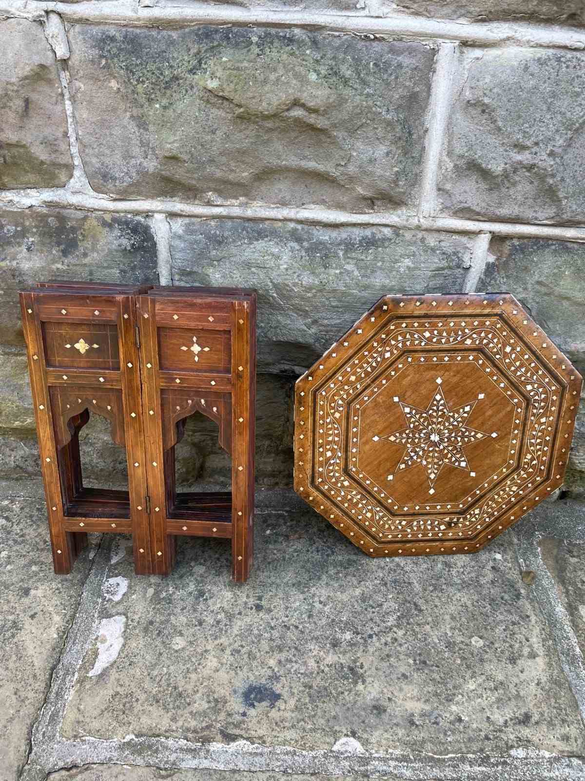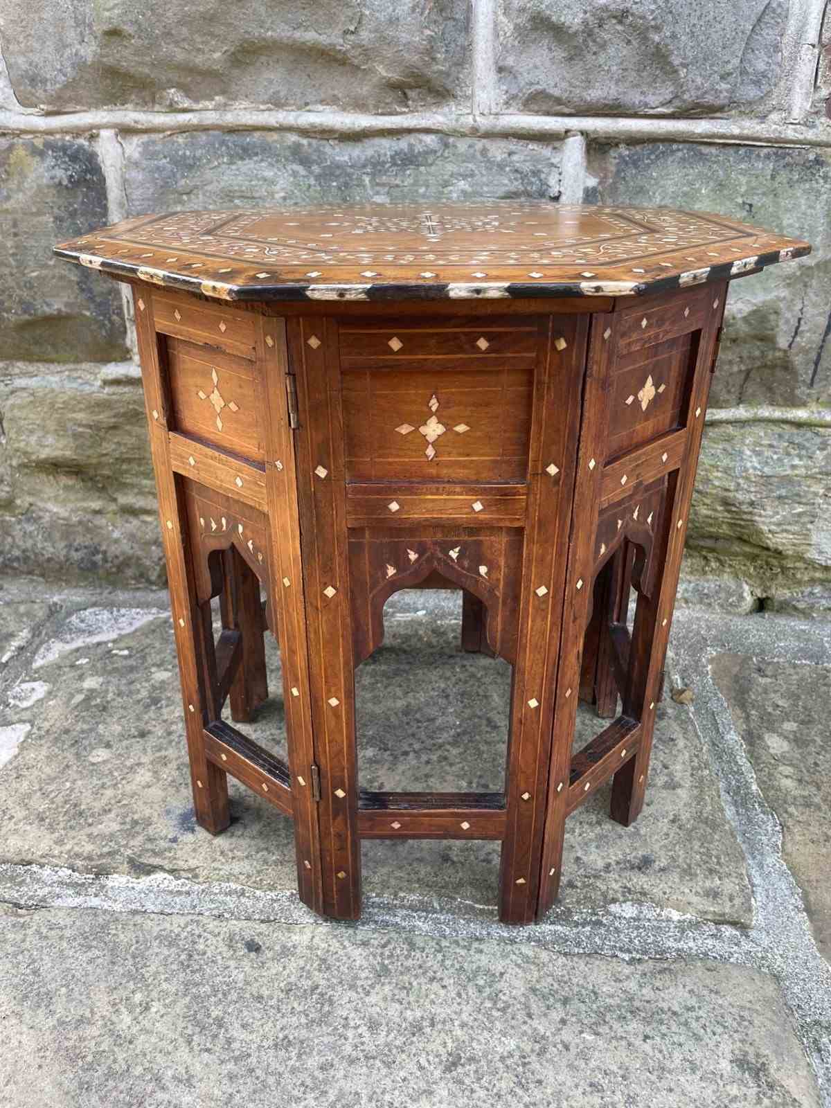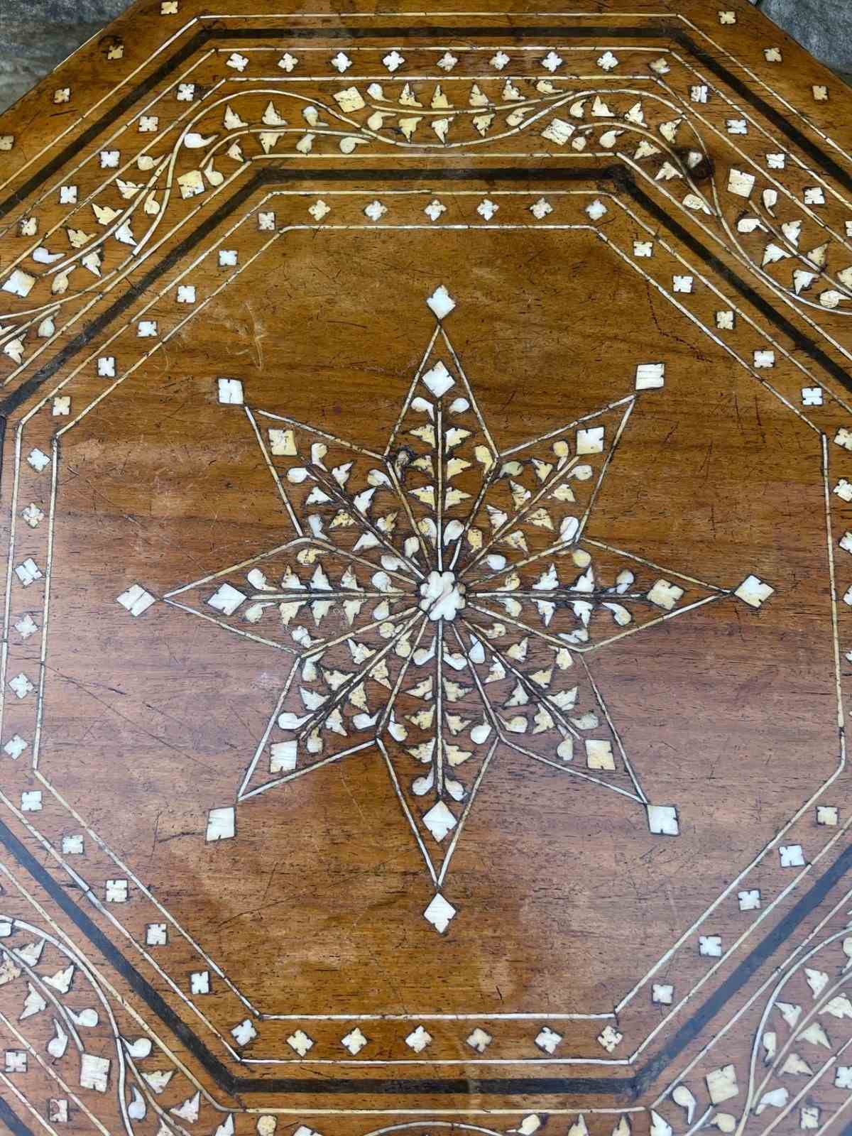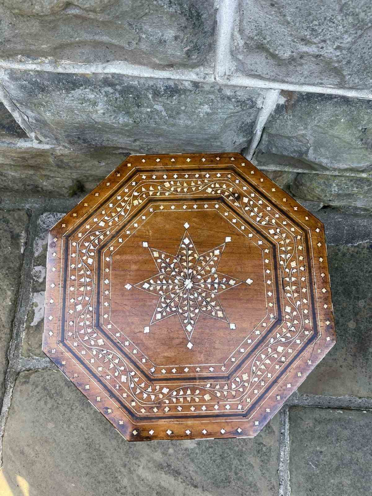 The top inlaid with bone, ebony, & boxwood, standing on a folding moorish style base with matching inlaid decoration