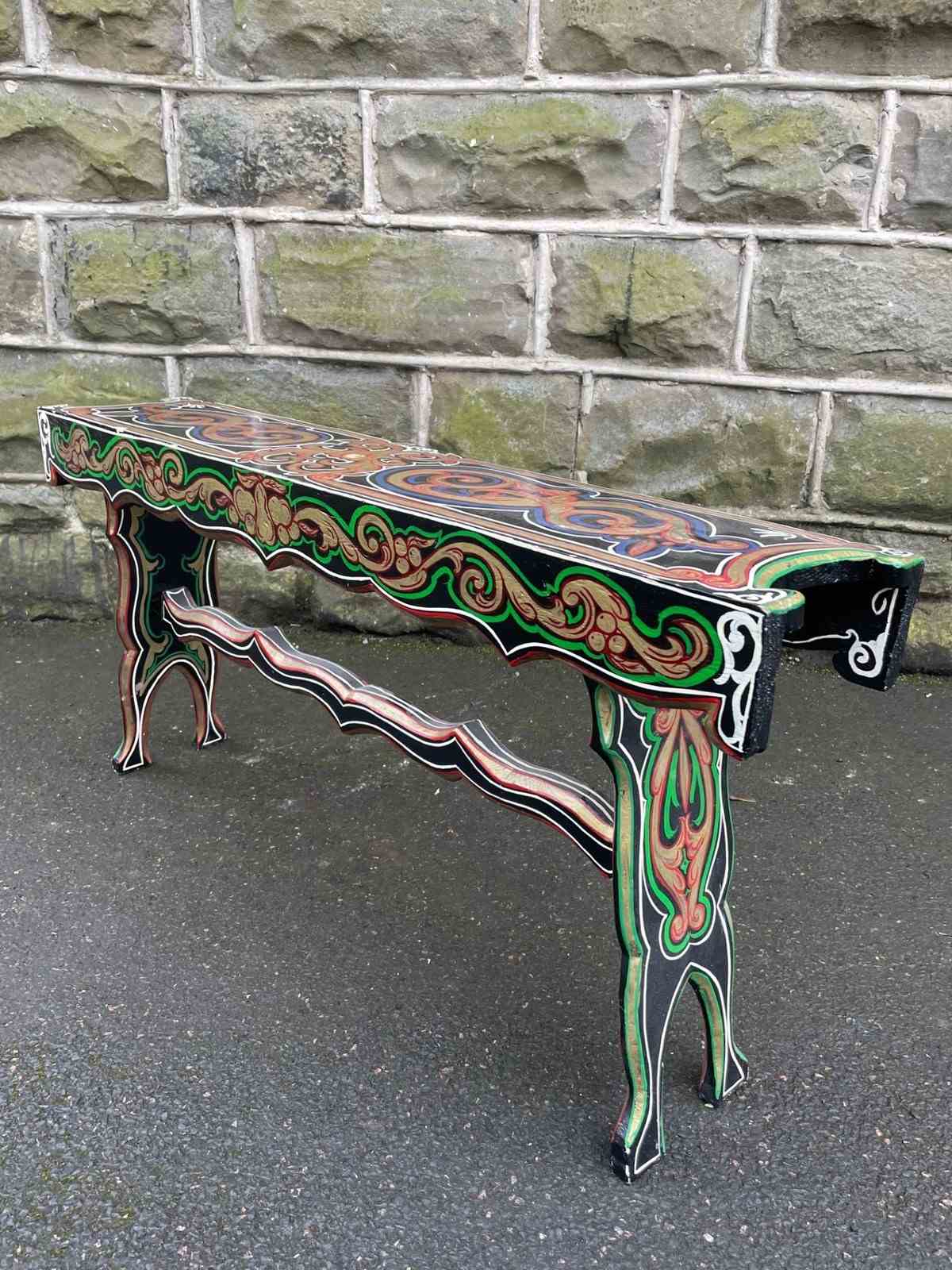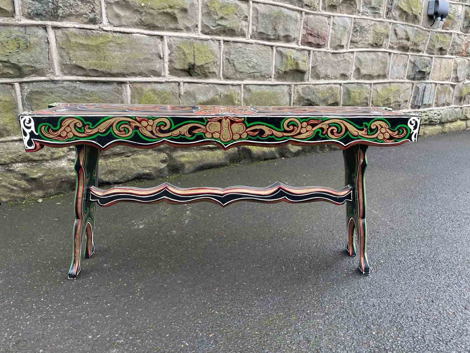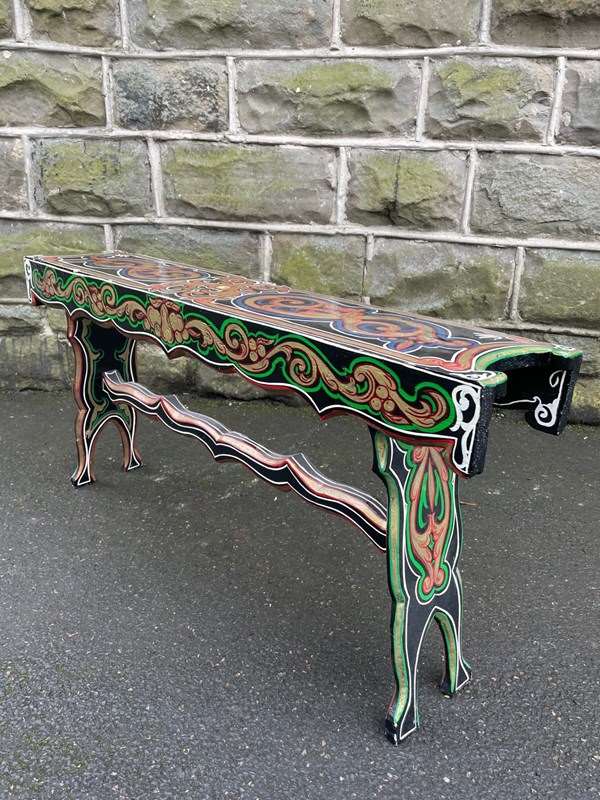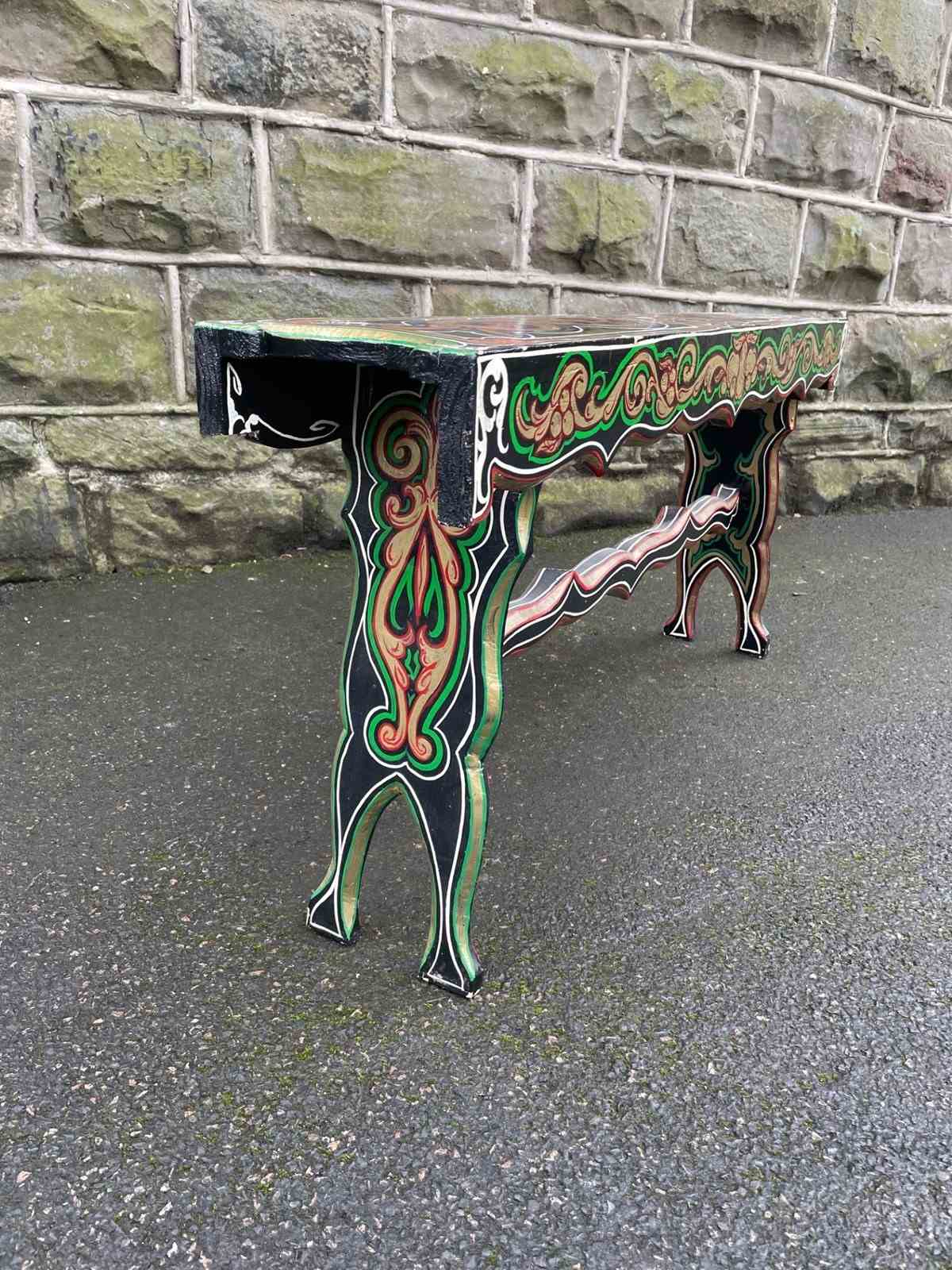 Original pine long stool which has painted decoration like the bargeware or gypsy style pieces of that period.