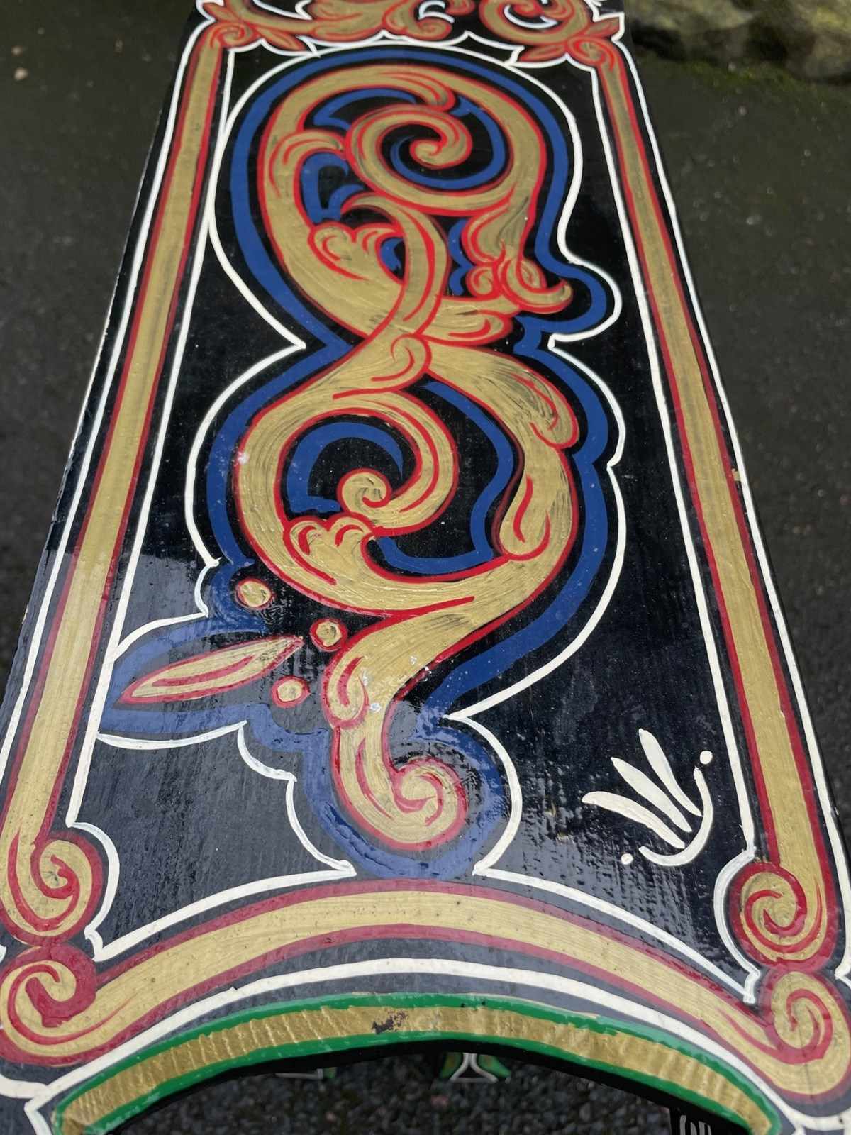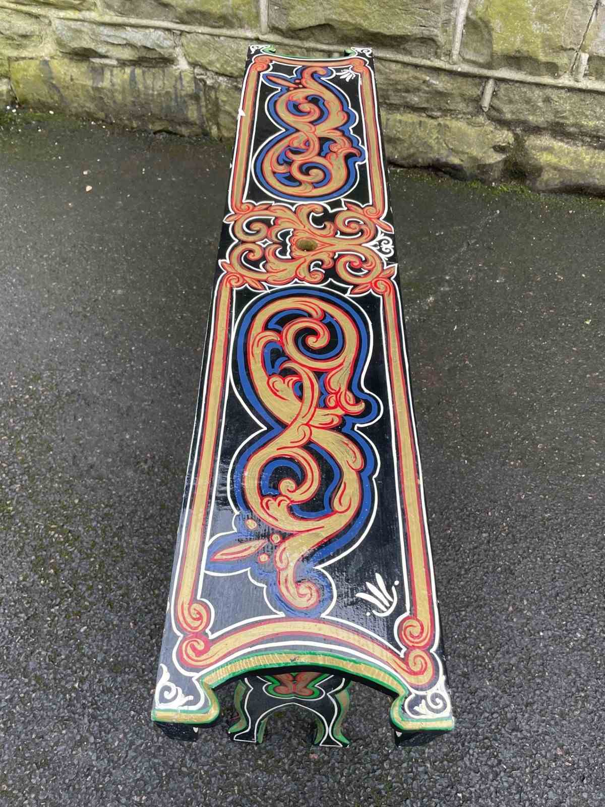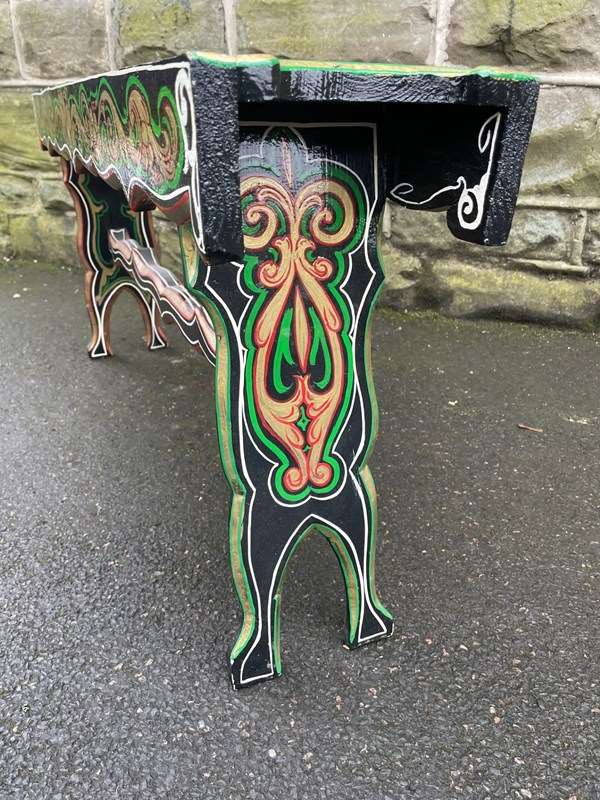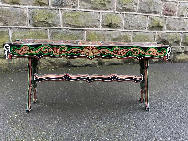 Original pine long stool which has painted decoration like the bargeware or gypsy style pieces of that period.