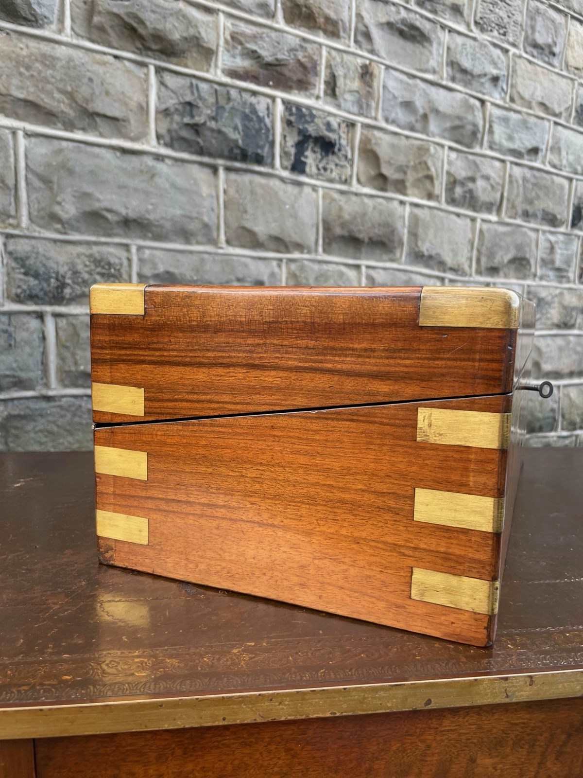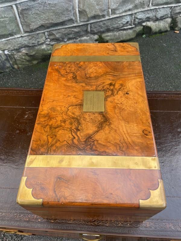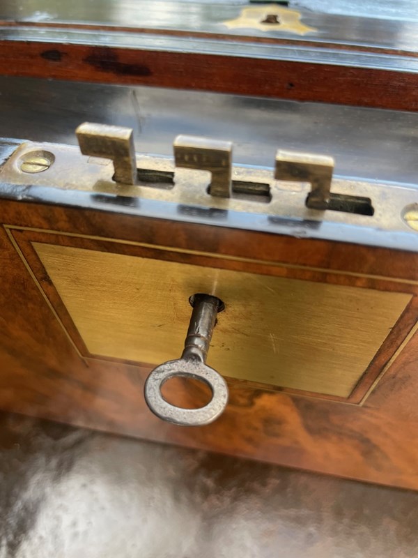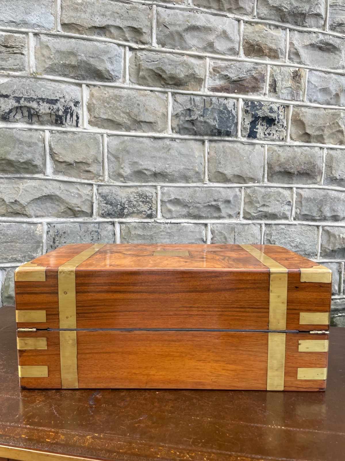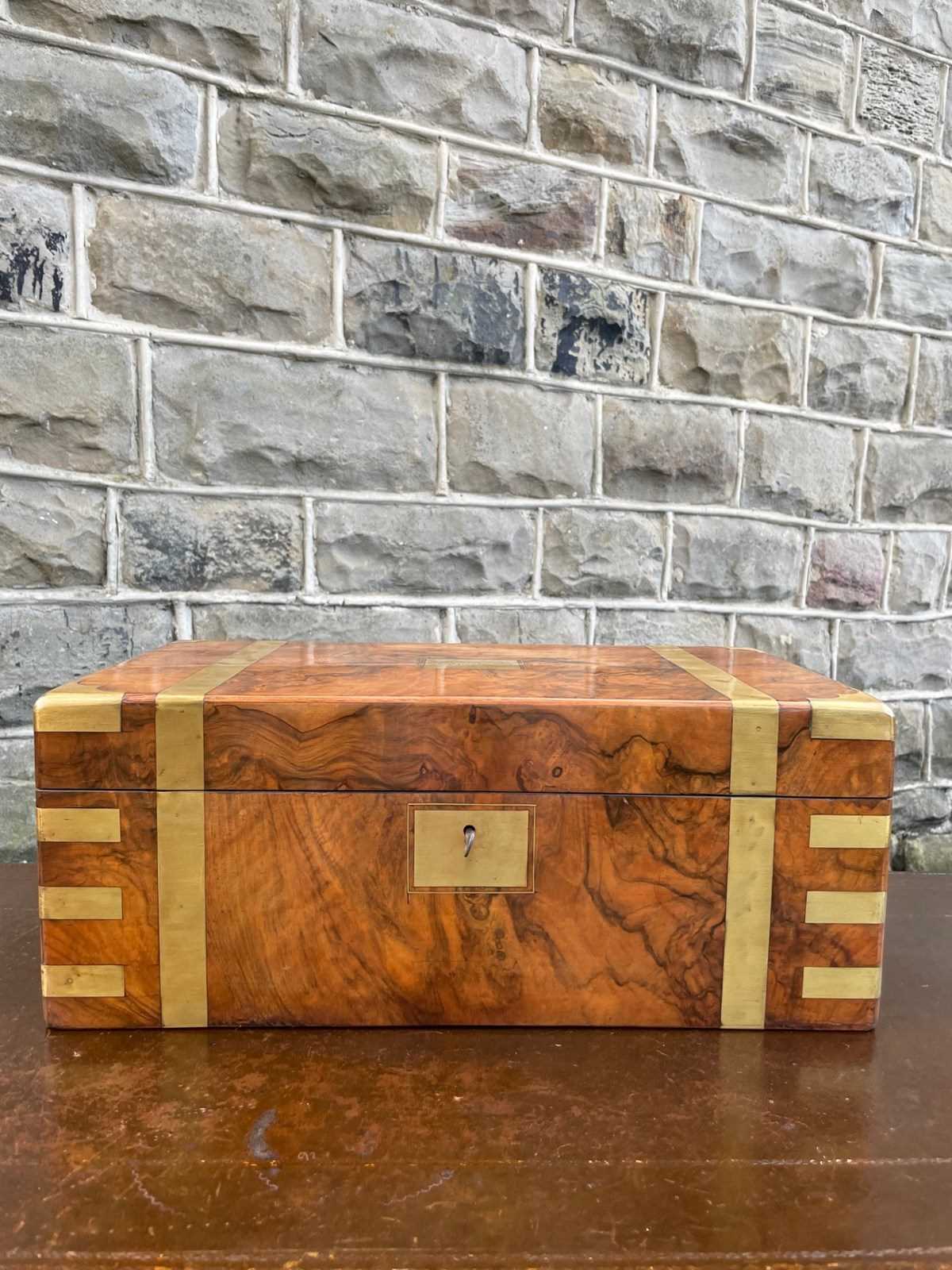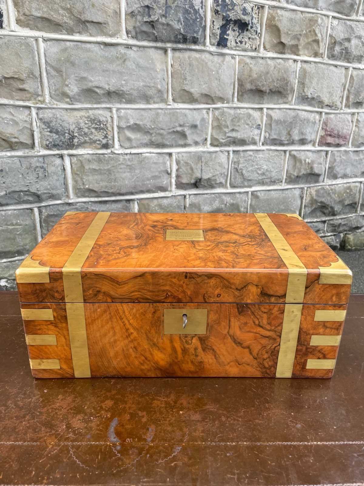In burr walnut having brass tablet to the top and similar escutcheon. Brass bound straps and corners. Inside it has a tooled leather writing slope with lift up flaps, 2 original ink wells, pen tray, lidded compartment. It has 3 secret draws under the bottom writing flap. Comes with 2 original keys to lock outer box and inner flap.