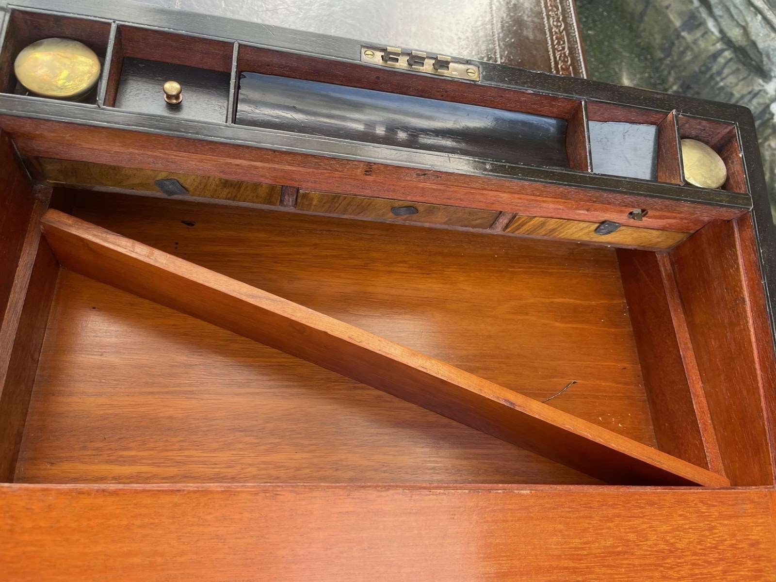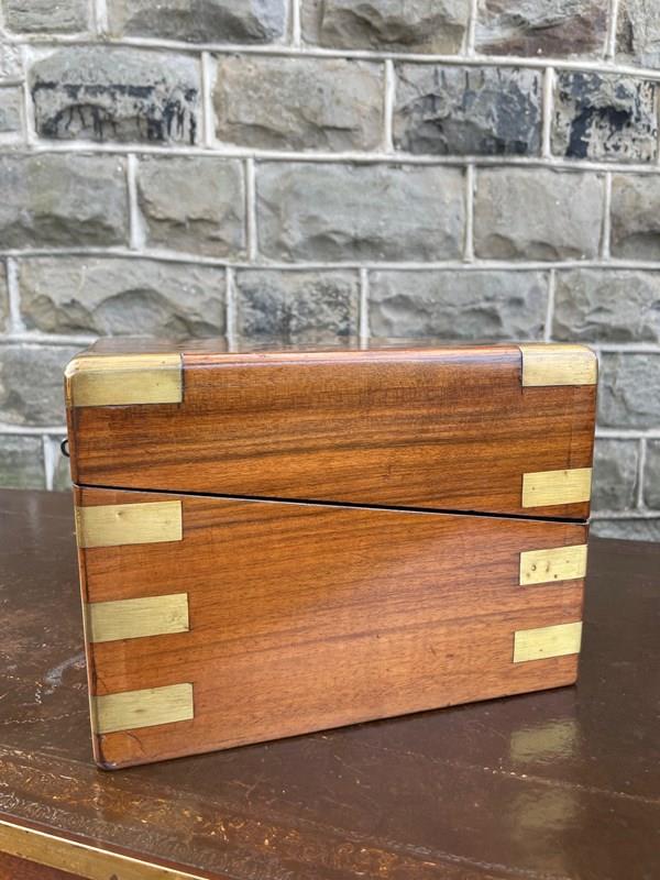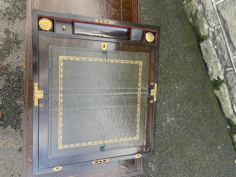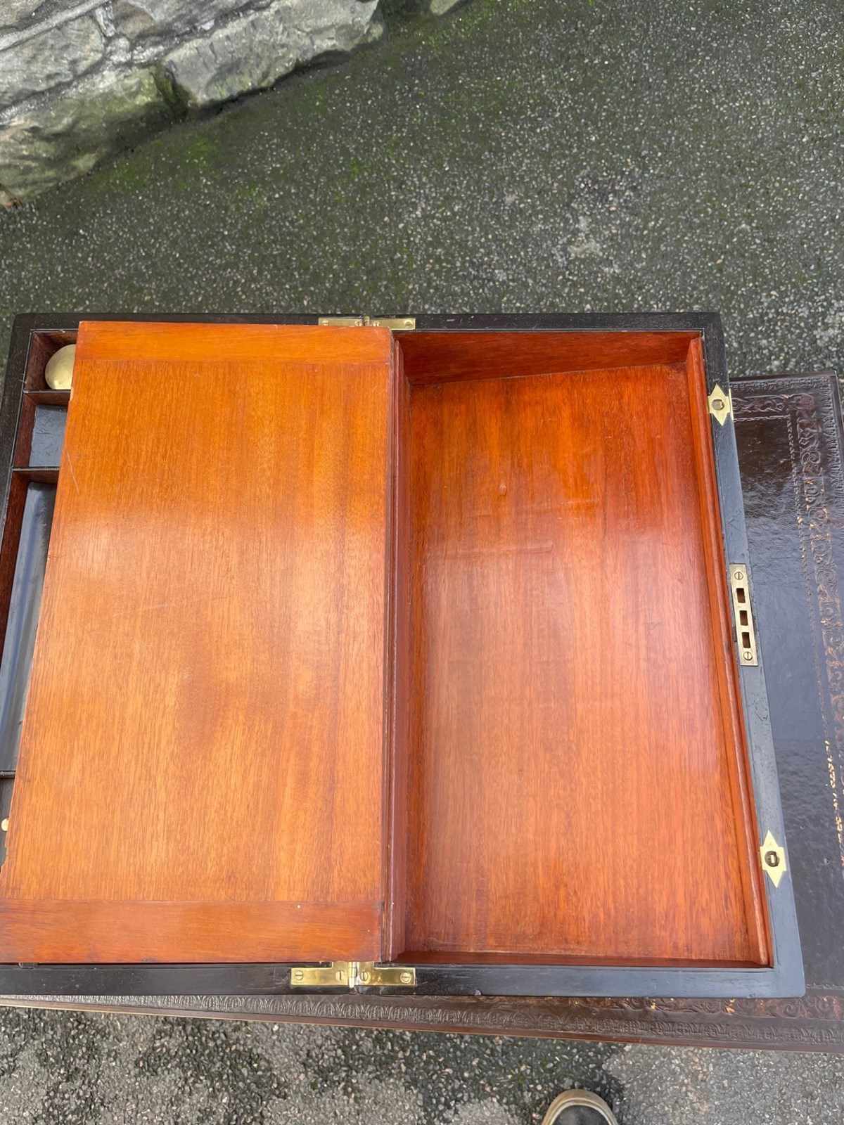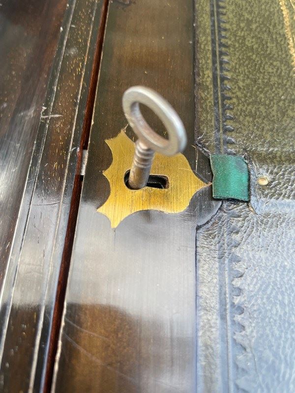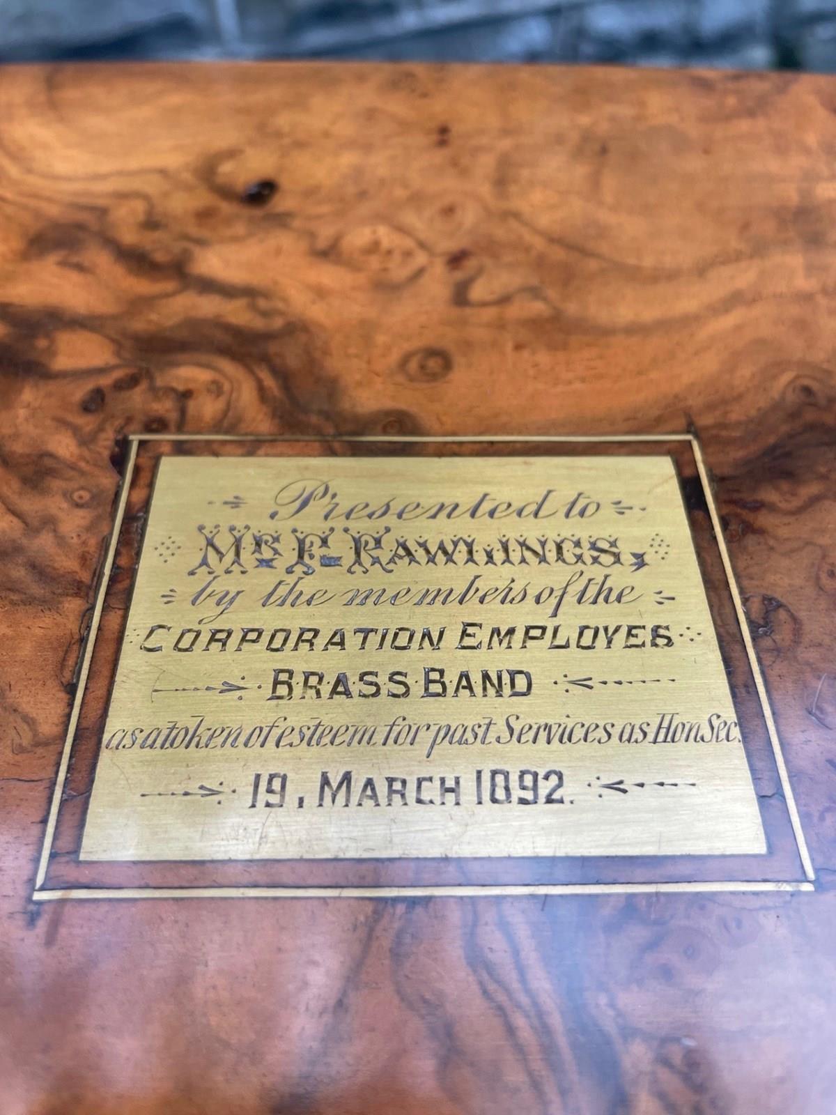 In burr walnut having brass tablet to the top and similar escutcheon. Brass bound straps and corners. Inside it has a tooled leather writing slope with lift up flaps, 2 original ink wells, pen tray, lidded compartment. It has 3 secret draws under the bottom writing flap. Comes with 2 original keys to lock outer box and inner flap.