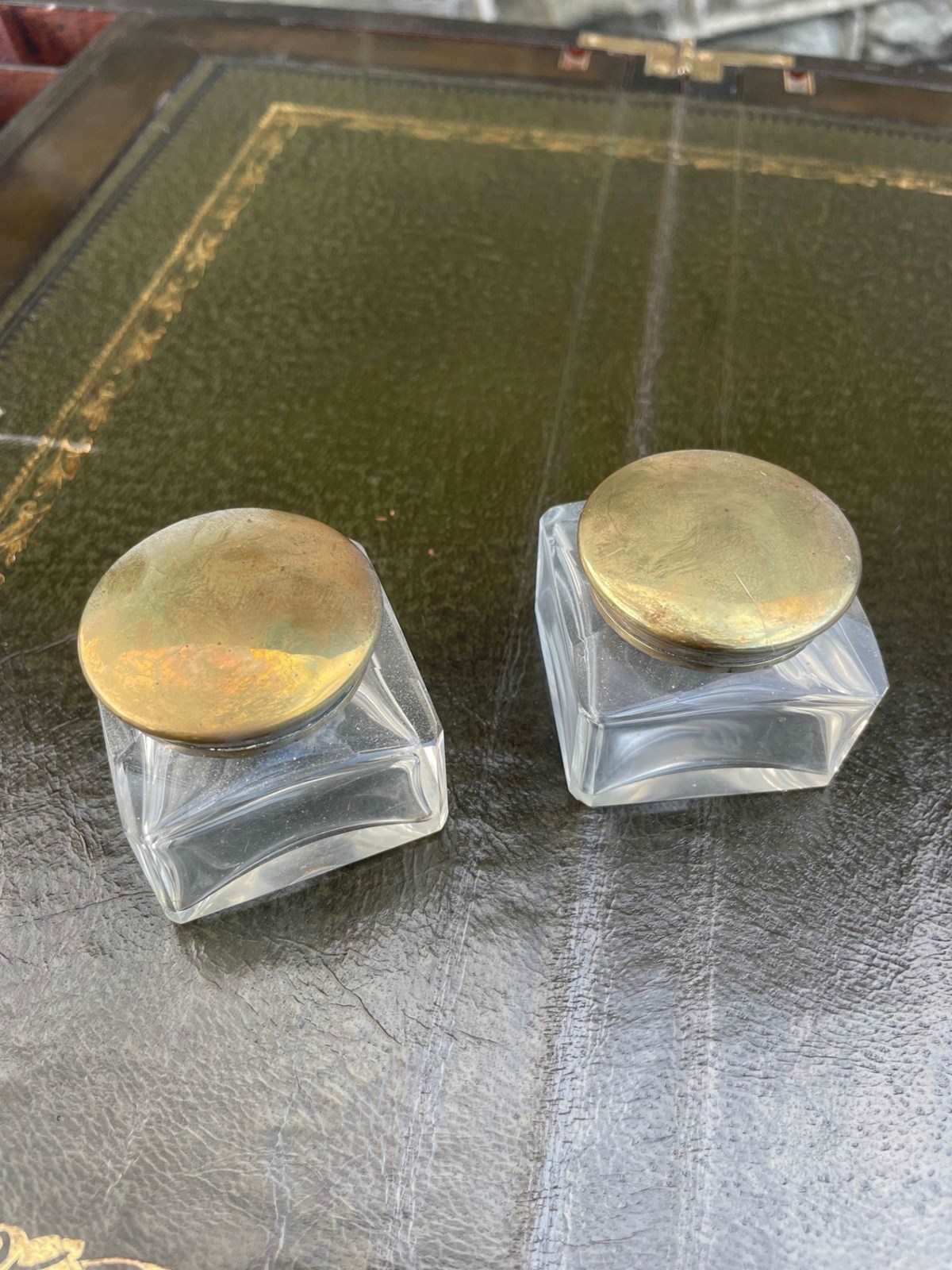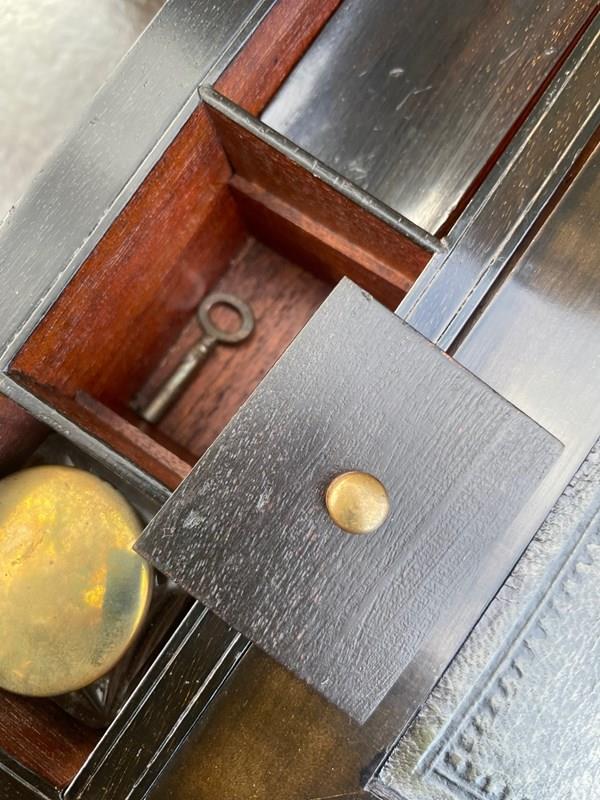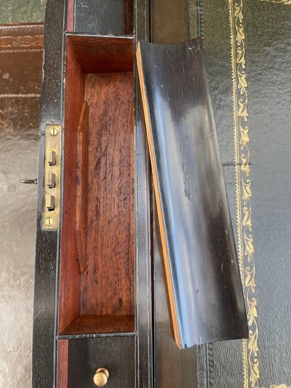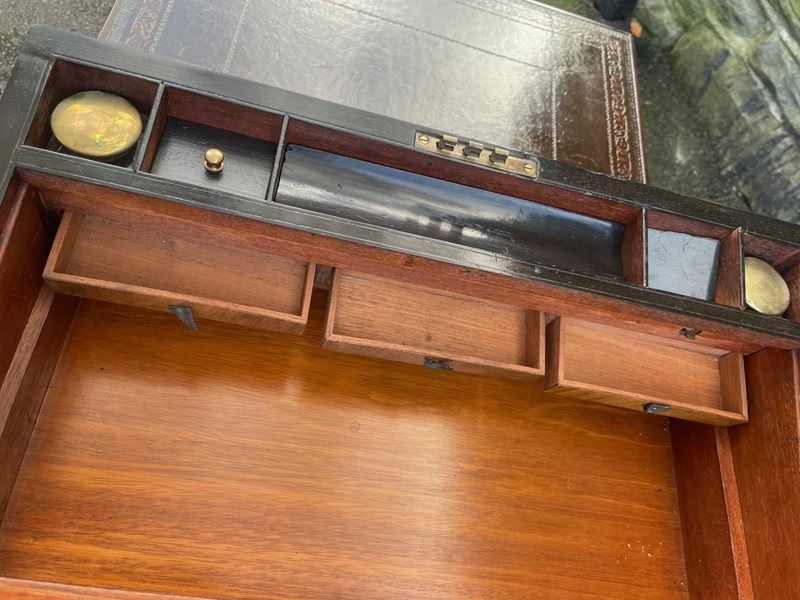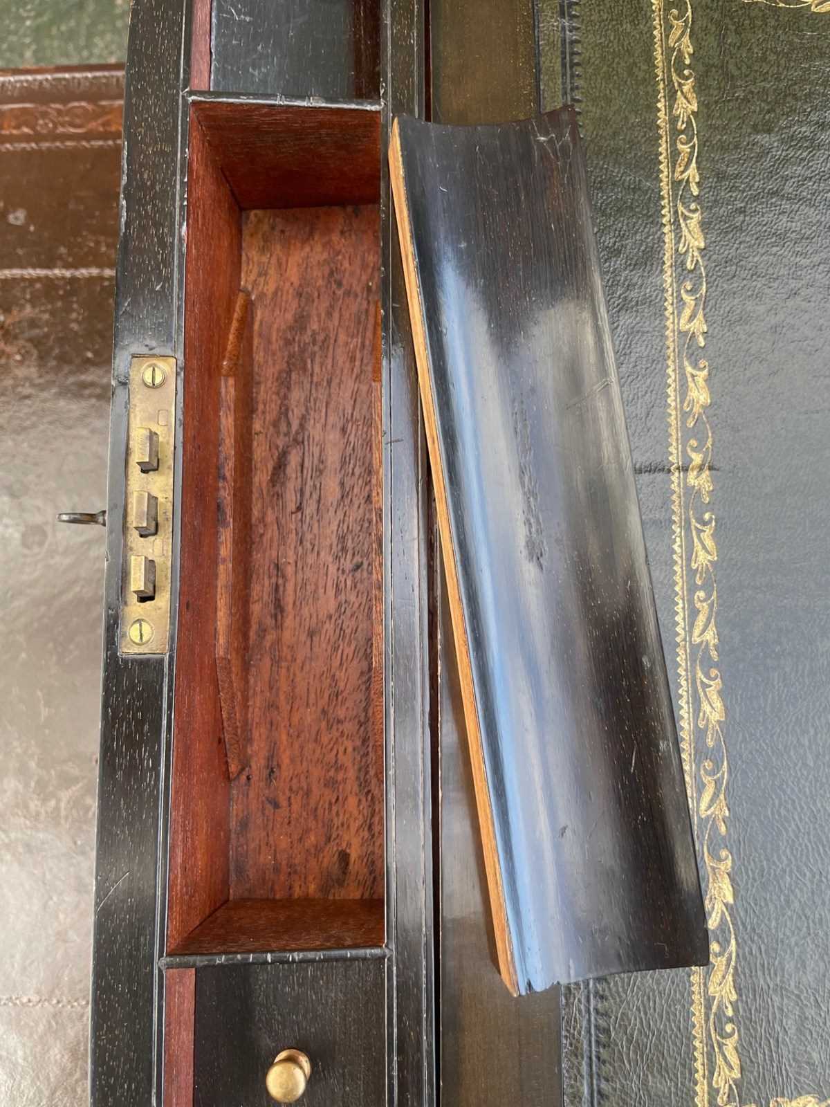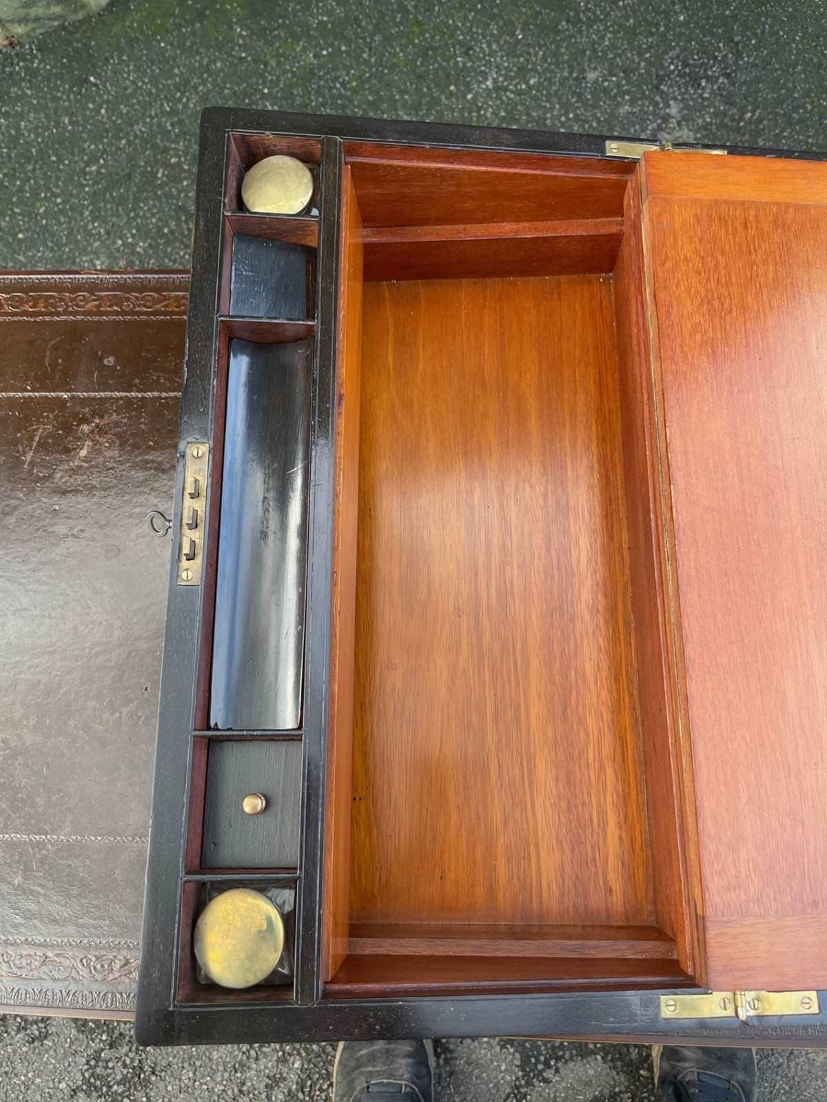In burr walnut having brass tablet to the top and similar escutcheon. Brass bound straps and corners. Inside it has a tooled leather writing slope with lift up flaps, 2 original ink wells, pen tray, lidded compartment. It has 3 secret draws under the bottom writing flap. Comes with 2 original keys to lock outer box and inner flap.