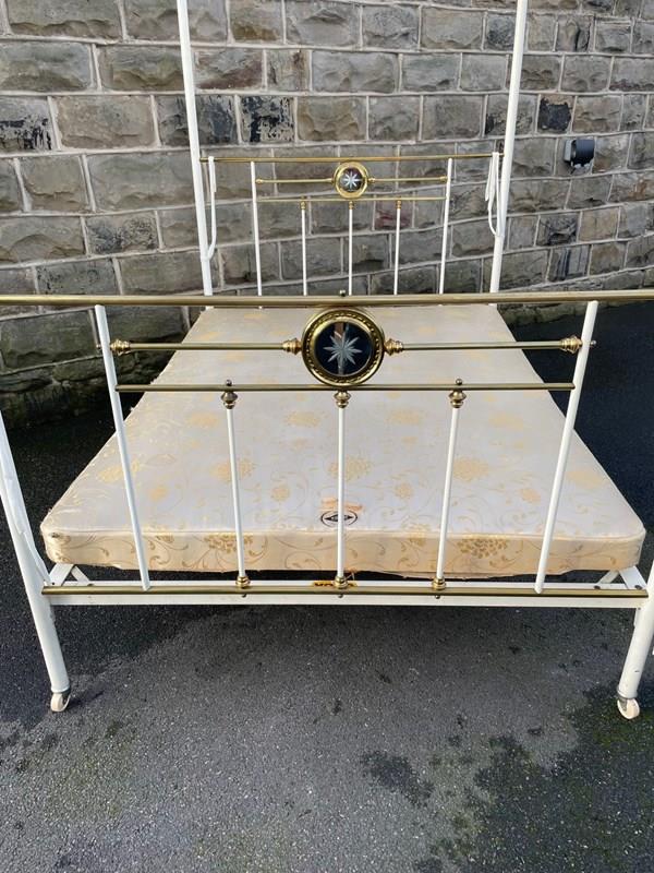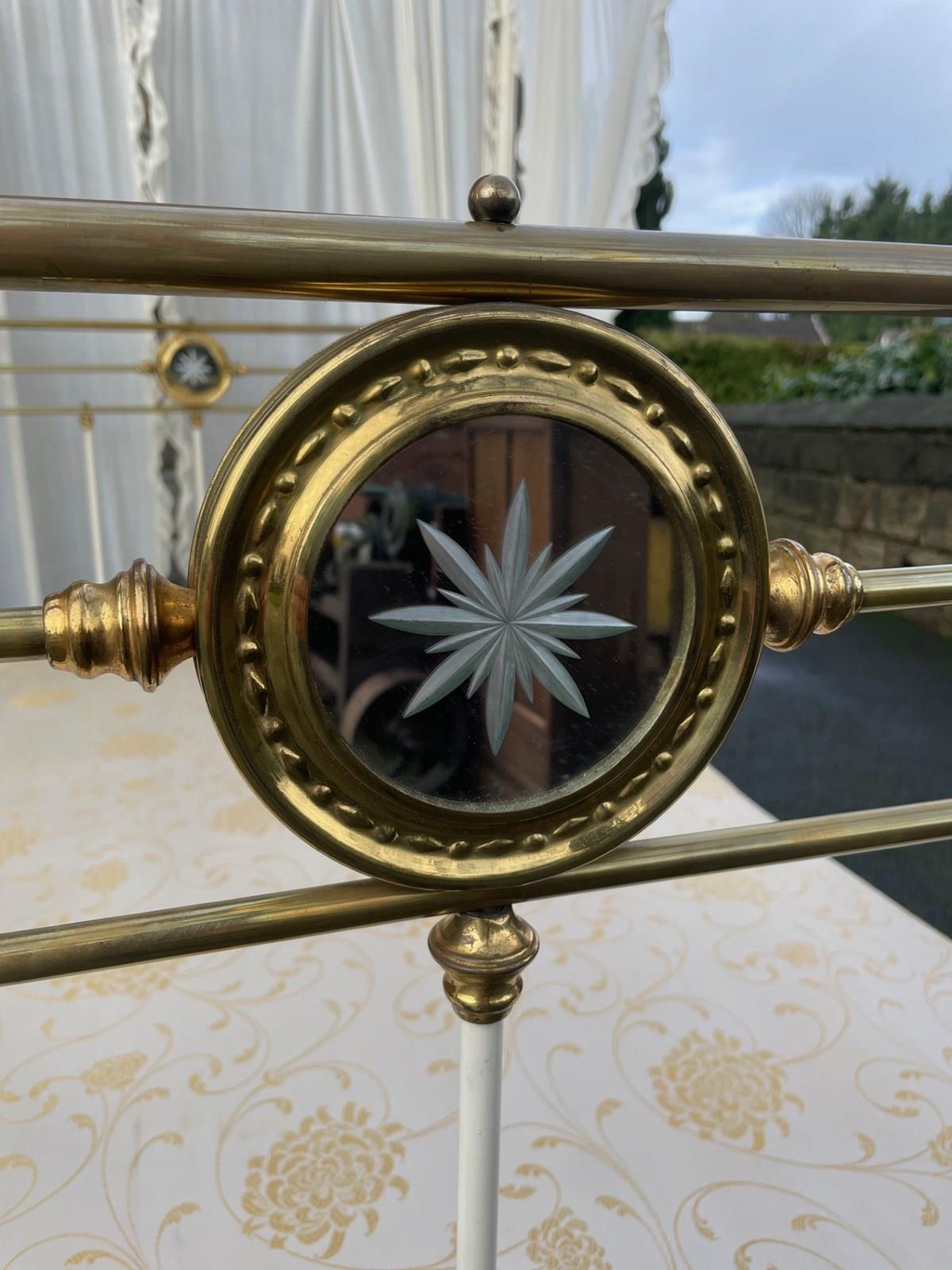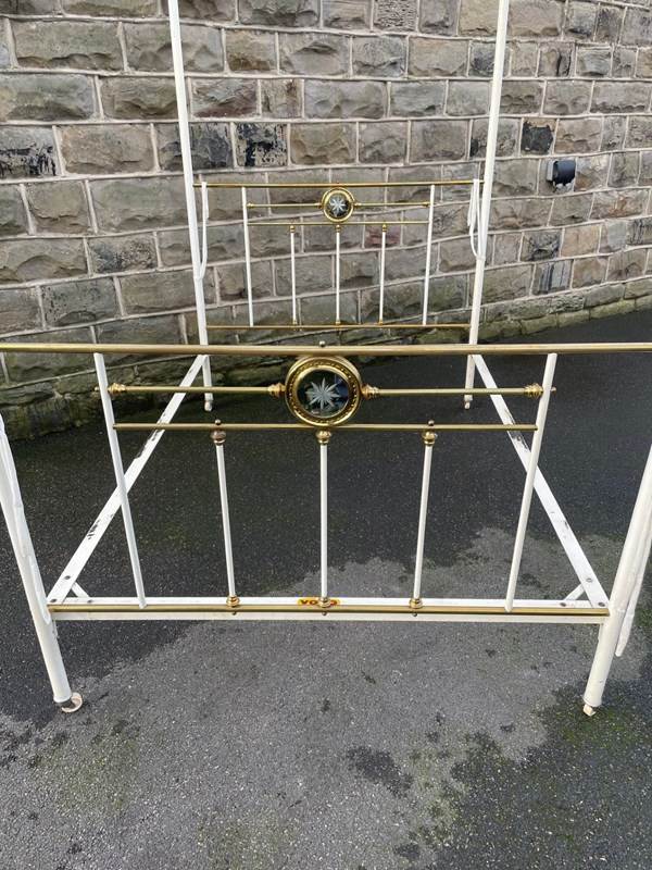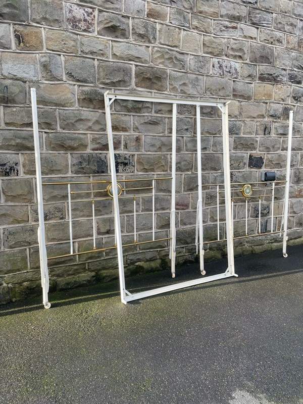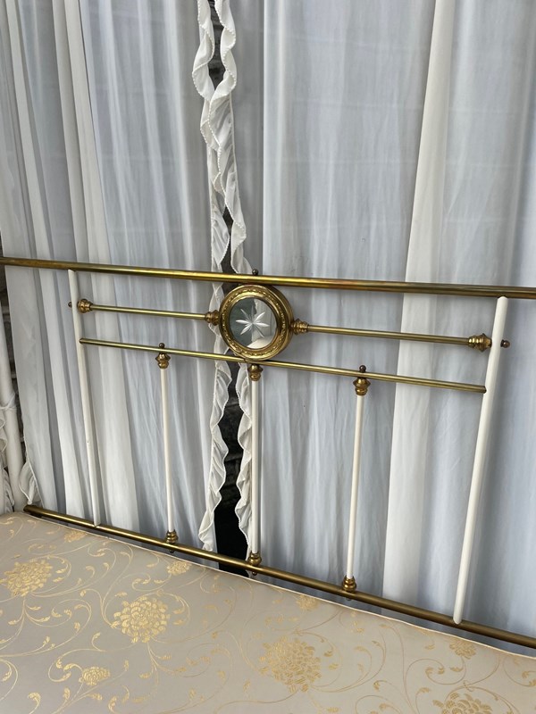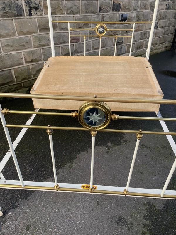 Double bed in white painted iron with brass mounts & finials, central etched mirror to the footboard & headboard. Breaks down into sections and is easy to assemble. On castors so easy to move around. It has its original folding Vono board base ready to take a mattress.