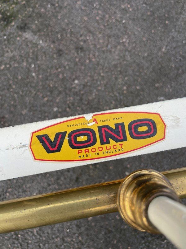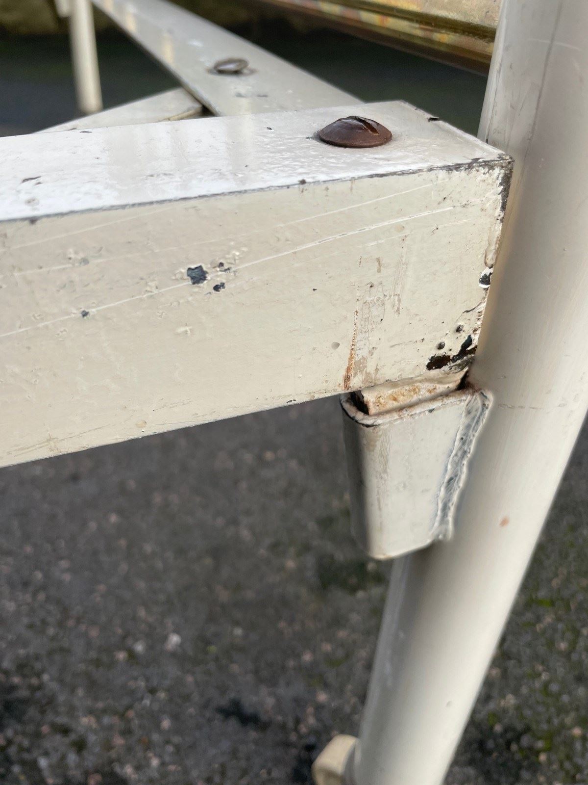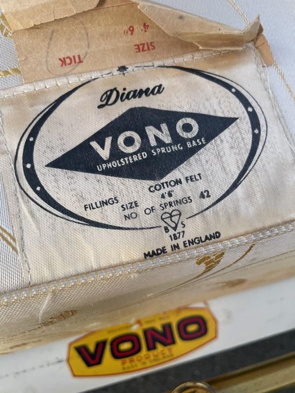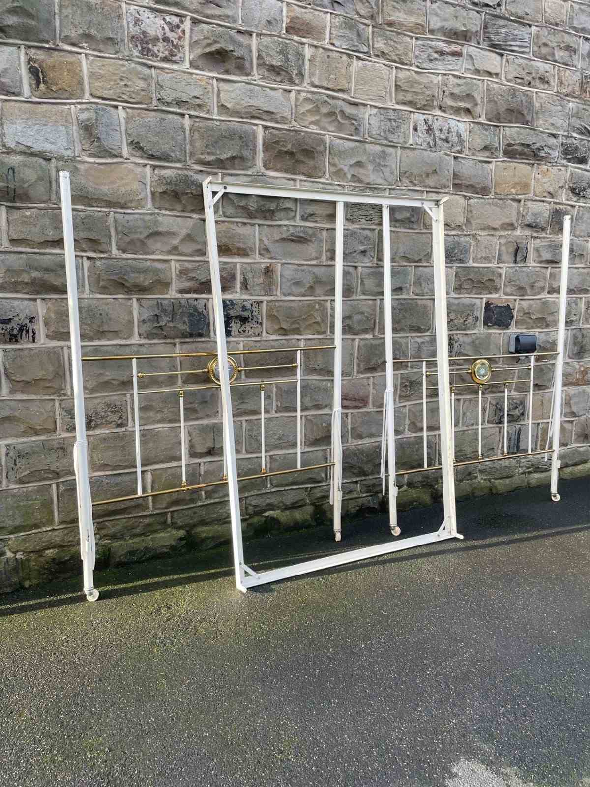 Double bed in white painted iron with brass mounts & finials, central etched mirror to the footboard & headboard. Breaks down into sections and is easy to assemble. On castors so easy to move around. It has its original folding Vono board base ready to take a mattress.