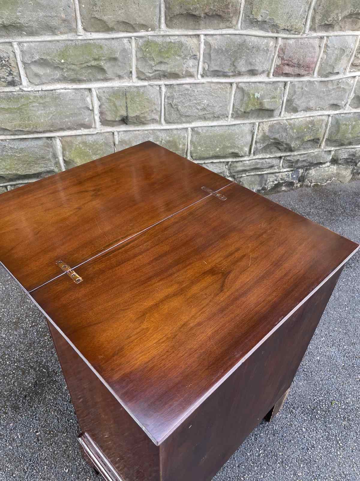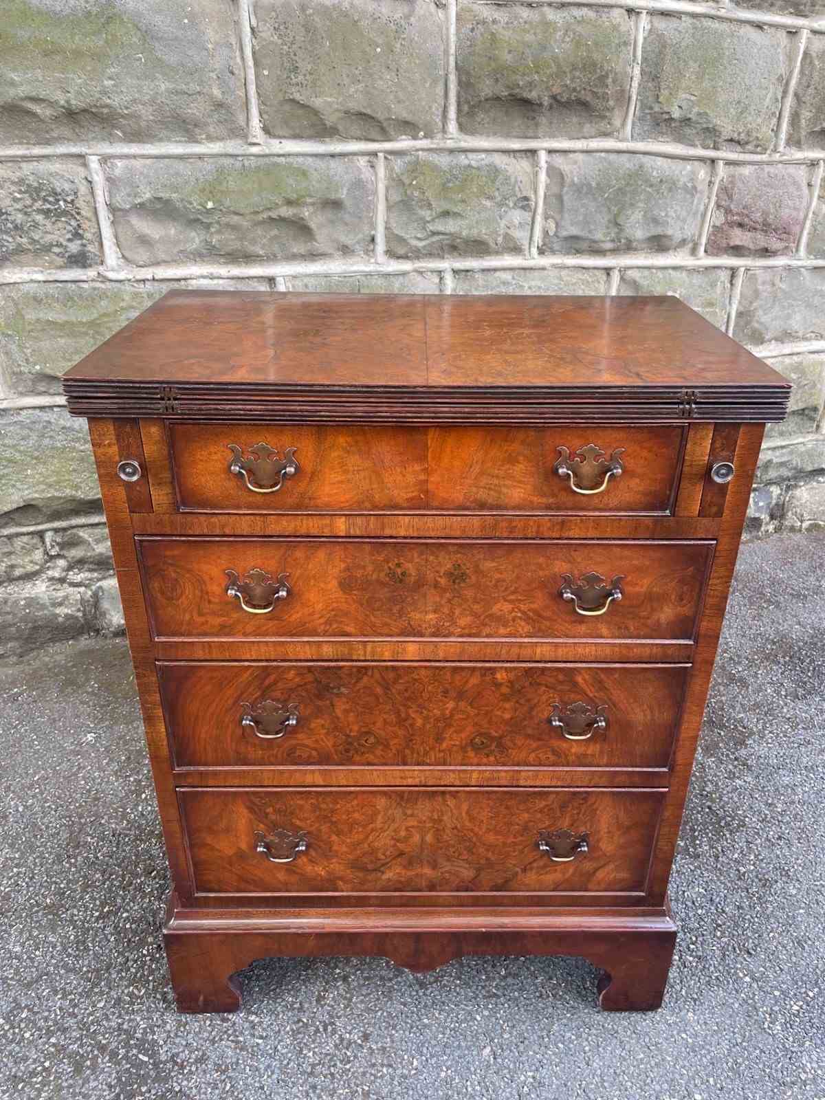 Lovely small size. Veneered in burr walnut. It has a fold over top with reeded edge supported by 2 pull out loafers. This would have been used as desk to sit and work at. 4 graduated draws with burr walnut fronts, brass handles, standing on bracket feet. Polished walnut sides and a solid back.