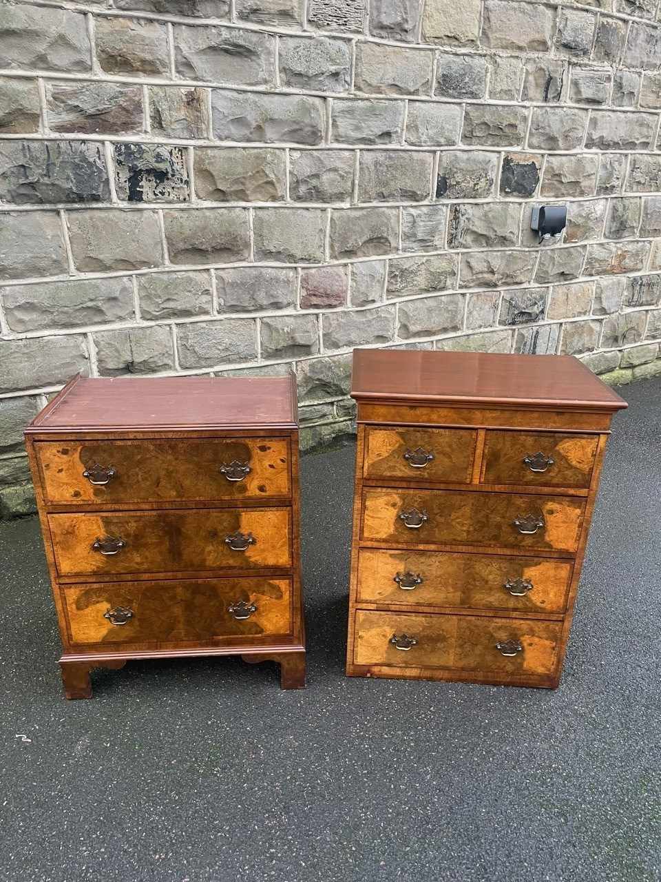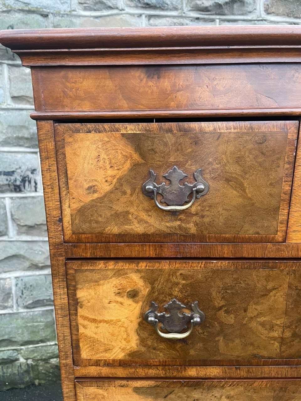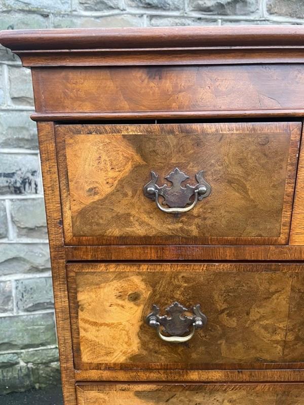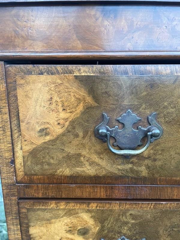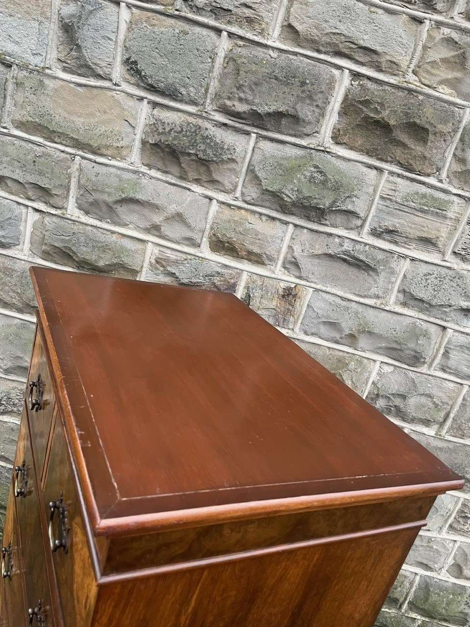 Lovely slim size & proportions. Unusual use of colour burr walnut timbers. Made in 2 pieces. It has 2 smaller 6 larger graduated draws. Burr walnut fronted draws with brass handles. Polished walnut sides standing on bracket feet