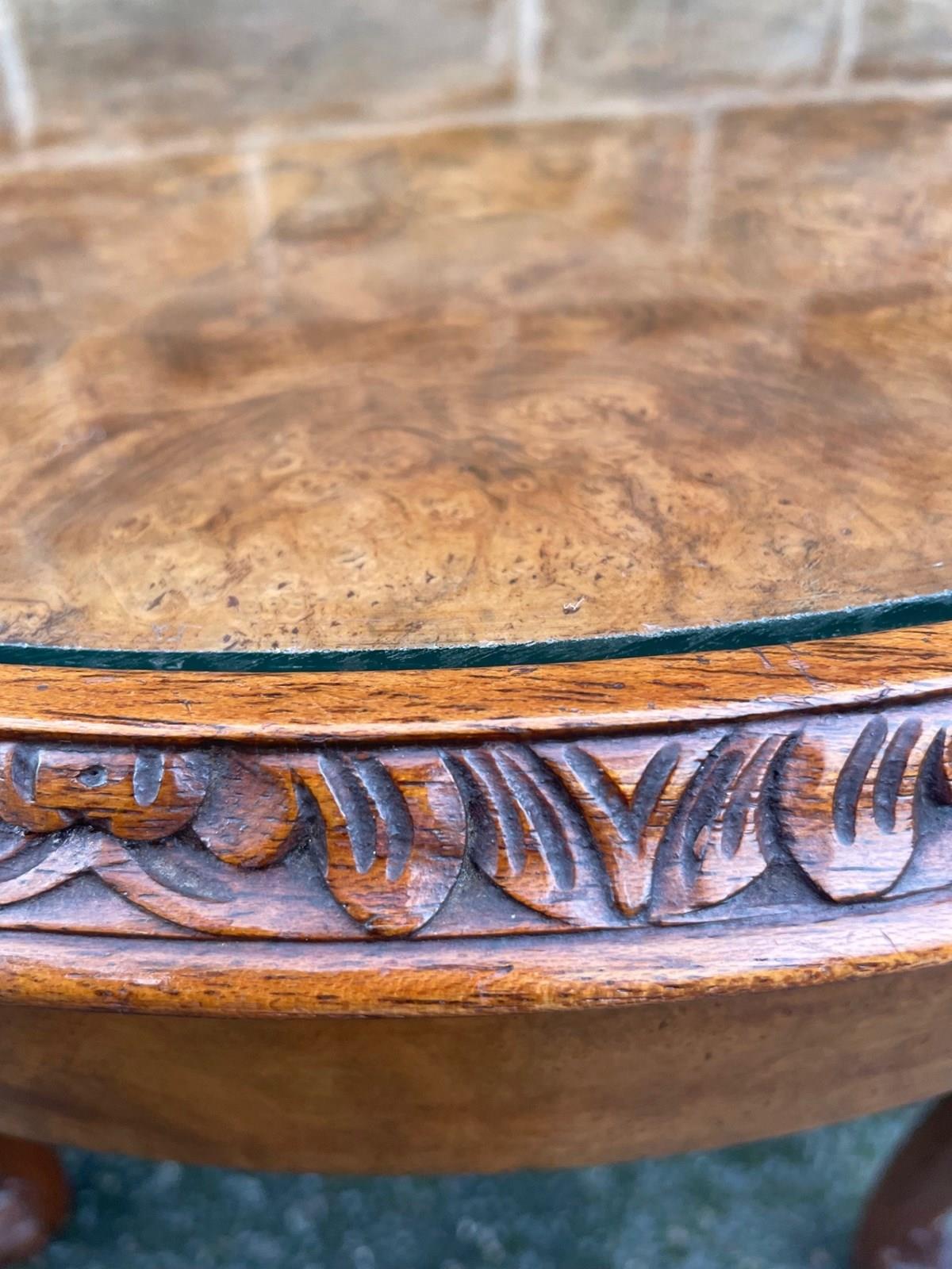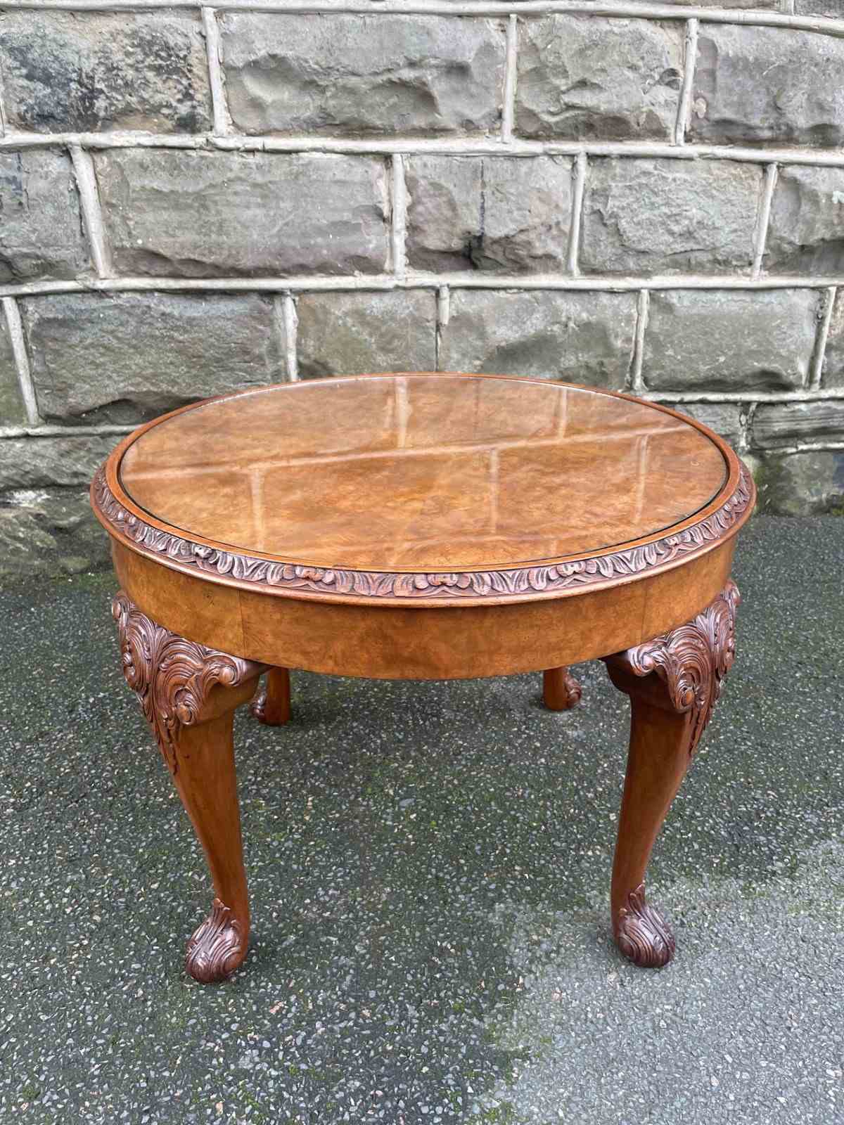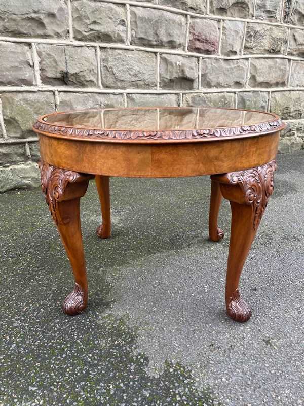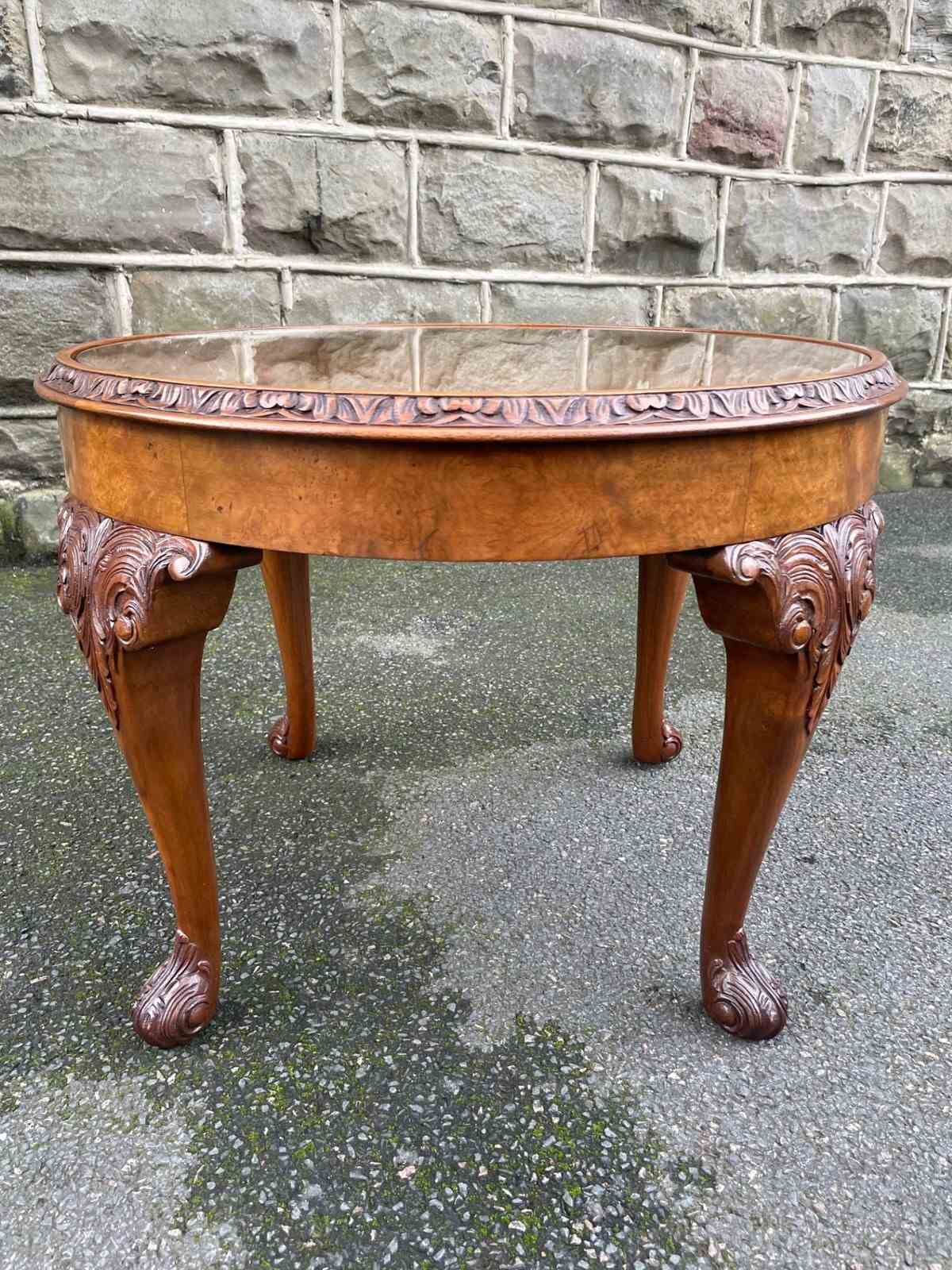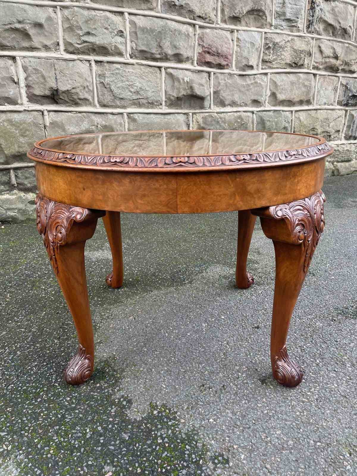 Inset protective glass top, burr walnut top with a carved border, standing on well carved cabriole legs
