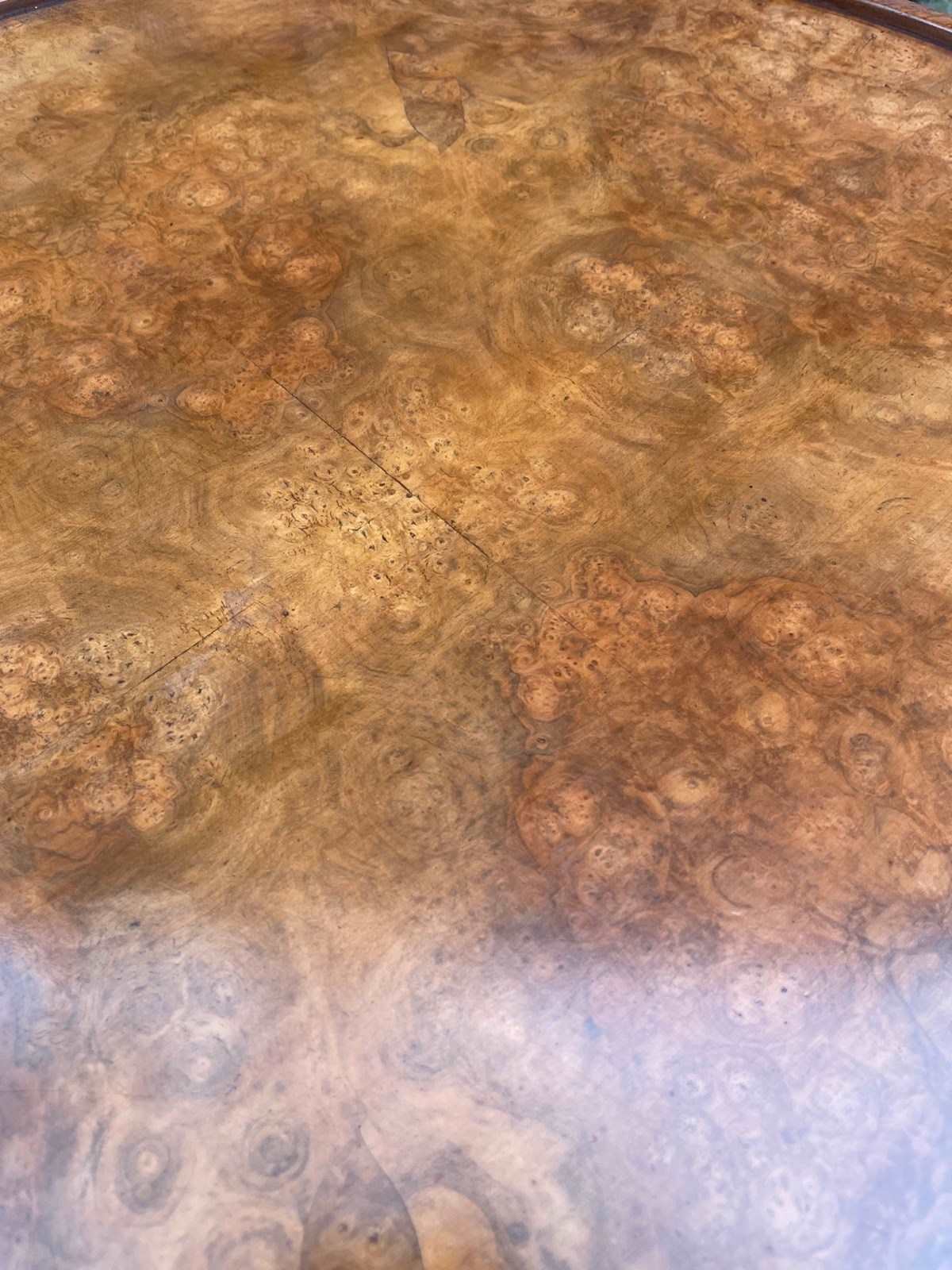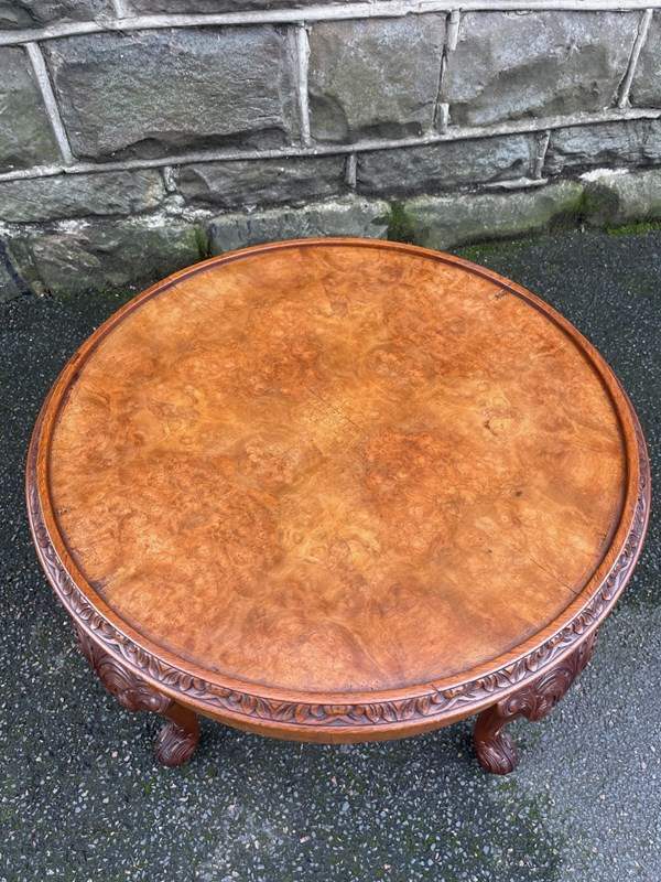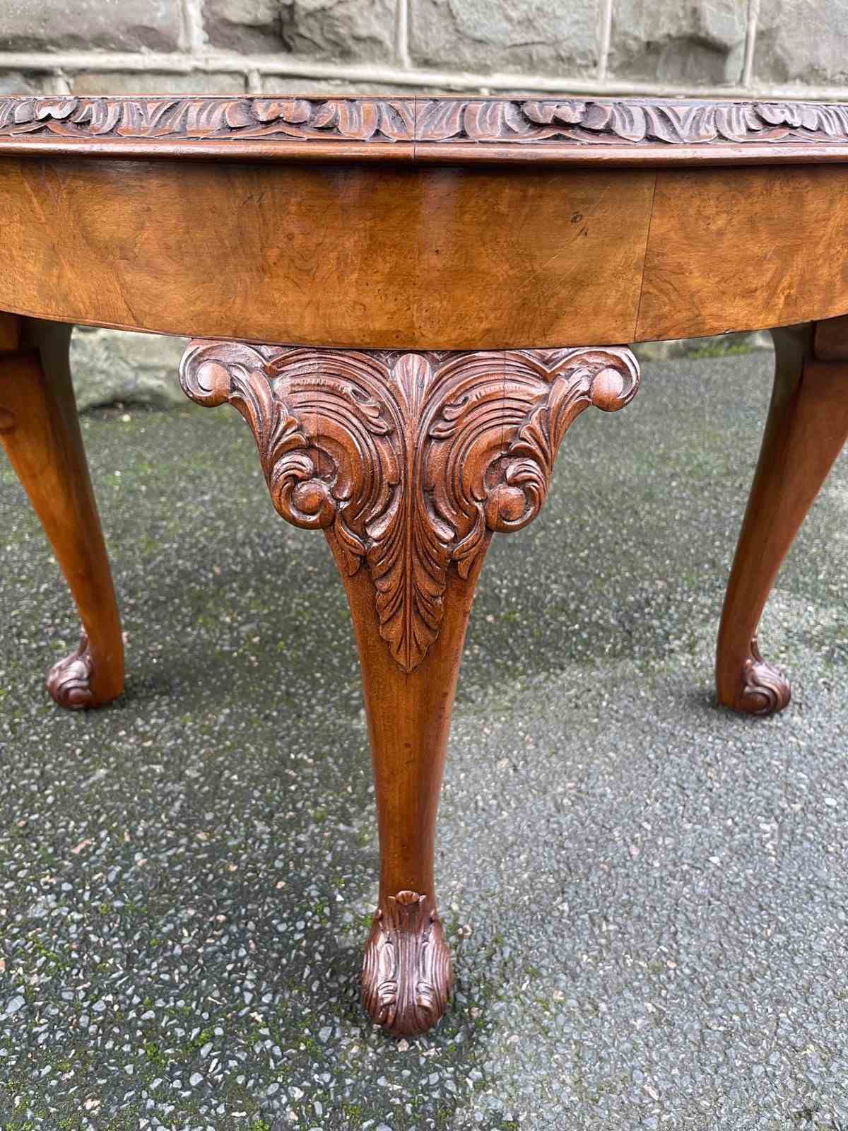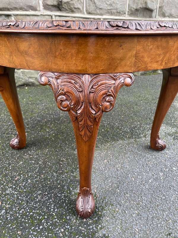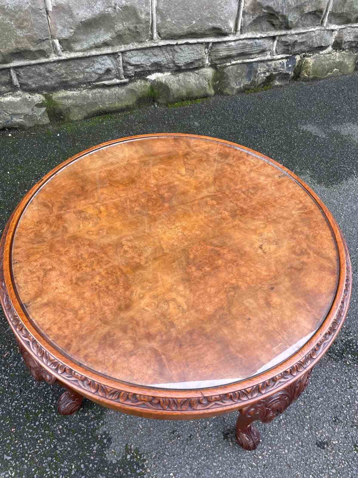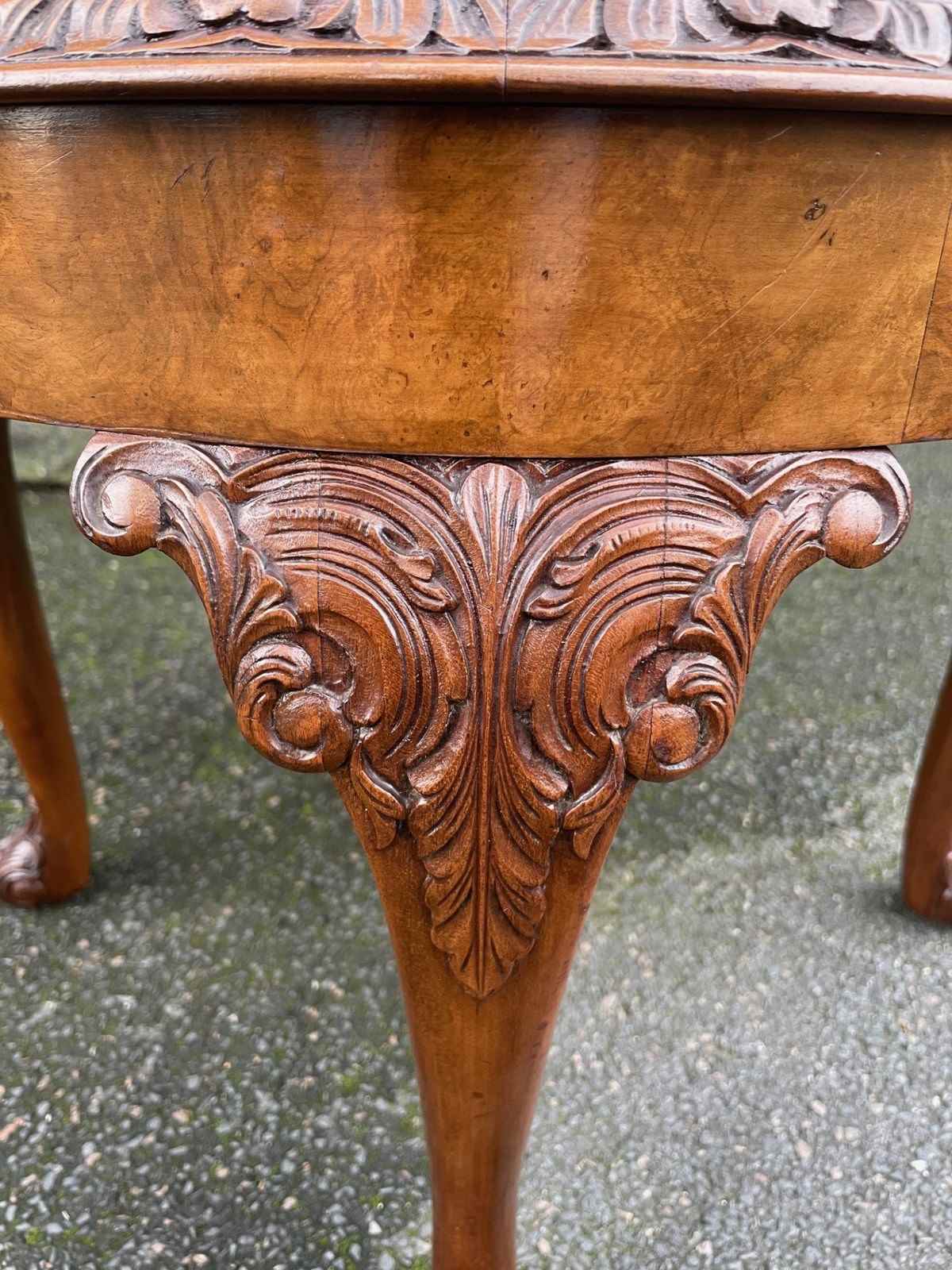 Inset protective glass top, burr walnut top with a carved border, standing on well carved cabriole legs