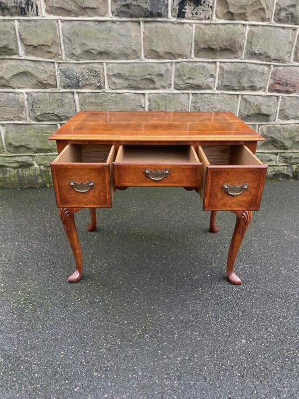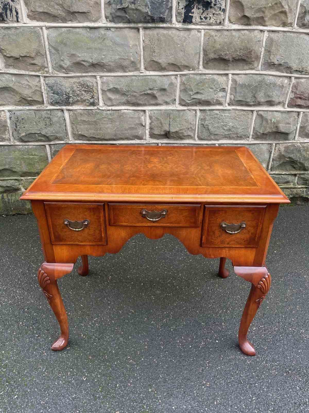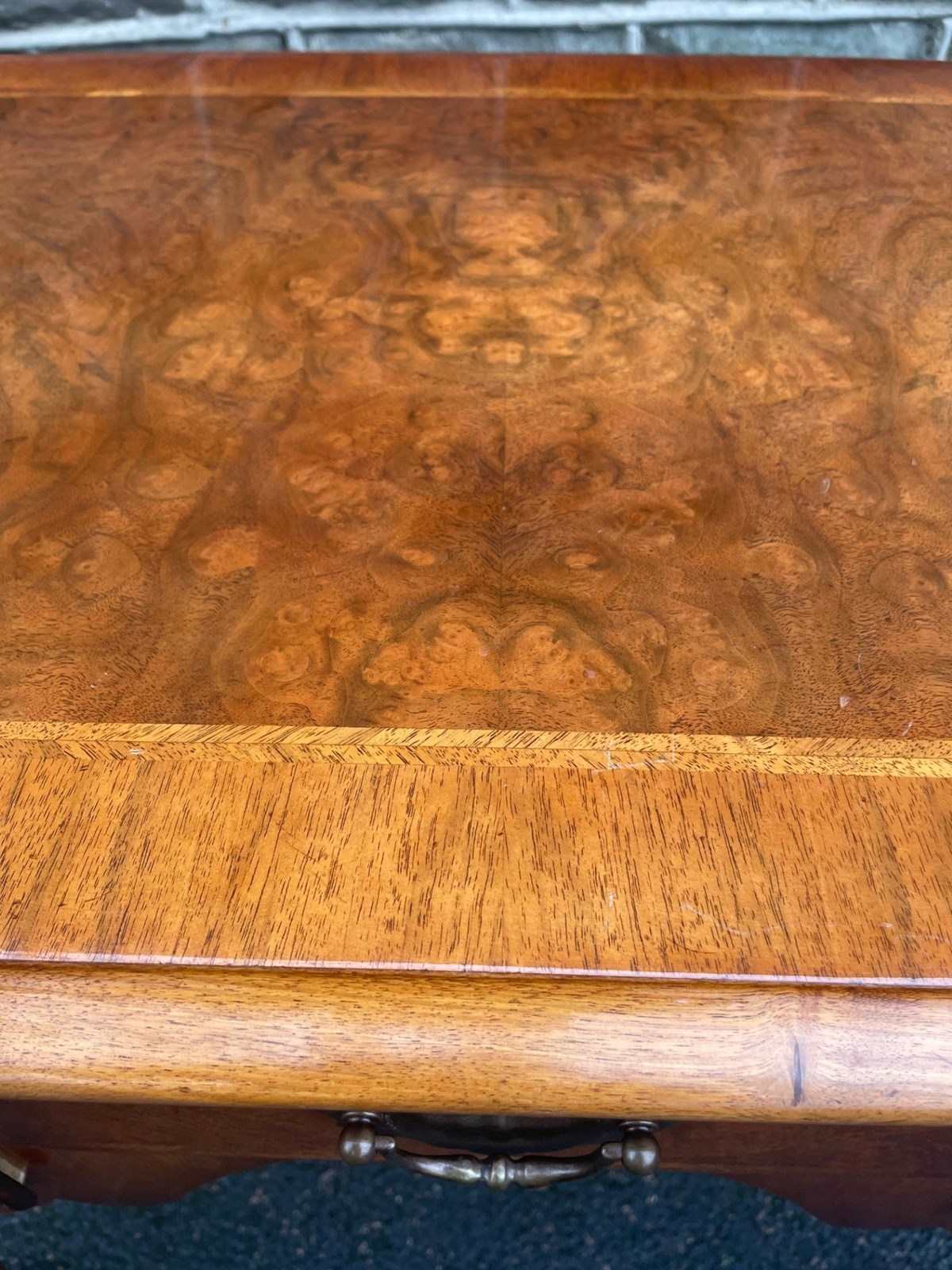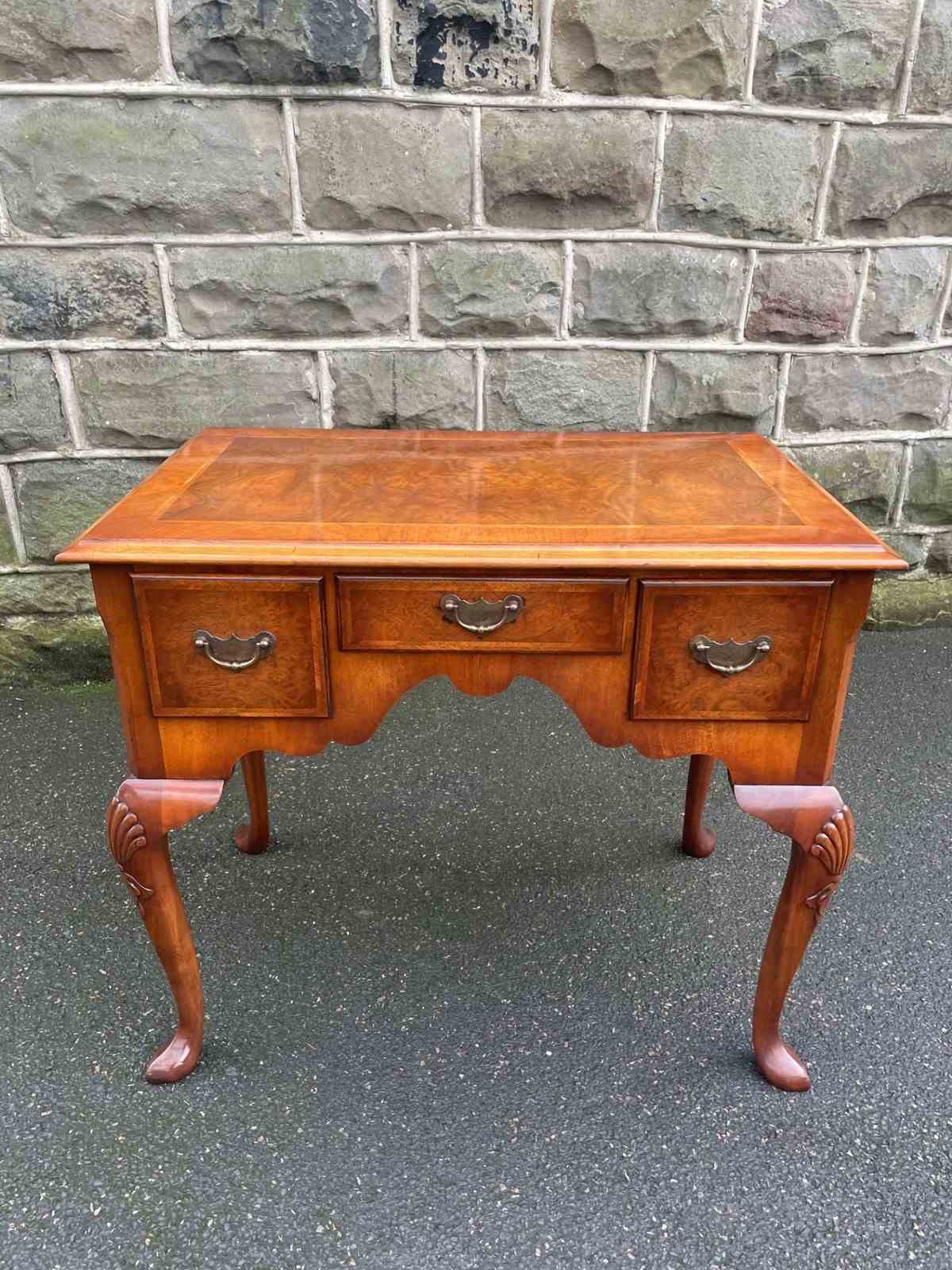 In burr walnut, the top having a crossbanded border. It has large central drawer with 2 smaller draws either side, with ornate brass handles. It stands on slender shell carved cabriole legs.