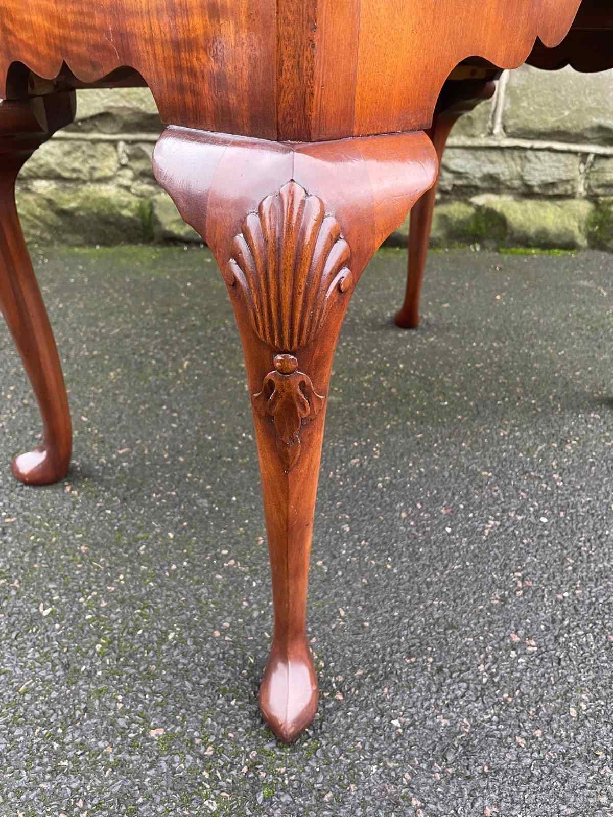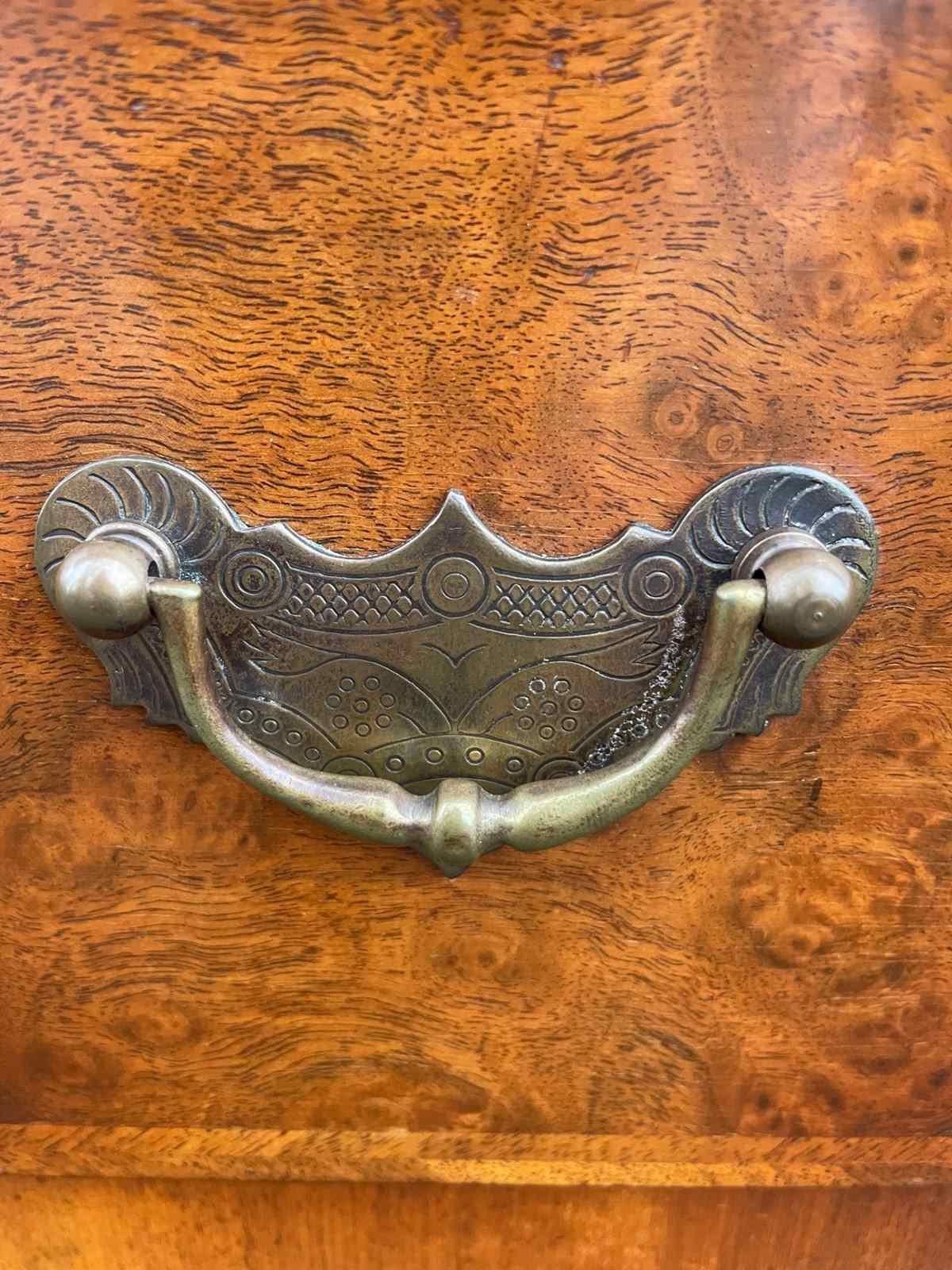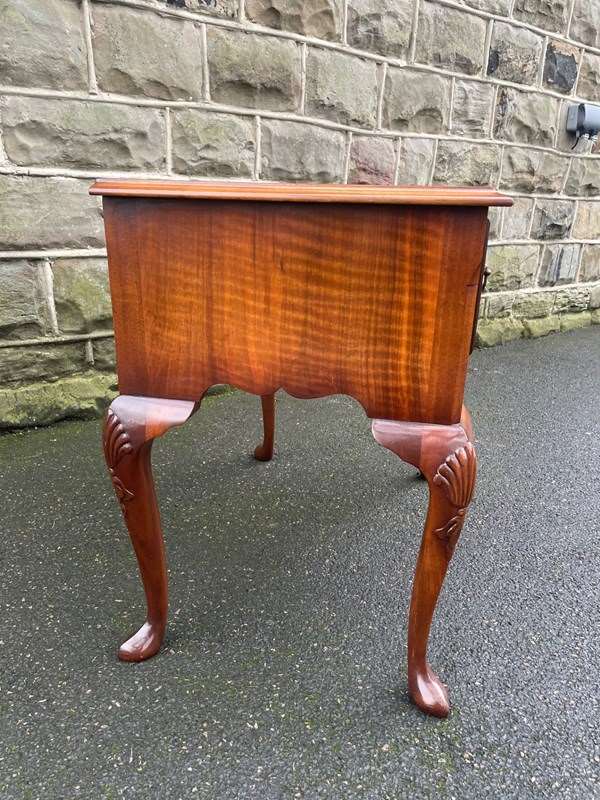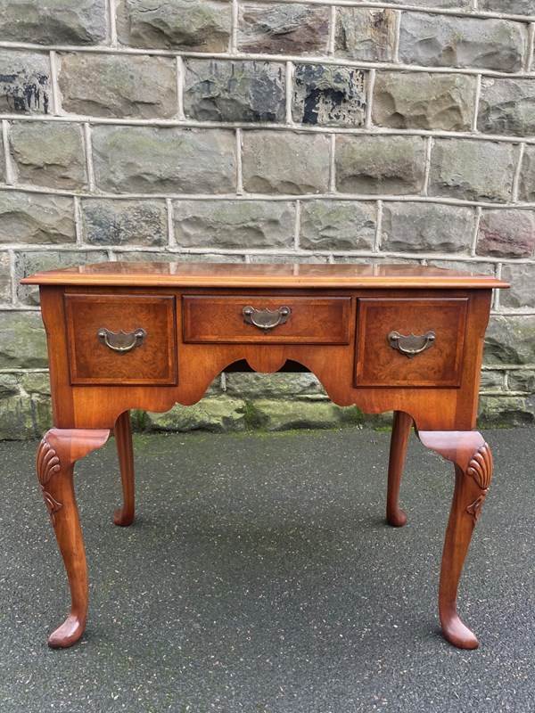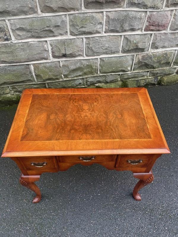 In burr walnut, the top having a crossbanded border. It has large central drawer with 2 smaller draws either side, with ornate brass handles. It stands on slender shell carved cabriole legs.