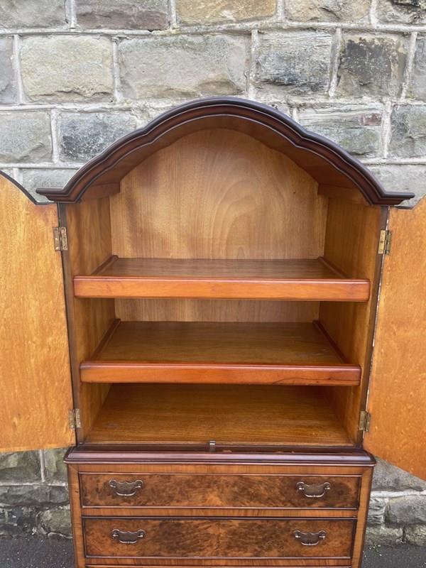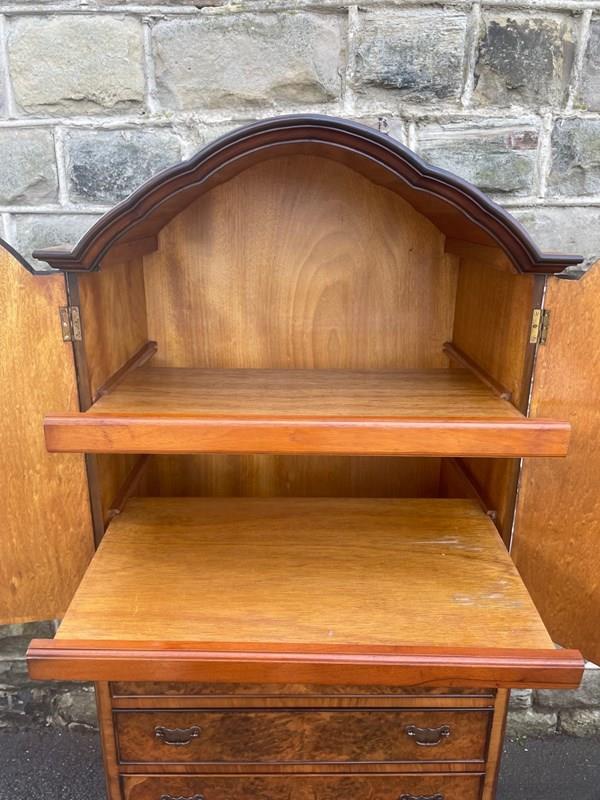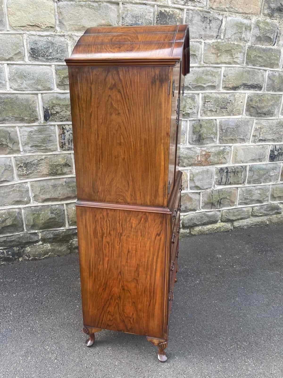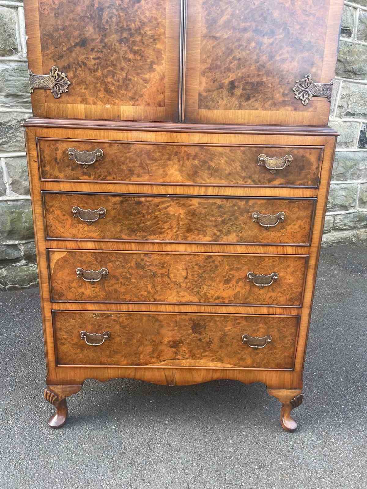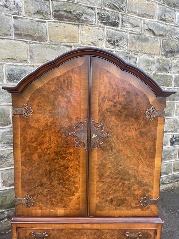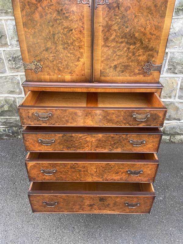 In burr walnut, the dome queen Anne top having a pair of doors with ornate brass hinges & lock plate (& key). Inside it has 2 pull out trays . The chest base with 4 graduated burr walnut fronted draws with ornate brass handles. Polished walnut sides. Standing on cabriole feet with shell carving. It is 1 fixed piece.