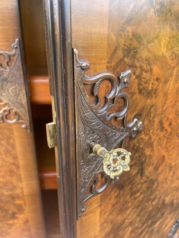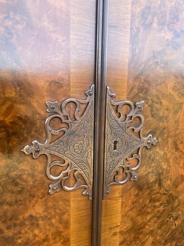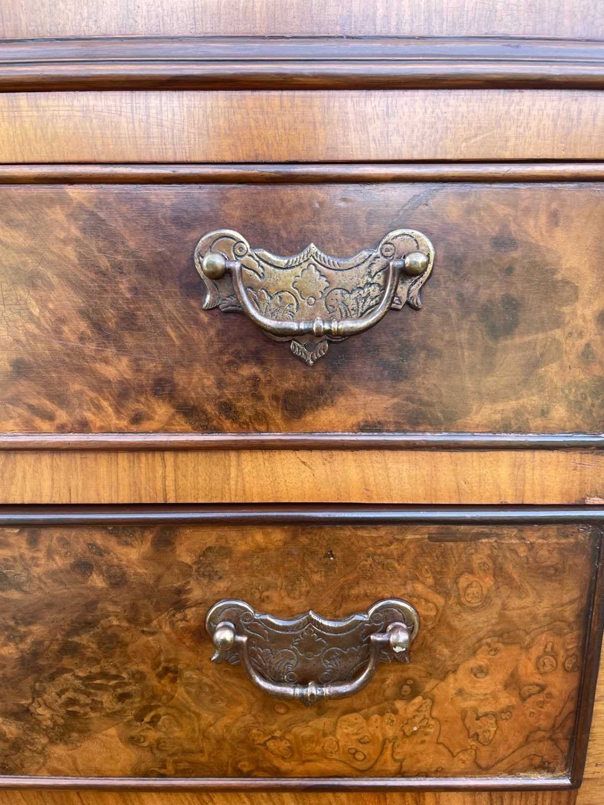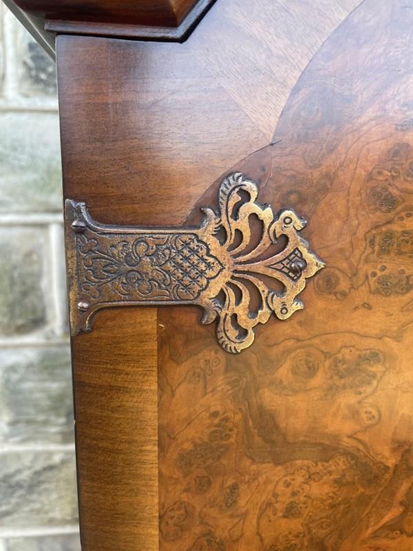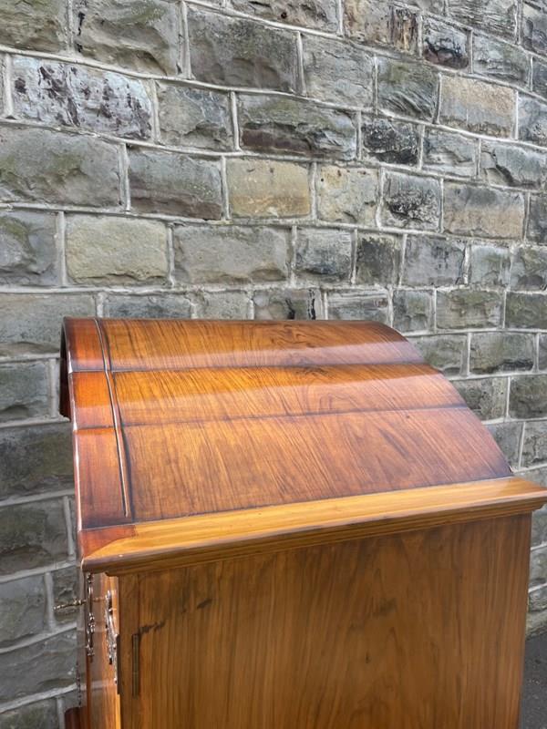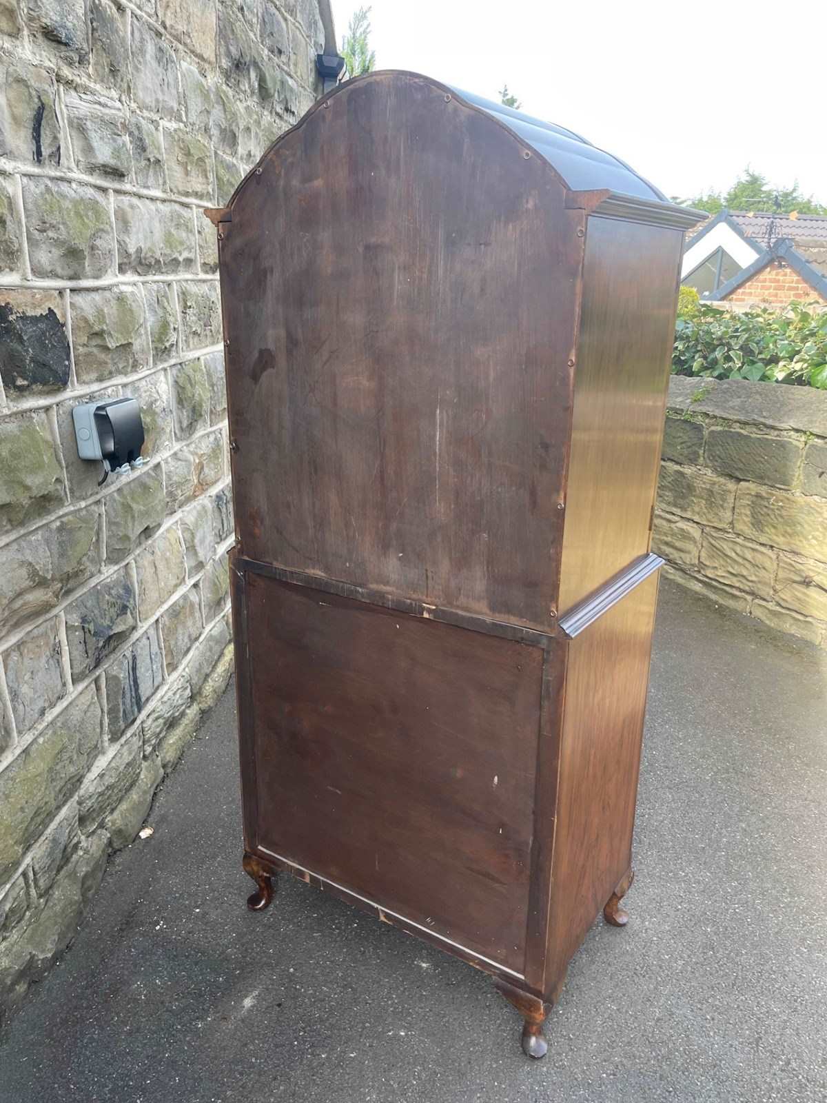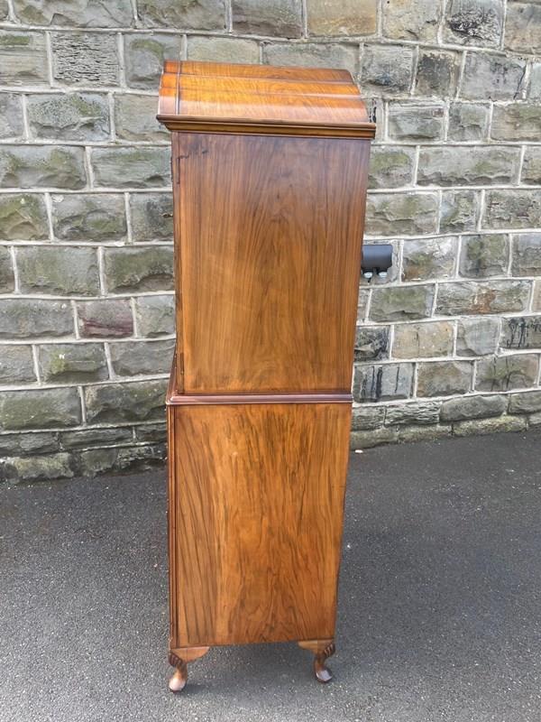 In burr walnut, the dome queen Anne top having a pair of doors with ornate brass hinges & lock plate (& key). Inside it has 2 pull out trays . The chest base with 4 graduated burr walnut fronted draws with ornate brass handles. Polished walnut sides. Standing on cabriole feet with shell carving. It is 1 fixed piece.