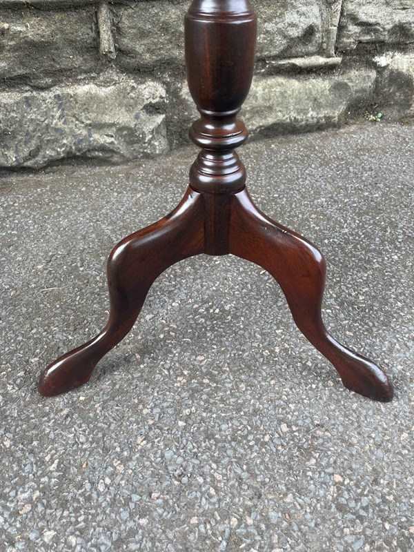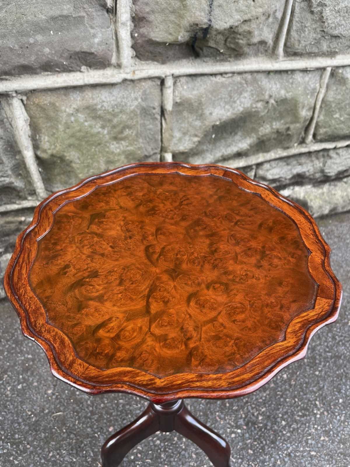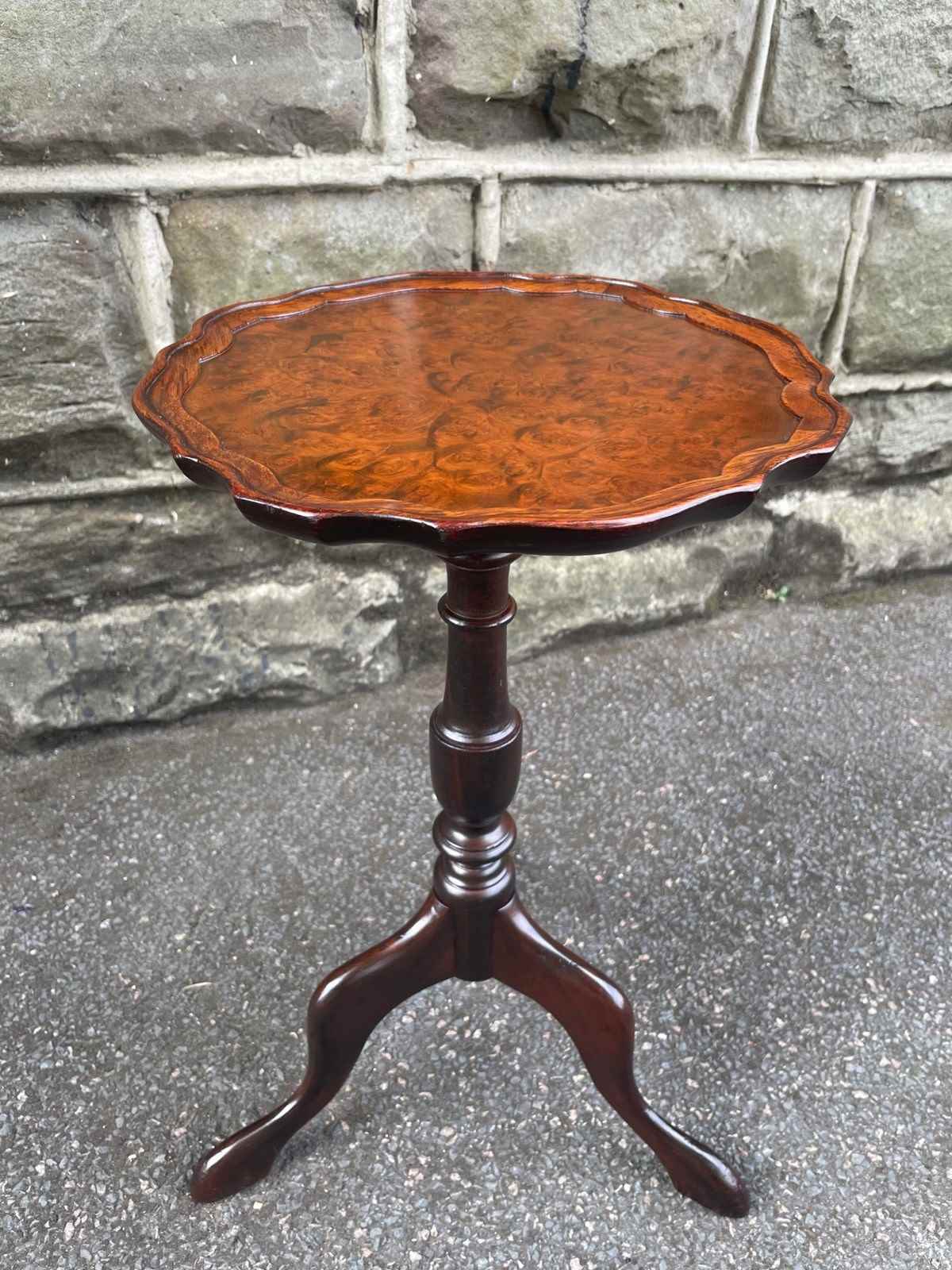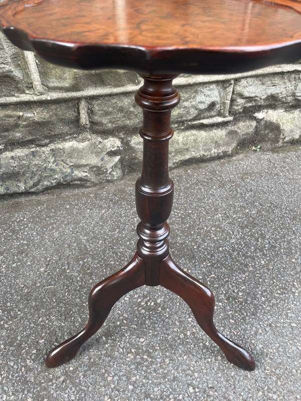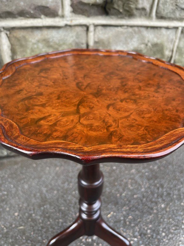 Round dished burr walnut top with a pie crust edge, upon a turned column with 3 shaped legs.