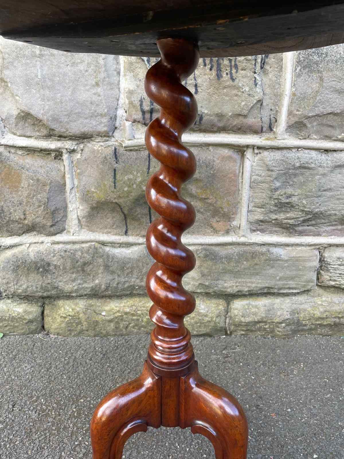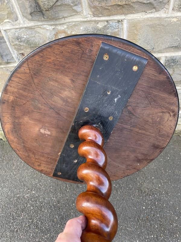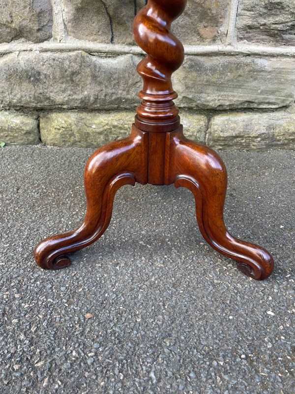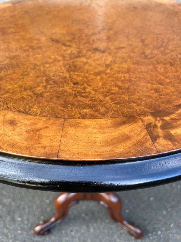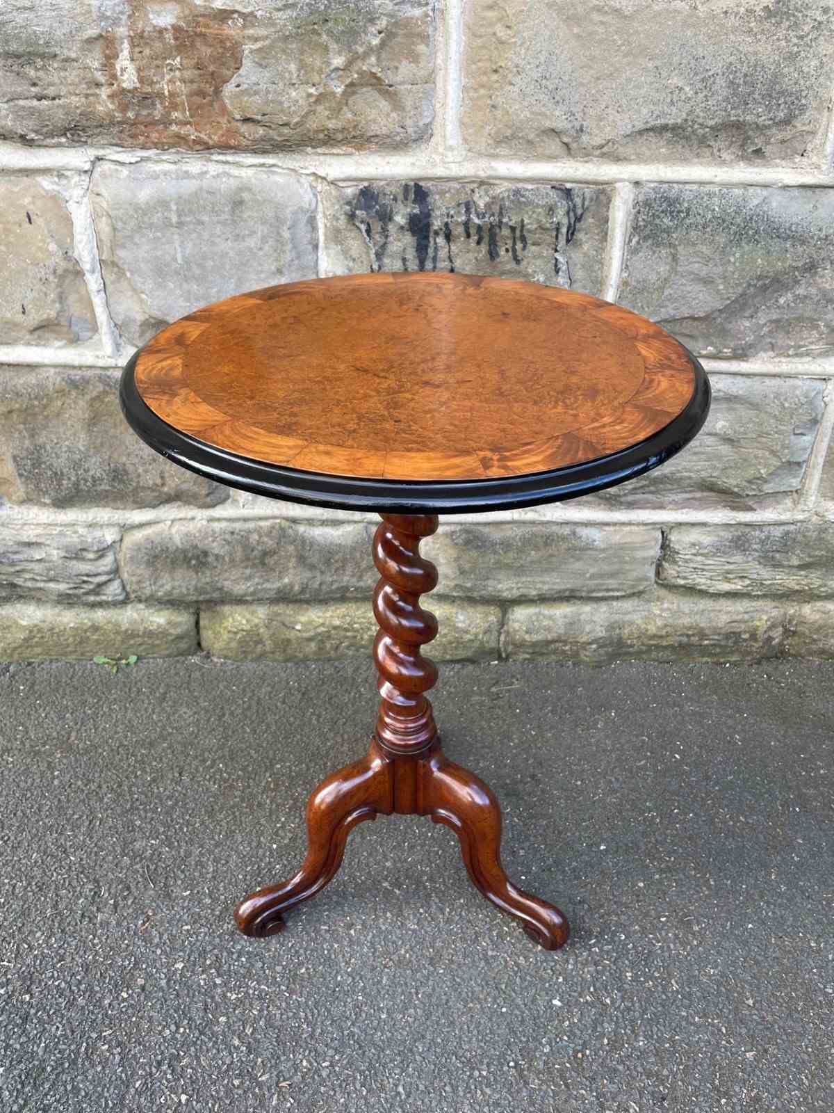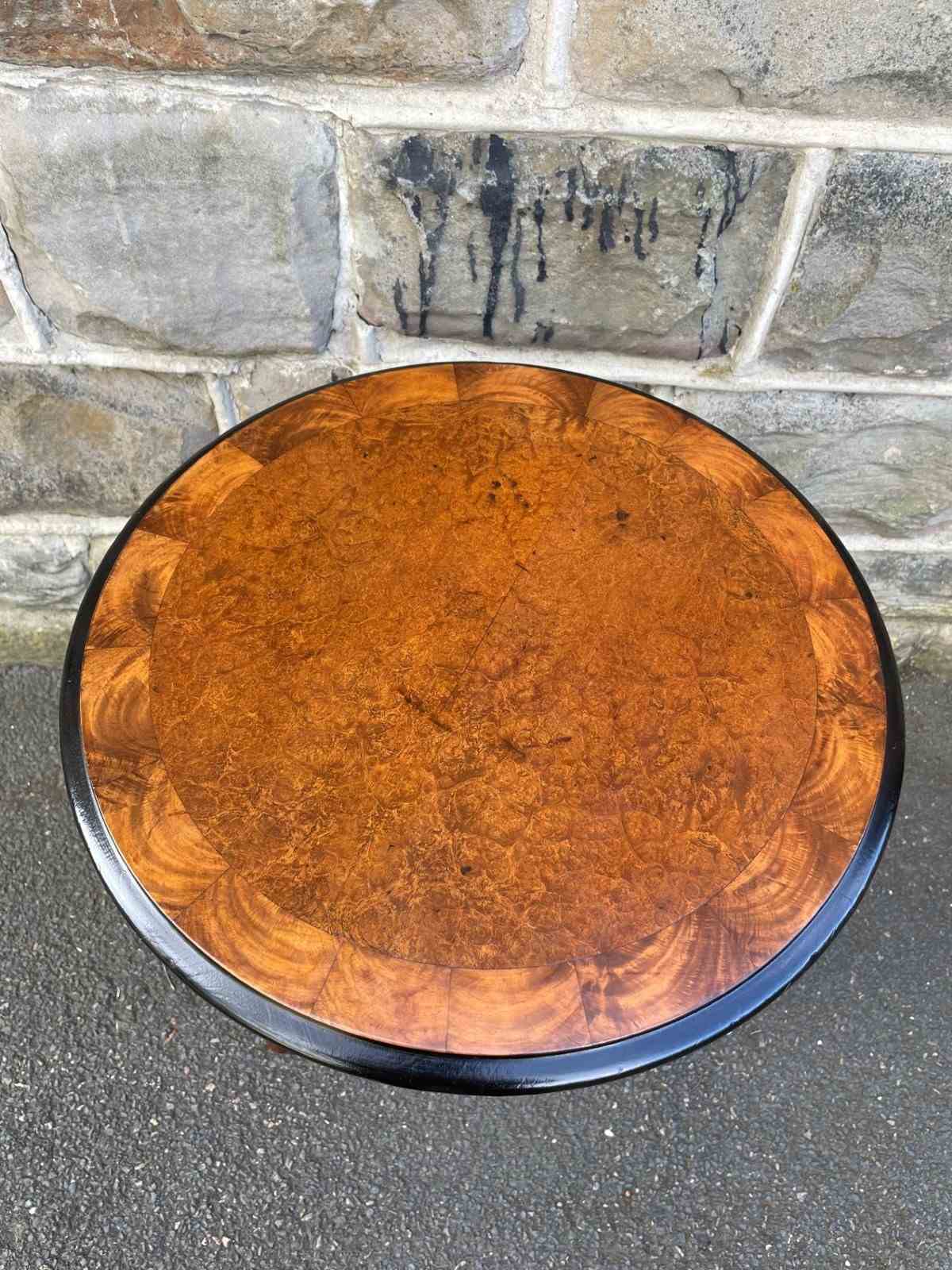 The top in burr walnut with a walnut cross banded border & ebonised edge. It has a barley twist walnut turned column with 3 shaped walnut legs