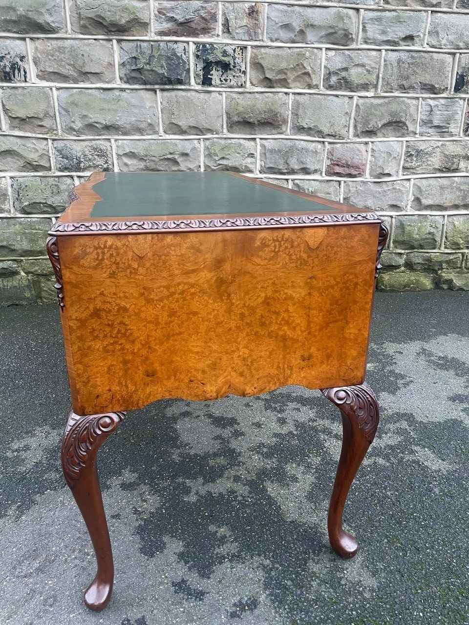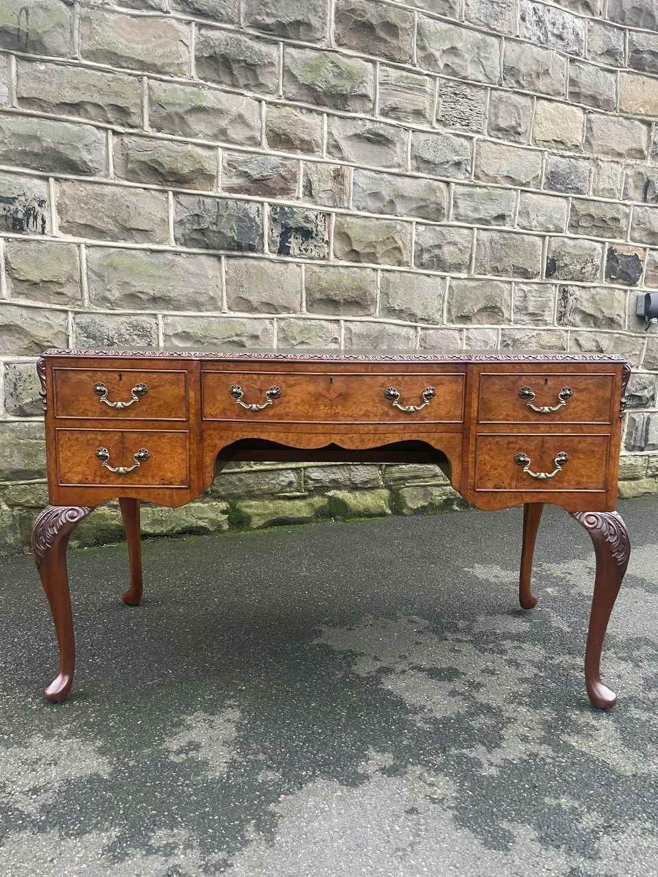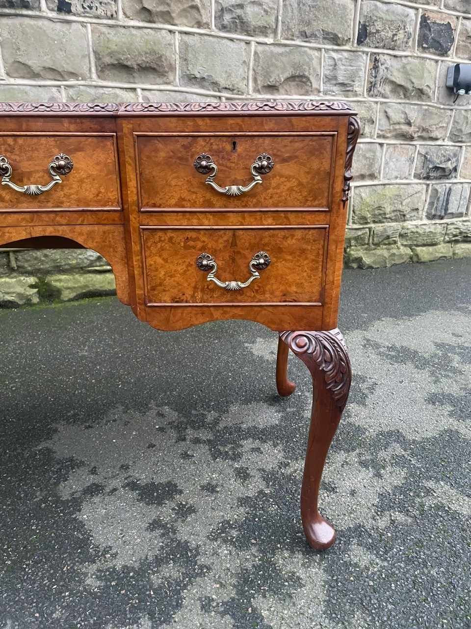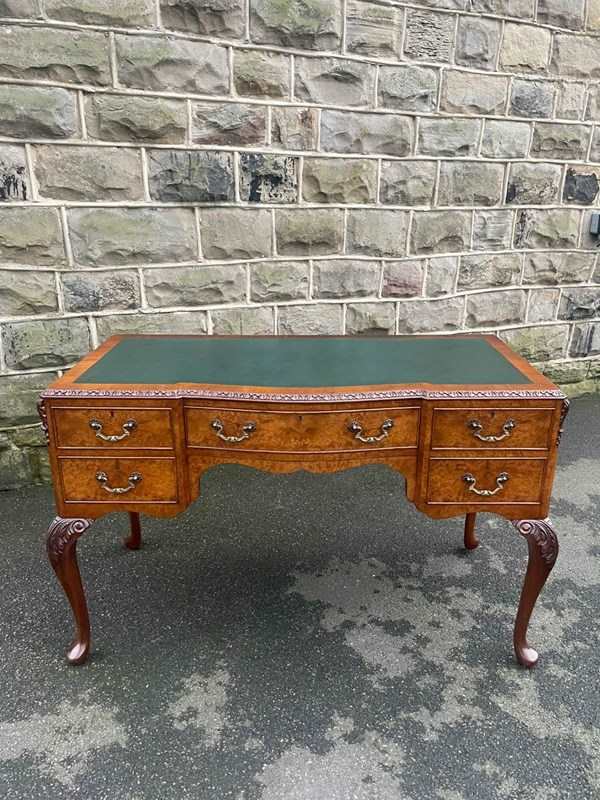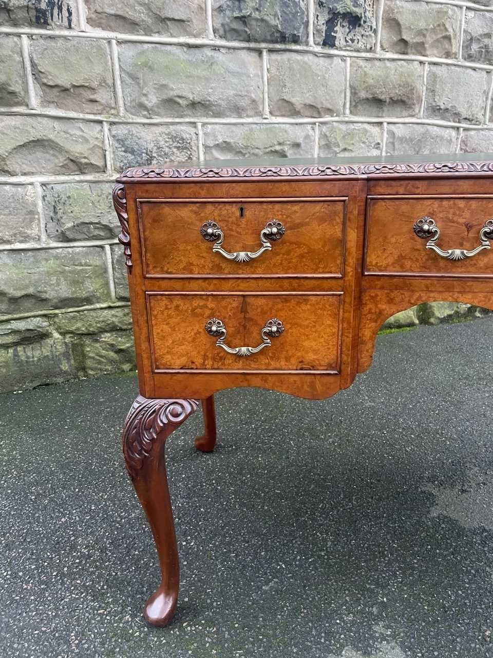 It’s a lovely rich burr walnut colour. Carved edge around the top. It has the original tooled green leather scribe, burr walnut veneered central draw with two draws either side with ornate brass drop handles. Locks to top 3 draws (no key). It has burr walnut sides standing on slender carved cabriole legs with carved scroll foot.