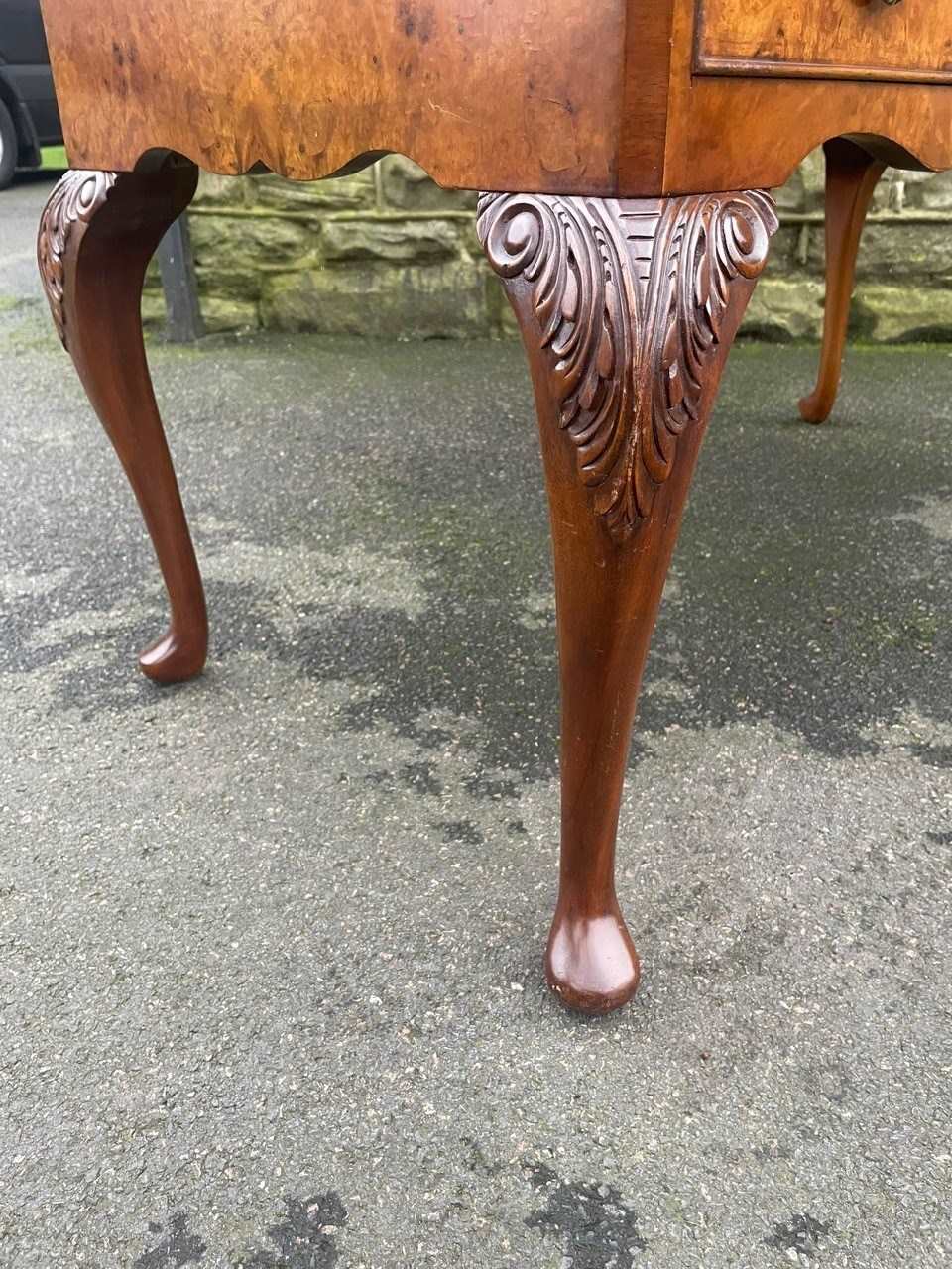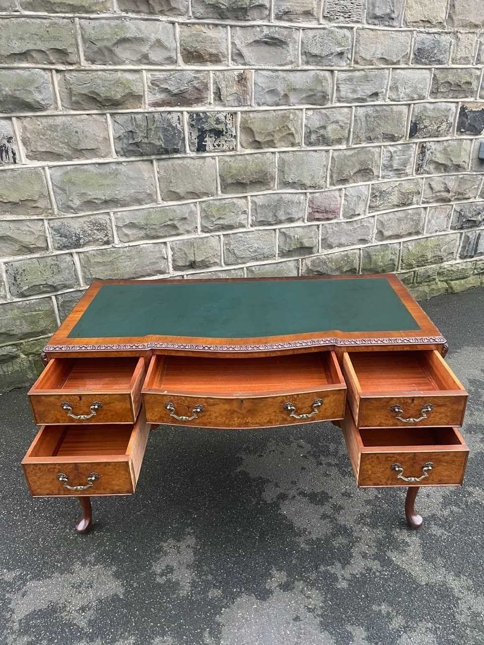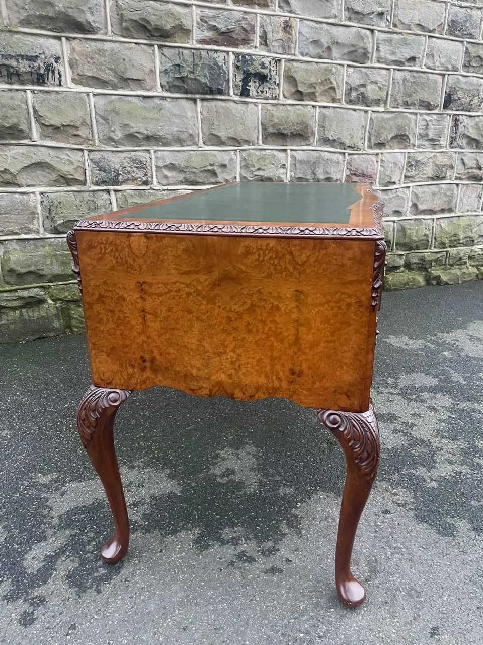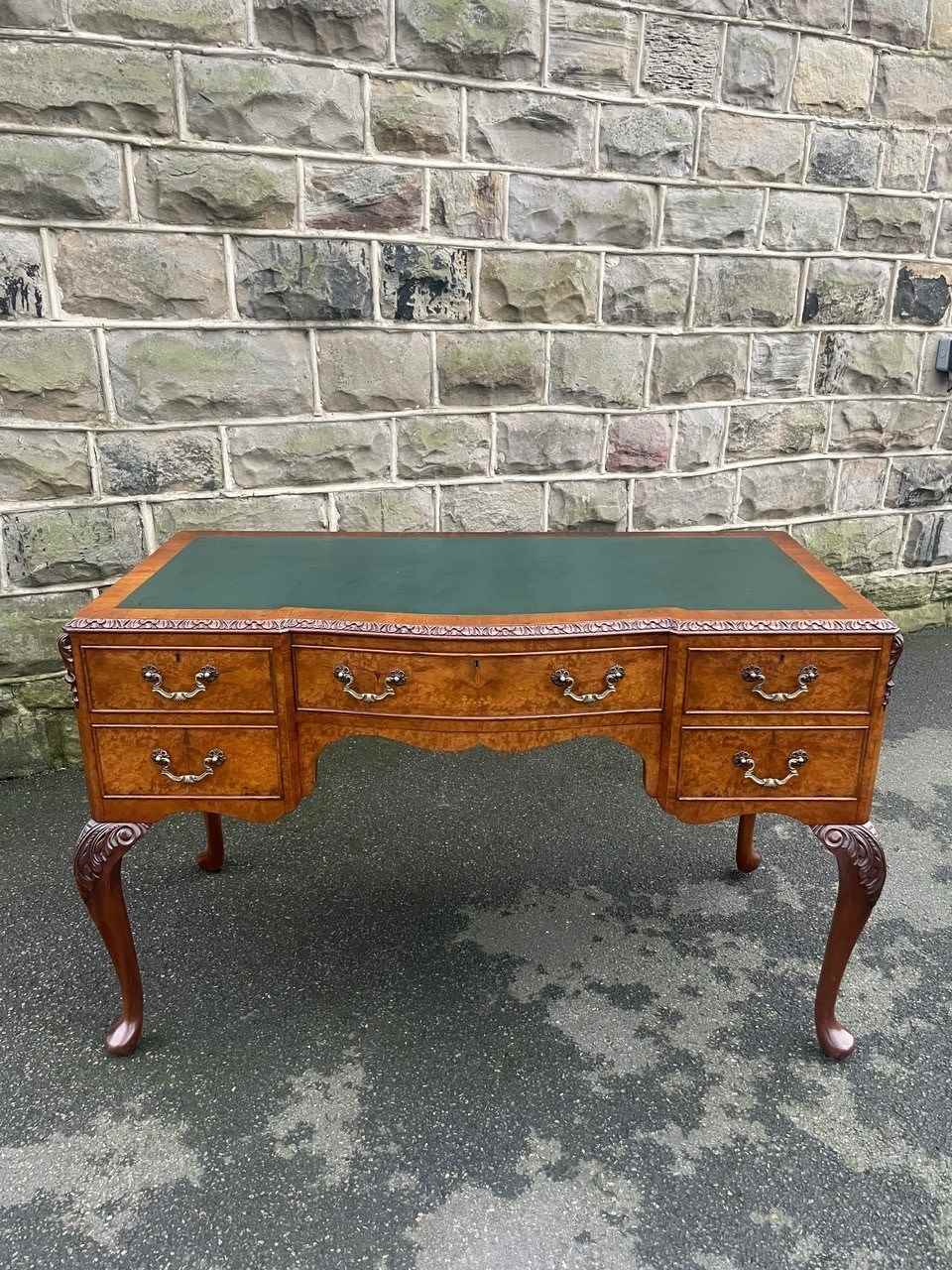 It’s a lovely rich burr walnut colour. Carved edge around the top. It has the original tooled green leather scribe, burr walnut veneered central draw with two draws either side with ornate brass drop handles. Locks to top 3 draws (no key). It has burr walnut sides standing on slender carved cabriole legs with carved scroll foot.