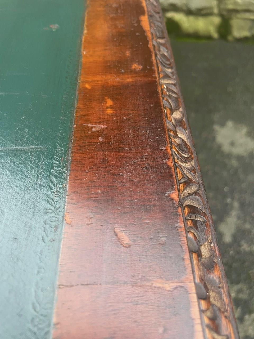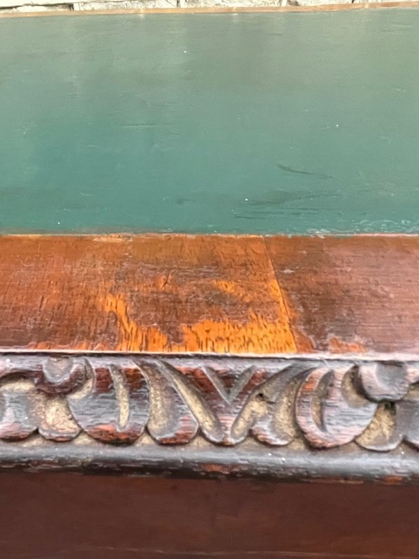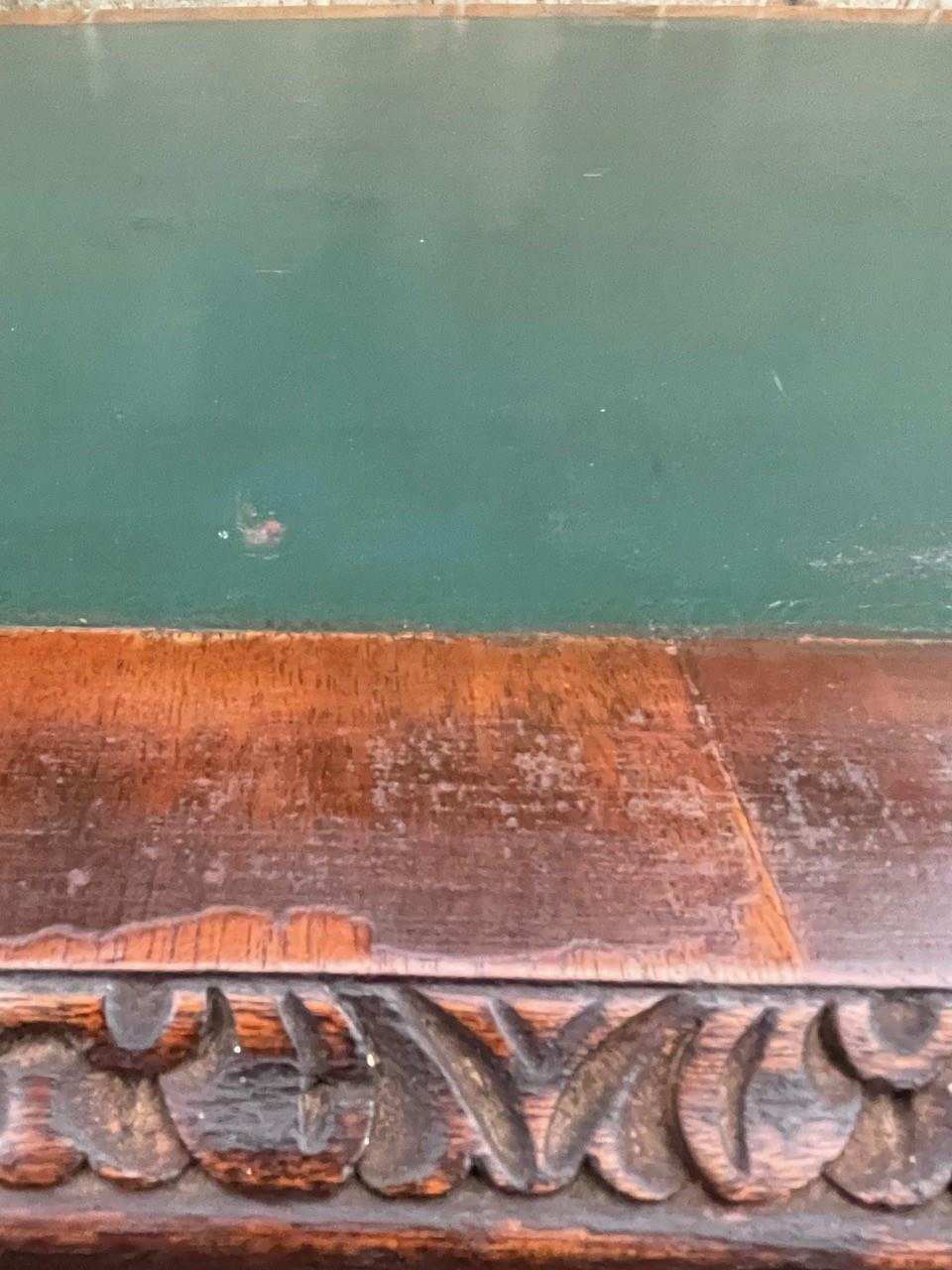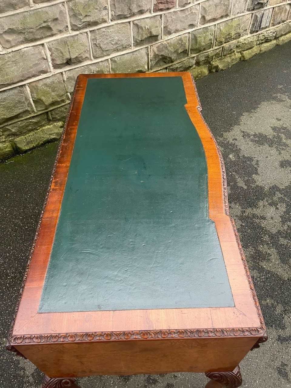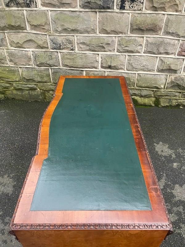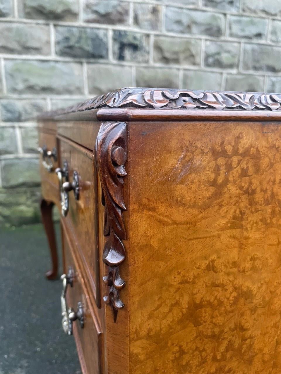 It’s a lovely rich burr walnut colour. Carved edge around the top. It has the original tooled green leather scribe, burr walnut veneered central draw with two draws either side with ornate brass drop handles. Locks to top 3 draws (no key). It has burr walnut sides standing on slender carved cabriole legs with carved scroll foot.
