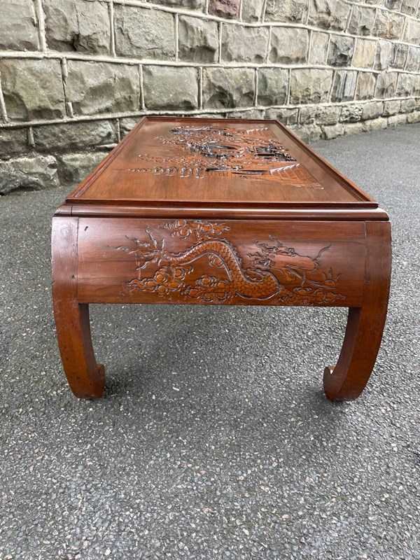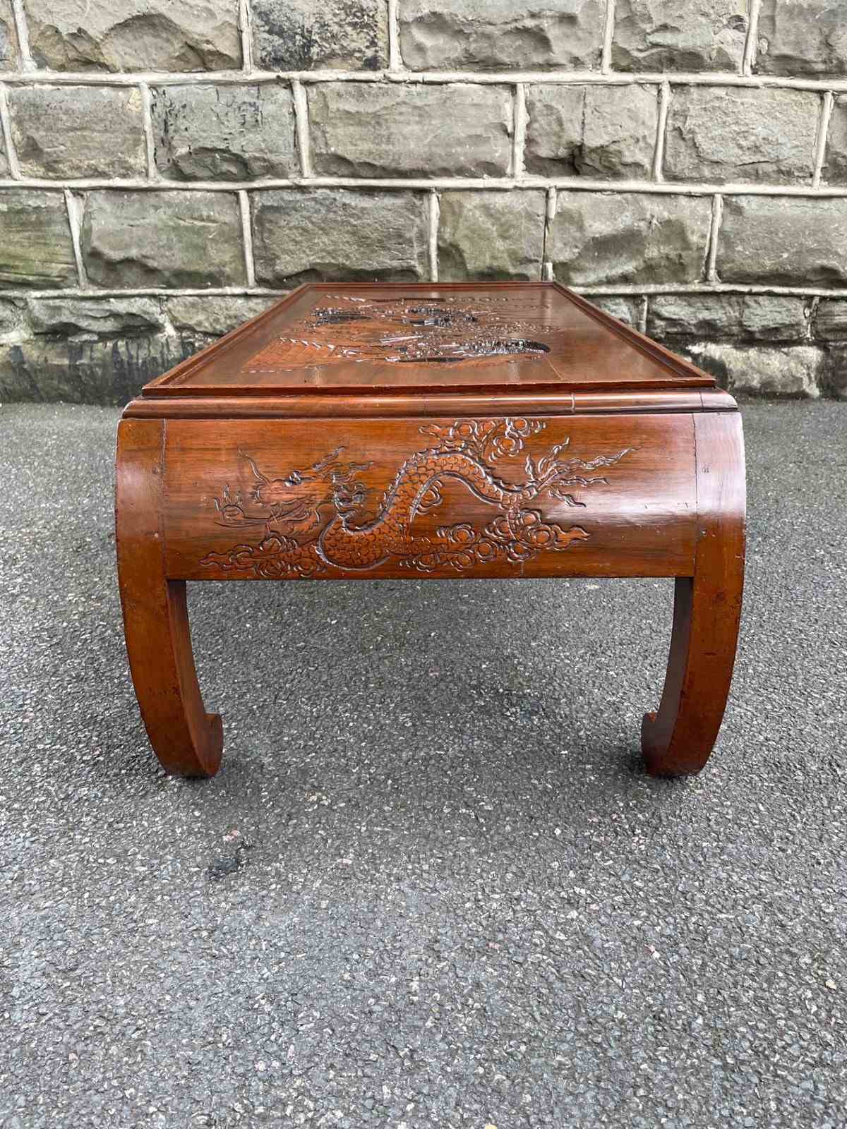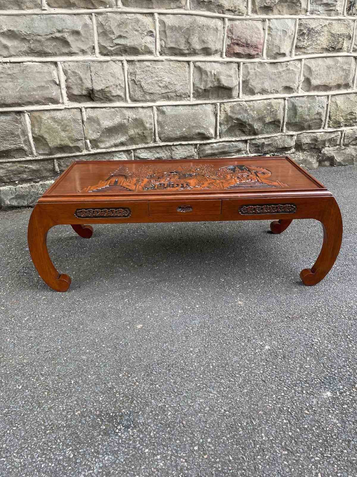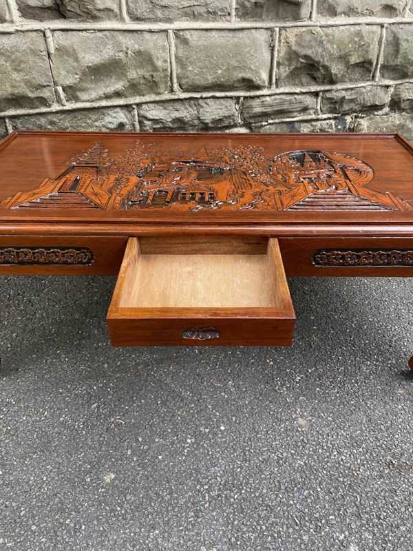 Made from Chinese native hardwood Ideal as a coffee table. Ornate carved top & frieze with curved scrolling legs, central draw.